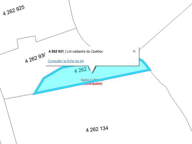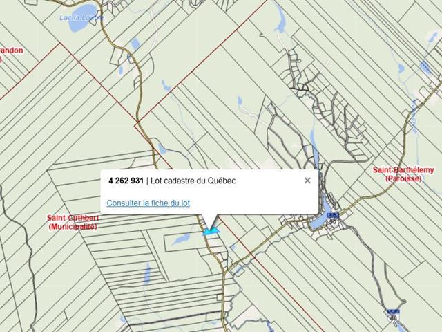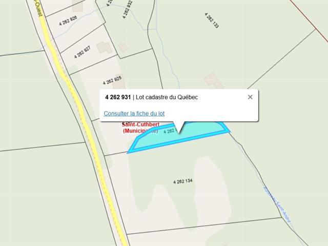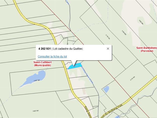 Terrain à vendre à Saint Cuthbert, 1 182,7 m² : terrain non bâti et non utilisé (hors sylviculture non commerciale), terrain résidentiel. Se renseigner auprès de la mairie concernant le règlement d'urbanisme. zone V7. Doit etre vendu avec mls 23979183. TPS/TVQ doivent être ajoutées au prix demandé (57624789)