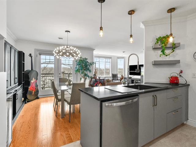 COUP DE COEUR À BELOEIL! Superbe condo clé en main dans une copropriété avec ascenseur, garage intérieur et stationnement extérieur. Aire ouverte baignée de lumière, foyer chaleureux et balcon avec vue spectaculaire sur le Richelieu et la montagne. Cuisine haut de gamme rénovée (45 000$) : armoires en polyester 2021, comptoir et dosseret en quartz, électroménagers récents à la cuisine inclus. Deux chambres dont une avec lit escamotable. Emplacement de choix, à pied de la marina et du Vieux-Beloeil. Impeccable, rare sur le marché ! (53408467)