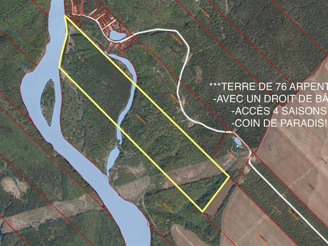 «TERRE À VENDRE à Sainte-Christine-d'Auvergne | Un vrai coin de PARADIS!» Situé au Domaine du lac des Fonds, accès par la rue de l'Ours! Ce grand lot boisé de 2.8 millions de pieds carrés (76 arpents) borné à l'eau possède un frontage de 925 pieds sur la rivière Sainte-Anne. Il vous offre une possibilité de bâtir une maison/domaine/ranch sur le lot près de la rivière sur une parcelle de 53 800pc (5000mc). L'électricité est rendu, il manque un ou deux poteaux si vous ne faites pas une entrée élec. souterraine. La terre est un territoire de chasse à faire des envieux dans votre entourage. Informez-vous! WOW LE SUPER SPOT, C'EST À VOIR! TPS/TVQ doivent être ajoutées au prix demandé (41334567)
