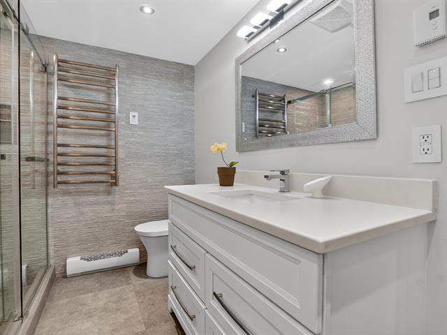 Impeccable condo de coin au dernier étage avec 3 chambres, baigné de lumière naturelle toute la journée--un espace idéal pour les familles recherchant de l'espace ou pour ceux qui réduisent la taille de leur logement sans renoncer aux chambres. Entièrement rénové avec soin, il comprend une salle de bain avec buanderie intégrée, meuble-lavabo en quartz et chauffe-serviettes, une cuisine avec comptoir en granite et plancher en céramique, et une salle à manger avec armoires encastrées. La chambre principale bénéficie d'un éclairage encastré, et les portes et planchers mis à jour ajoutent une touche moderne. (51455841)