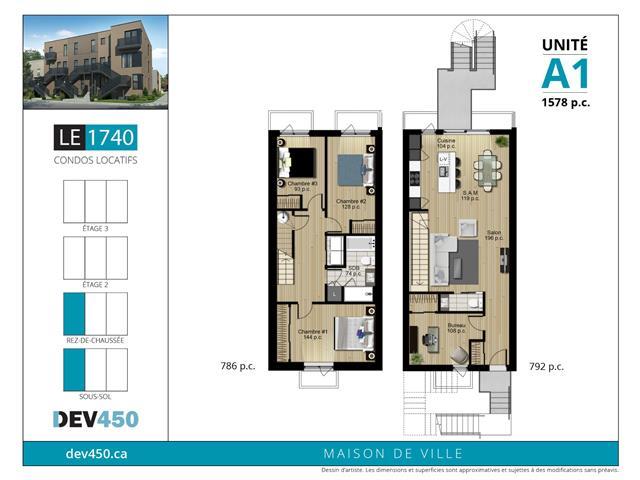 Situé au 1740, rue de Roberval, ce projet résidentiel de 9 unités locatives propose des logements spacieux, lumineux et soigneusement pensés pour répondre aux besoins de la vie urbaine moderne. Unité A1: appartement style maison de ville sur deux niveaux (rez-de-chaussée et sous-sol) avec 3 chambres à coucher sur le même niveau ainsi qu'un coin bureau. Une salle de bain et une salle d'eau. Petite cour arrière commune. Présentement en construction: soyez les premiers à y habiter dès le 1er juillet 2026! (46868259)