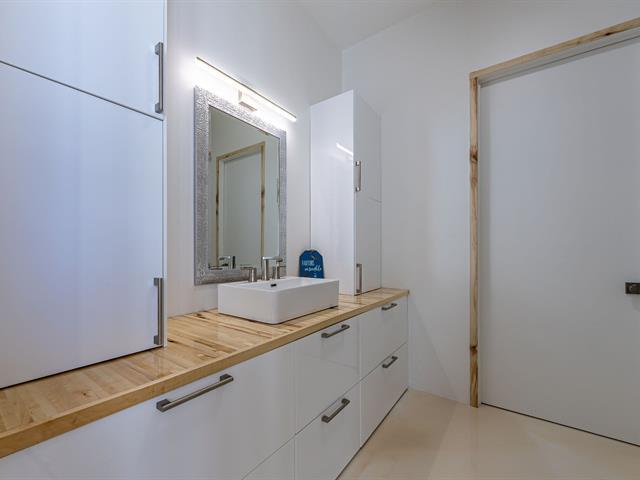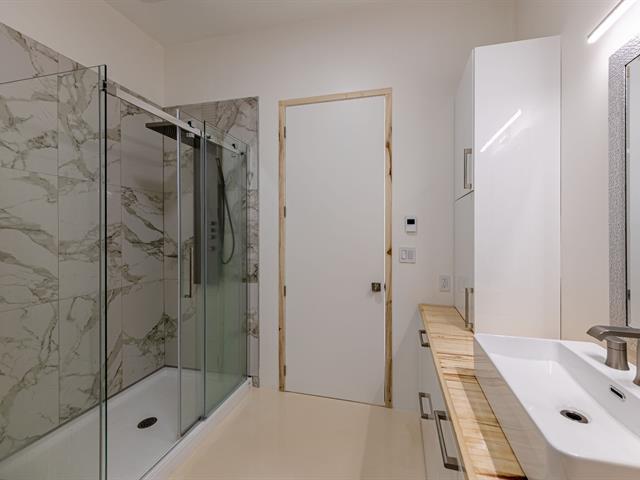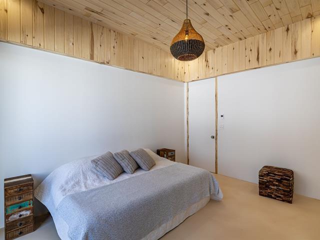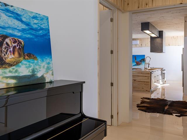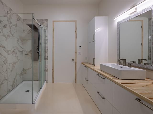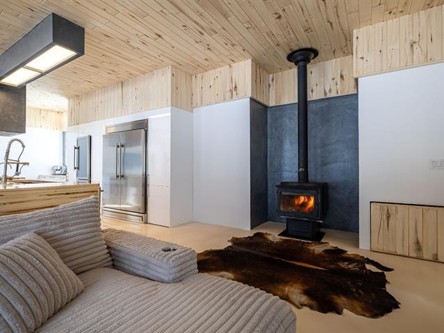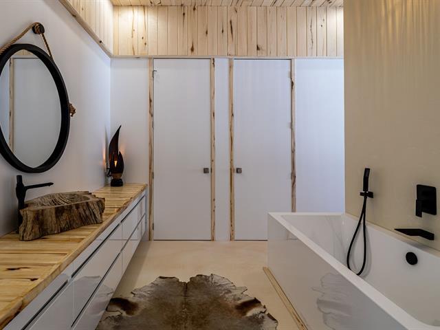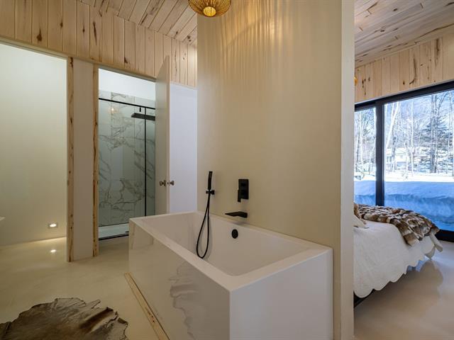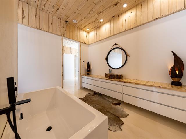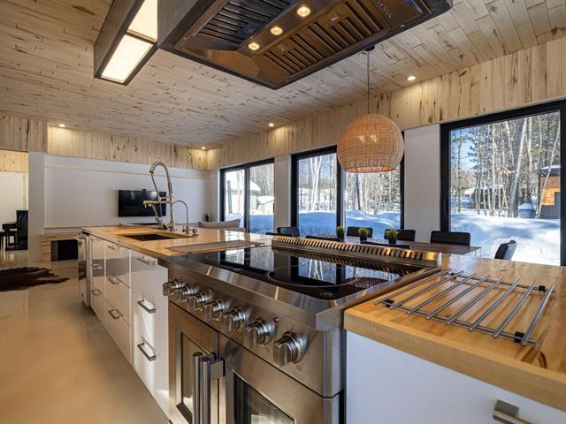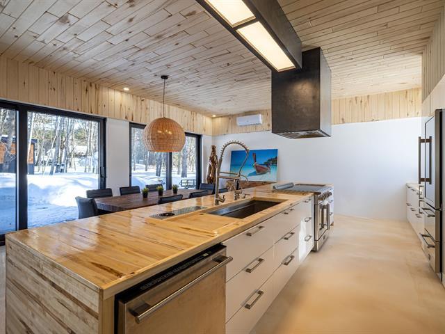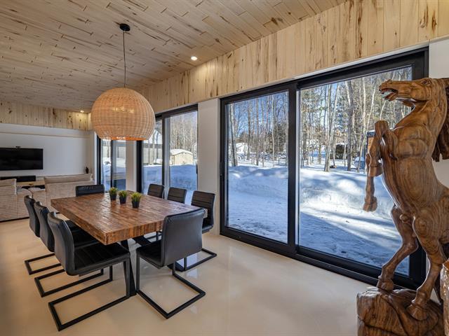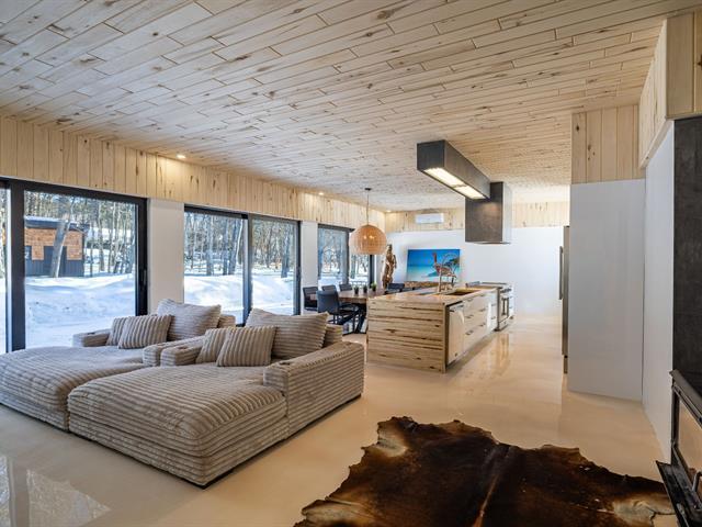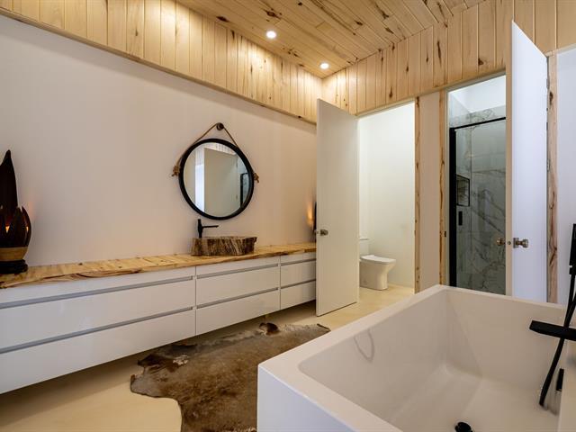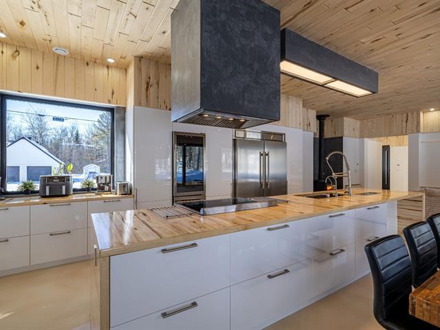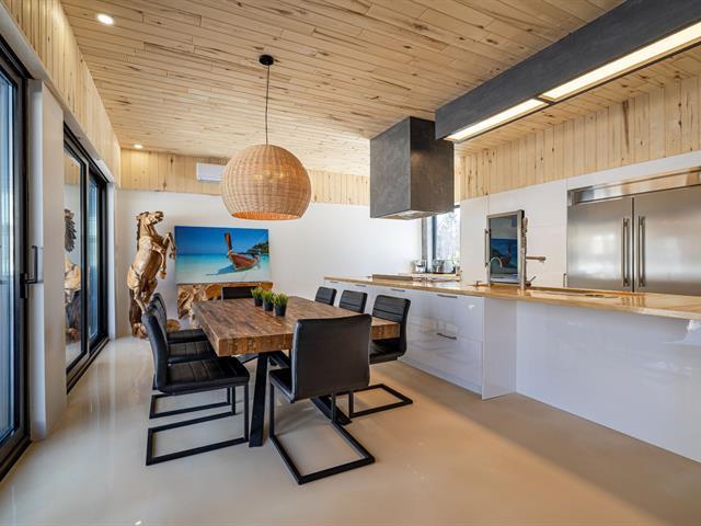 Cette propriété à conception supérieur se distingue par un souci extrême du détail et une luminosité omniprésente. L'espace impressionne par ses plafonds de 10 pieds en bois de tremble et ses sols en époxy blanc perle. La cuisine de chef épurée s'ouvre sur une aire de vie avec foyer. La suite des maîtres intègre deux walk-in ainsi qu'une baignoire et un point d'eau, complétés par une douche et un cabinet indépendants. À l'arrière, d'immenses parois vitrées fusionnent la nature au décor et s'ouvrent sur une terrasse et une piscine en béton chauffée. Une réalisation où chaque matériau a été sélectionné avec rigueur. (57054945)