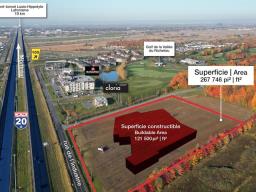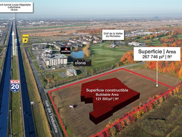 Industrial land of approximately 264,746 ft² (about 1,788' x 2,356' irregular), zoned I6, with building potential between 100,000 and 121,500 ft². All services are available (gas, sewage, water, electricity), and the site is ready for construction. Located near Highway 20, with an average daily traffic of 89,000 vehicles, the land offers excellent accessibility. Park taxes are paid, and subdivision is possible if needed. This land is a strong opportunity for large industrial projects in a well-served area. GST/QST must be added to the asking price (44664659)