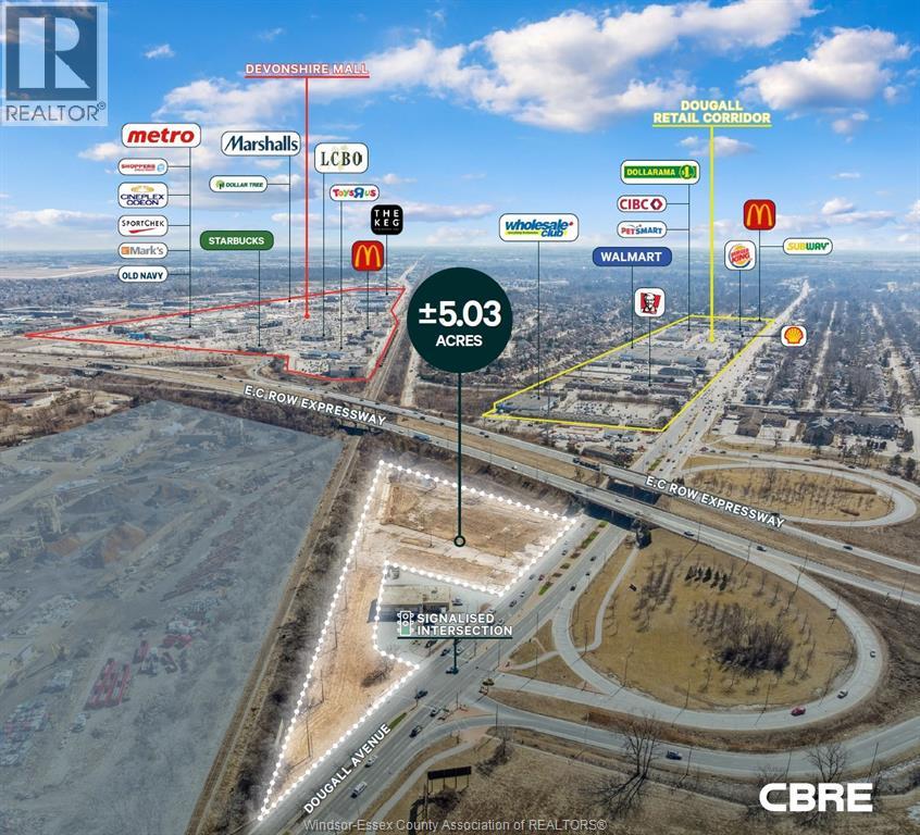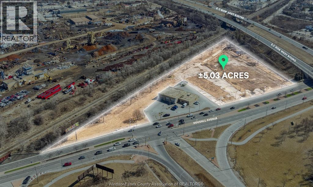 High exposure, centrally located land development site available for sale. This rare 5.03 acres site offers direct signalized intersection access to the EC Row Expressway and over 220 ft of frontage along Dougall Avenue. The Property offers one of the highest average daily traffic counts in the City with a combined AADT of over 70,000 between Dougall and the EC Row. Furthermore, the Property's easy access offers drive times of under 10 minutes to Downtown Windsor, Devonshire Mall, South Windsor, the Gordie Howe International Bridge and Highway 401. The site permits a wide variety of industrial and ancillary commercial/retail uses ranging from manufacturing, warehouse to retail, drive-thru, gas bar, office and medical uses. (53110230)