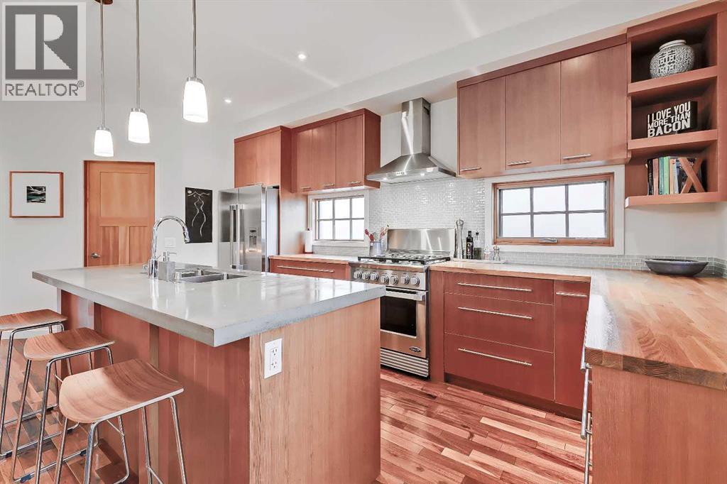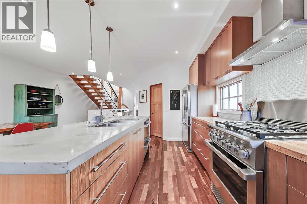 **OPEN HOUSE THIS WEEKEND: SATURDAY, JANUARY 17 AT 1 PM - 3 PM** Presenting CANMORE IN THE CITY: This stunning custom-built home in the heart of Parkdale is located ACROSS from GREENSPACE and offers a perfect blend of MODERN MOUNTAIN design and rare upgrades like an ATTACHED HEATED DOUBLE GARAGE and ICF CONCRETE PARTY WALL. This home was completely custom-built, with numerous unique, high-end features that you don't see in todays newly-built homes due to rising costs and supply challenges, like gorgeous ACACIA HARDWOOD flooring, SOLID FIR DOORS, an open riser SOLID WOOD AND GLASS STAIRCASE with SOLID TIMER supports (easily a $16,000+ upgrade at todays cost), and a stunning WOOD STUMP PEDESTAL in the powder room, handcrafted from one of the original trees on this homesite to bring a little history. Open and bright throughout, the main floor features an inviting living room with cozy gas fireplace, and rear kitchen and dining opening to the WEST-FACING upper deck with stained WOOD PERGOLA and railing. The upgraded chef’s kitchen impresses with a walk-in pantry, custom SITE-BUILT CABINETRY with birch drawers, sleek glass tile backsplash, and CONCRETE/BUTCHER BLOCK counters. Premium DCS PROFESSIONAL SERIES appliances by Fisher Paykal include a 5-burner gas range and dual drawer dishwasher. A large kitchen island offers bar seating for entertaining. Upstairs, 3 large bedrooms, 2 full baths, convenient laundry room, and HANDCRAFTED BARN DOOR features await. The generous primary suite has a walk-in closet, and a handcrafted barn door leading to a luxurious five-piece ensuite with DUAL SINKS, a FREESTANDING TUB, tiled glass STEAM SHOWER, and heated travertine tile floors. Fully developed lower level includes a recreation room with flex/gym space, 2-piece bath, and a tiled mudroom/foyer offering direct access to the HEATED ATTACHED DOUBLE GARAGE - an absolute dream in the cold winter months. Additional parking for 2 more vehicles can be found on the driveway, convenientl y roughed in for a snow-melt system. Despite its mountain vibes, this home is perfectly located just minutes from the Bow River Pathway, the Foothills and Childrens Hospital, and downtown. Numerous transit options, the park pathway system, and quick access to main arteries make commuting to work and the mountains a breeze. VIEW MULTIMEDIA LINK FOR FULL DETAILS! (31146018)