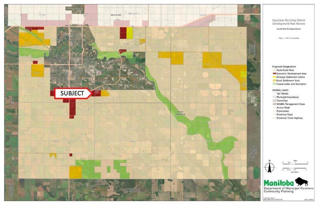 CSE//Brandon/36.41 acres of AG80 Agricultural General Zoned Land located on the outskirts of Brandon, which may offer future development potential. This land is currently designated as Economic Development area, in the Keystone Planning District's Development Plan Draft. The site has the potential to be developed with commercial or industrial properties. However, the city of Brandon would have influence on the allowable development, and may limit rural development without approved servicing. It is noted that the current use of the the site, until any settlement developments occur, if any occur at all, is for agricultural uses. Thorough buyer due diligence is strongly encouraged with all relevant governing bodies and professionals, including but not limited to: the City of Brandon/Community Planning Branch, Keystone Planning District, HMK, the Province of Manitoba, Manitoba Environment and Climate, Provincial Highways, depending on Buyers intentions. Seller has the preference to sell with MLS#202427389. Please note that the subdivision plan visible within the parcel in the photo is Crown-owned land and is not included in this sale. (231442632)