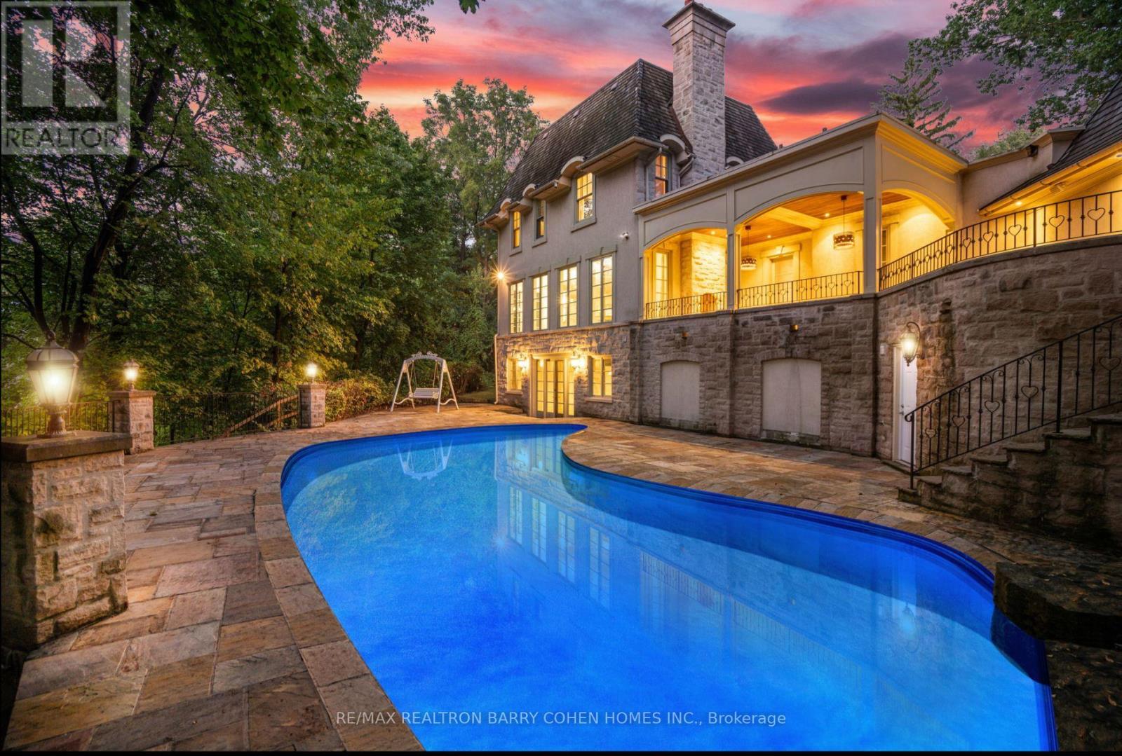 Backs Onto Ravine! Perched gracefully at the highest point of Hoggs Hollow, this French Château inspired masterpiece sits on a spectacular 239.08 x 207.81 ft ravine lot (approx. 1.14 acres). Designed by Dee Dee Taylor Hannah and built by award-winning builder Michael Rossini, this timeless stone estate offers over 10,000 sq.ft. of luxurious living space, blending European elegance with modern comfort. The homes distinctive curved and symmetrical design showcases architectural artistry rarely seen today. Featuring 4 bedrooms with ensuites, 9 washrooms, and a 3-car garage with a circular driveway accommodating up to 15 cars, all principal rooms face west, overlooking the serene ravine. A grand marble foyer, curved hallways, and custom millwork opens to elegant living and dining rooms that walk out to the ravine and garden. Two libraries on main floor, five fireplaces, built-in speakers, 10-ft ceilings, and hardwood floors throughout. The gourmet kitchen with double granite islands and an open-concept family room with motorized curtains creates a warm and inviting space for entertaining.Step out to a 700 sq.ft. patio with outdoor fireplace and panoramic ravine views. The primary suite features a lavish 9-piece ensuite, his & her walk-in closets, and heated bathroom floors. The walk-out lower level wth heated floors includes a home theatre, wine cellar, sauna, wet bar, nanny/guest ensuite, and a recreation room with fireplace opening directly to the backyard oasis.The heated concrete pool with cascading waterfall, framed by mature trees, creates a private, resort-like retreat. A rare offering combining elegance, privacy, and tranquility, just moments from the Granite Club, top private schools (Crescent, TFS, Havergal, UCC, BSS), fine dining, and Rosedale & Don Valley Golf Clubs.A true statement of taste, craftsmanship, and enduring luxury in one of Torontos most prestigious enclaves. (41376133)