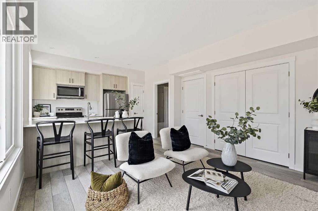 LIMITED TIME PROMOTION - Choose 2 of 3: | FREE A/C (SUPPLY & INSTALL) | 2 YEARS FREE CONDO FEES | $5,000 TOWARD WINDOW COVERINGS! Introducing the Meridian at Livingston by Brookfield Residential – where style meets convenience. This 1 bedroom, 1 bathroom townhome is perfect for first-time buyers or investors, offering a bright, open-concept layout with and upgraded finishes throughout. The ‘Coltrane’ model features a sleek kitchen with quartz countertops, stainless steel appliances, full-height cabinetry, a pantry, and a spacious peninsula island with seating. The south-facing windows fill the living and dining areas with natural light, creating a warm and inviting atmosphere all day long. The generous primary bedroom includes a large closet and patio views, while a 4-piece bath, in-suite laundry, and extra storage add everyday practicality. Complete with a titled parking stall, this home is set in Livingston, a vibrant new community with parks, playgrounds, a dog park, the HOA facility (Livingston Hub), and convenient access to major routes. Don’t miss the chance to own a brand new low-maintenance home with incredible value in one of Calgary’s most exciting new neighbourhoods. Builder warranty and Alberta New Home Warranty are included - allowing you to purchase with peace of mind. **Please note: photos are of a staged home and exact finishes will vary. (31206523)