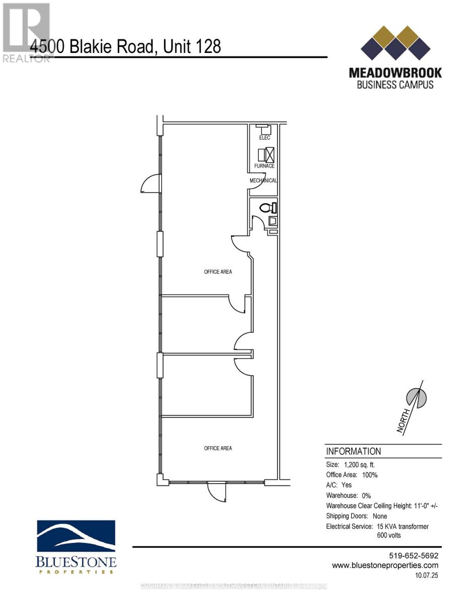 Meadowbrook Business Campus - West. South London's premier industrial and office facility. Minutes to 401 ramp, professionally managed property with units from 1,200 SF and up. 4500 Blakie Rd - Unit 128 is 1,200 SF. $12.00 Net with $0.50 annual escalation + $6.50 Additional rent (2026). The unit is 100% office with 2 private offices, reception and open office area. 11'+ clear height. Zoned LI 1, 2, 3, 4 & 7 permitting office uses, clinics, medical/dental office, wholesaling, warehousing, support office, labs, manufacturing and assembly, commercial recreational, assembly hall, custom workshop and many more. (41426609)