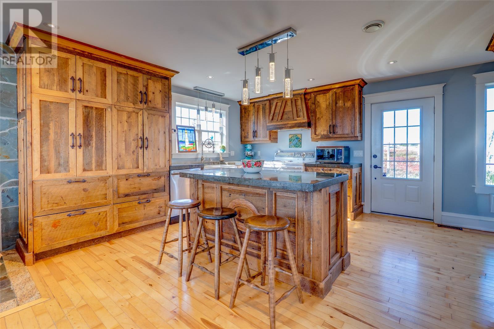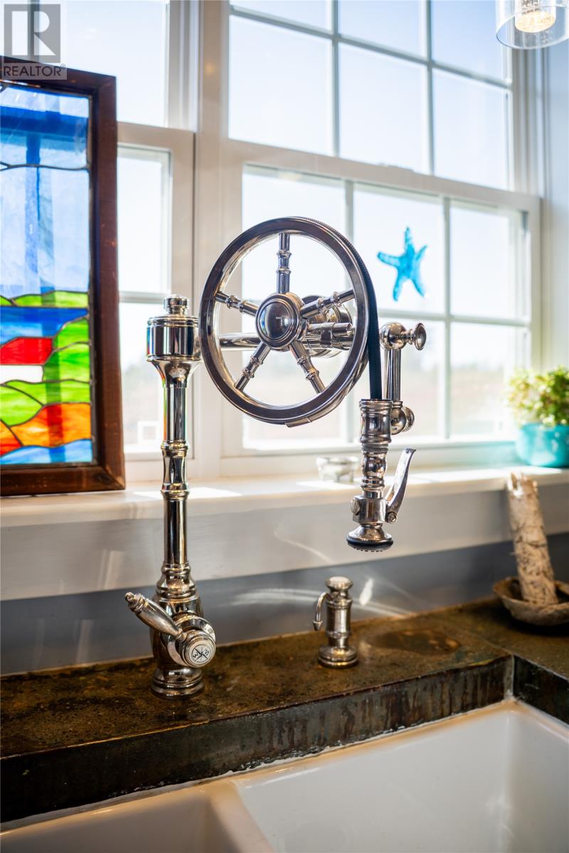 Perched on 8.26 private acres overlooking the Atlantic, this one-of-a-kind lighthouse-inspired home in Bishop’s Cove is a true masterpiece of craftsmanship and design. Featuring three bedrooms and one and a half baths, the home offers panoramic 360-degree ocean views from the top-floor wraparound deck that will take your breath away. Every element has been hand-selected and thoughtfully crafted, from the kitchen cabinetry built with reclaimed century-old wood and imported Italian faucets to the WETT-certified Kitchen Queen wood stove surrounded by locally quarried stone. The living room features a fireplace framed with Bell Island stone and a hand-hewn barn beam mantle from Ontario, mounted with custom ironwork by a local blacksmith. The main level includes a spacious kitchen and dining area, cozy living room, laundry, and powder room. The second floor offers two bedrooms, a large bath with a soaker tub, and a unique antique Singer sewing machine vanity. The third floor serves as a lighthouse tower bedroom with a wraparound deck showcasing breathtaking ocean vistas. The property also features a massive two-level wired garage and land rich with wild blueberries in the fall. A rare blend of artistry, privacy, and coastal beauty—this home is truly one of a kind. (30269060)