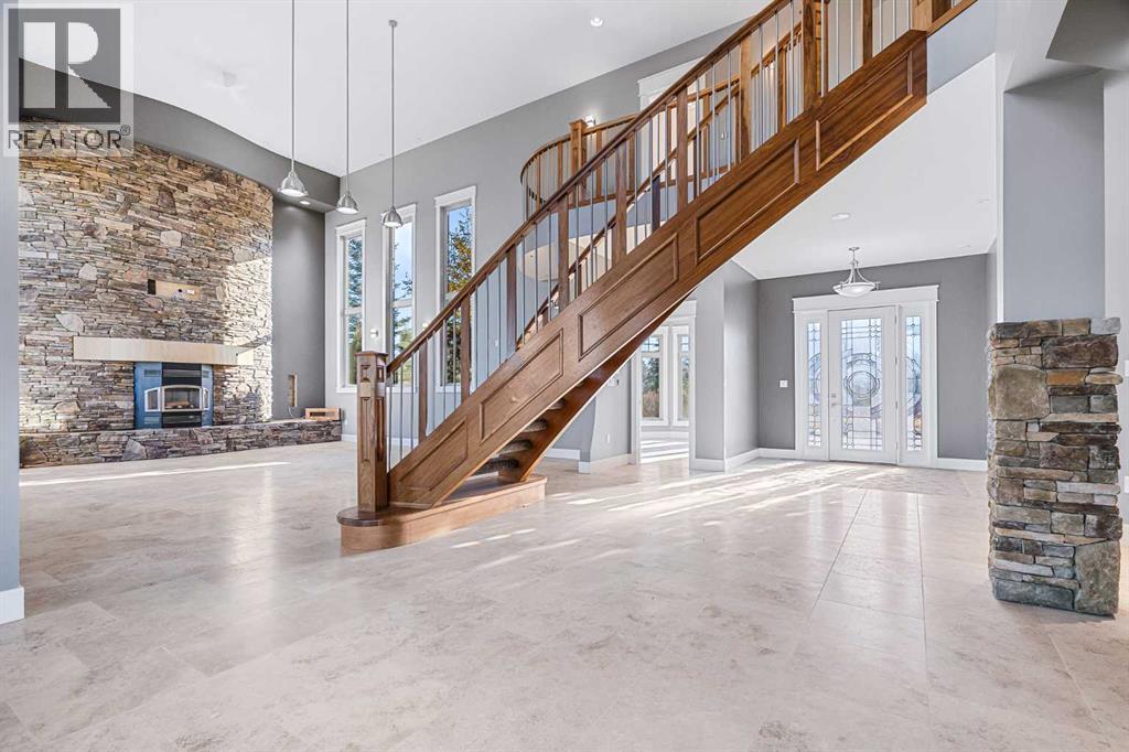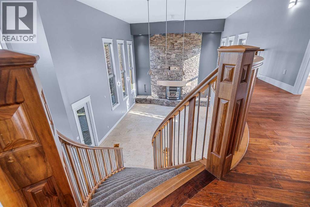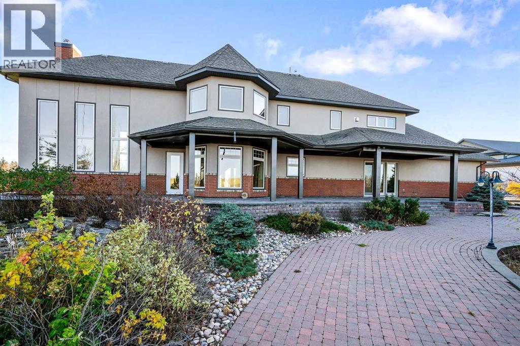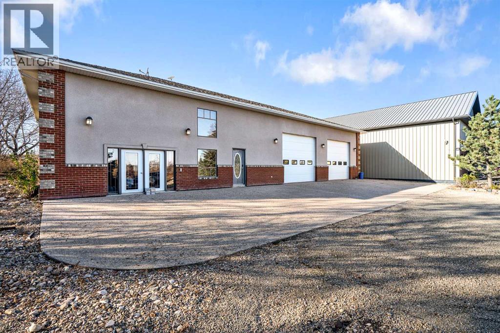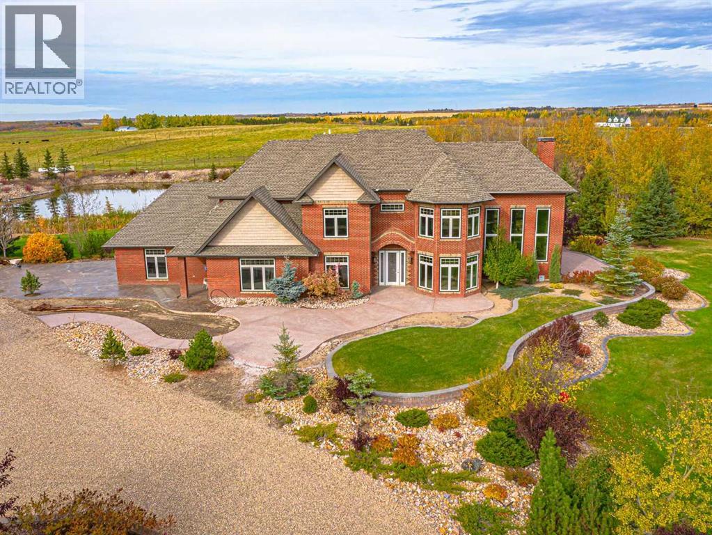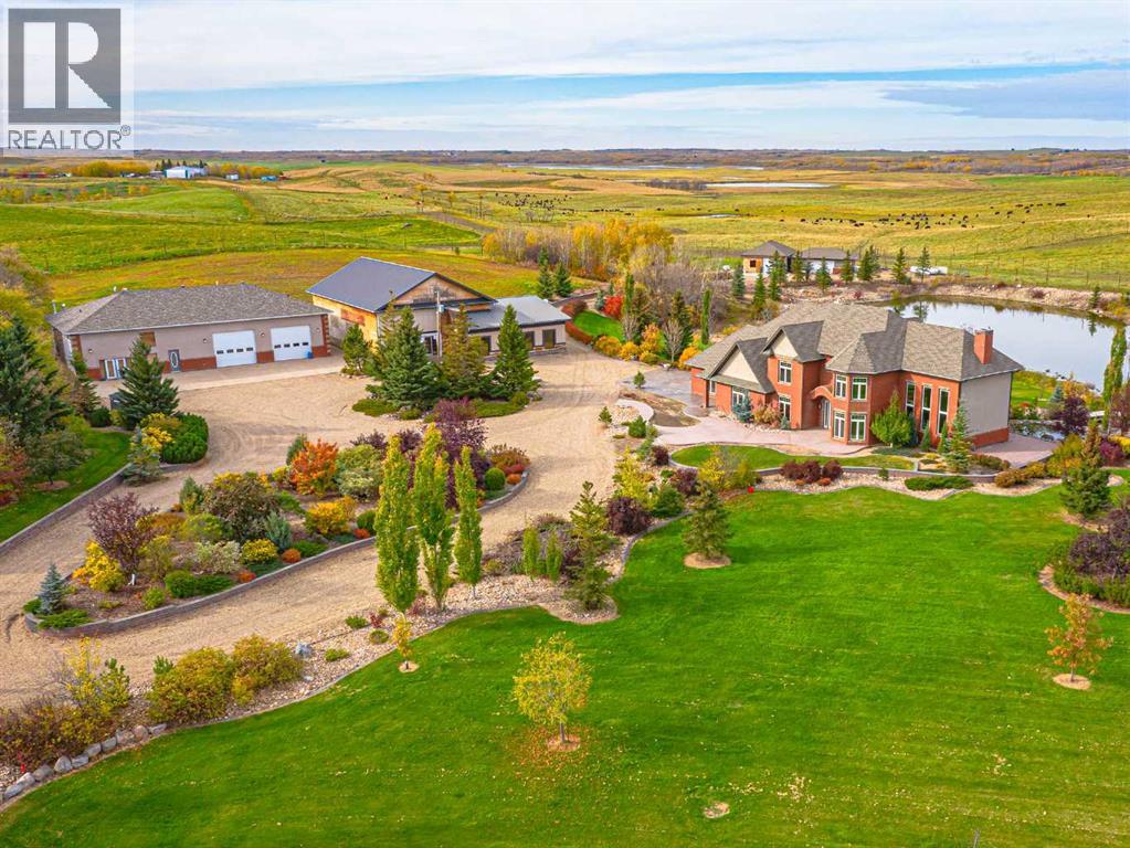 Welcome to a hidden gem that’s as expansive as it is enchanting—a rare rural retreat that invites you to live in harmony with nature. With an idyllic private lagoon, and professionally landscaped including underground sprinklers, this property is a sanctuary of both luxury and rustic charm. Perfect for the discerning buyer who values space, privacy, and an unmatched lifestyle, this estate offers a wealth of features, from expansive shops to state-of-the-art living quarters and storage facilities, all set within an unforgettable landscape. At the heart of this retreat stands a striking, 3,955 sq ft home, inviting you in through grand double doors. Step into the breathtaking two-story living room, where a majestic wood-burning fireplace with floor-to-ceiling stonework anchors the space. Natural light floods through oversized windows that frame views of the peaceful landscape, creating a seamless blend of the indoors and out. Imagine cozy evenings by the fire, with the warmth of crackling wood and the soft glow from stone surfaces illuminating the room, the main floor also has in floor heat for maximum warmth in those cold winter months. Flowing naturally from the living area is a modern yet inviting kitchen, designed to be both functional and stunning. A sleek 18-foot quartz island, encased in stone, stretches across the room—perfect for casual breakfasts, social gatherings, or simply savoring a quiet cup of coffee. The kitchen features top-of-the-line appliances, including a wall oven and countertop cooktop, catering to all your culinary needs. Adjacent to the kitchen, an intimate dining area captures 360-degree views of the surrounding property, transforming each meal into a memorable experience. Also on the main level, you’ll find a private office, ideal for working remotely, as well as a powder room, bedroom and a well-equipped mechanical room to meet your practical needs.The grand staircase, a centerpiece in its own right, sweeps you to the second floor, where tr anquil spaces await. The primary suite is a true retreat, featuring a two-way fireplace that creates ambiance between the bedroom and the luxurious ensuite. Indulge in the freestanding tub, unwind in the spacious, tiled shower, or prepare for the day at the large vanity. A walk-in closet completes this space, offering generous room for a curated wardrobe. Down the hall, two additional bedrooms share a well-appointed bathroom, providing comfort and privacy for family or guests. For added convenience, the laundry room is located upstairs, ensuring day-to-day chores are effortless. The remainder of the property includes 2 large shops, equipped with living quarters suitable for guests, dedicated gym area and lots of versatile space. There are also 2 additional spaces for storage. This estate offers something for every lifestyle. It’s more than just a place to; it’s an experience. (31243956)