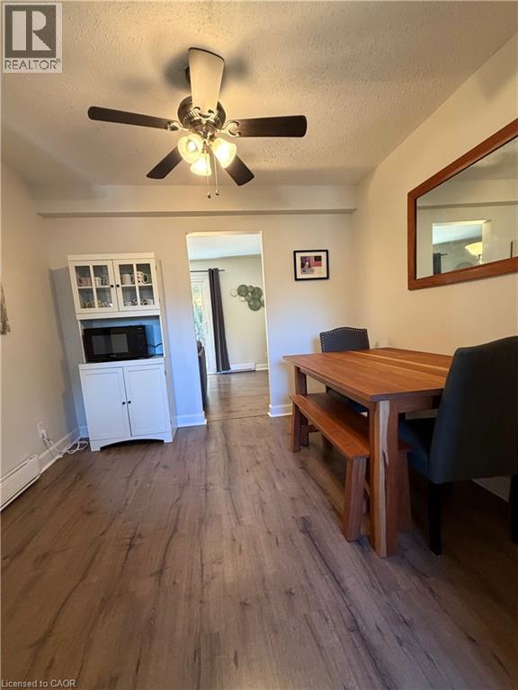 Dining room featuring a textured ceiling, dark wood-style flooring, baseboard heating, and ceiling fan
