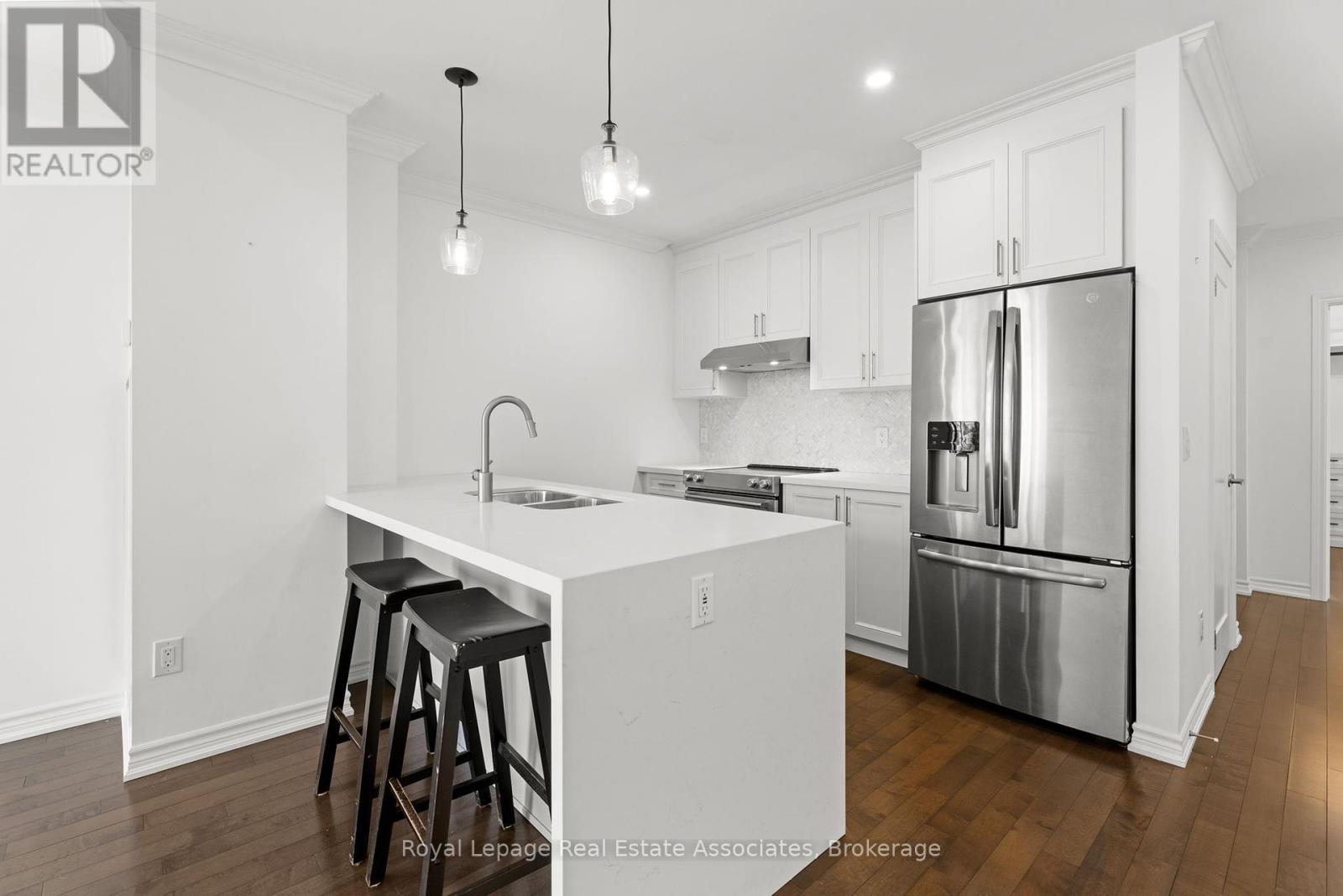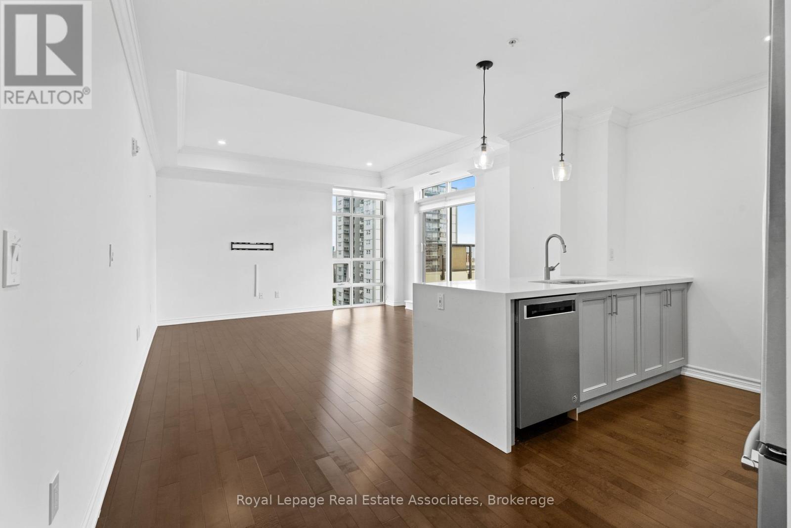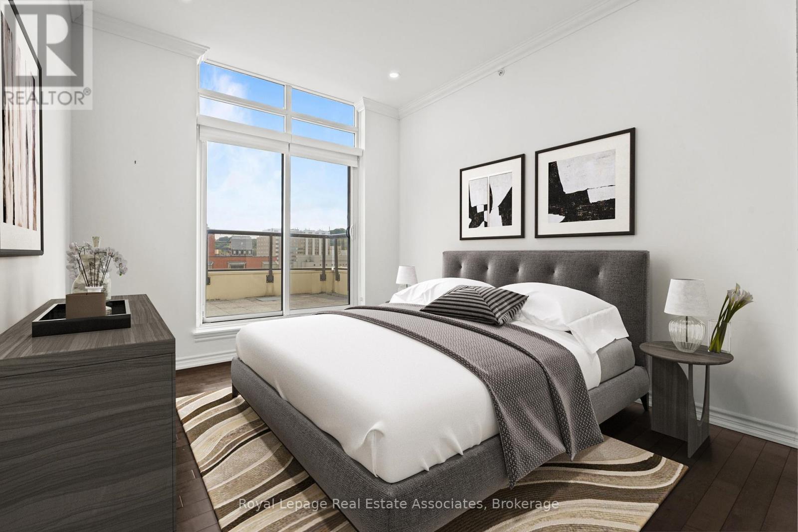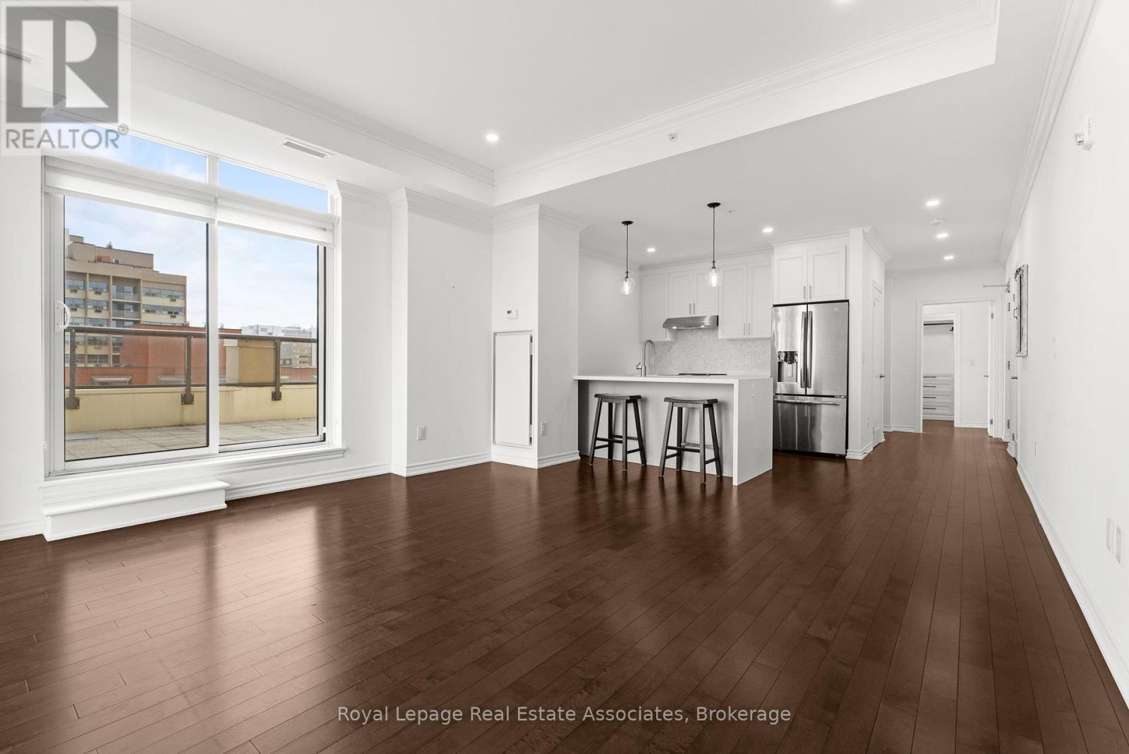 Discover upscale urban luxury in this exceptional penthouse at City Square residences. Flooded with natural light from floor-to-ceiling windows and warmed by maple hardwood floors, the open-concept kitchen features stainless steel appliances and in-suite laundry. The primary suite offers a custom walk-in closet, while your private 450 sq ft terrace accessible from the living area and bedroom boasts panoramic city skyline views, perfect for entertaining. Enjoy geothermal heating and cooling for year-round comfort. In the heart of vibrant Durand, walk to shops, restaurants, parks, hospitals, and GO Transit. Amenities include two gyms, media room, hospitality space, and bike storageplus two prime parking spots included in the lease. Tenant pays hydro & internet. (41455693)