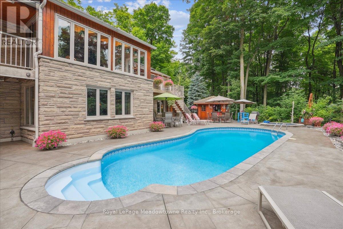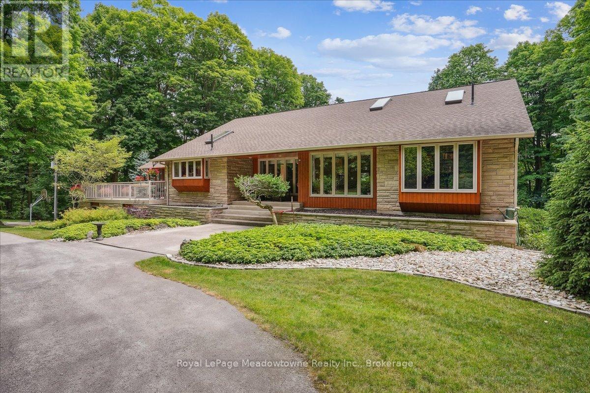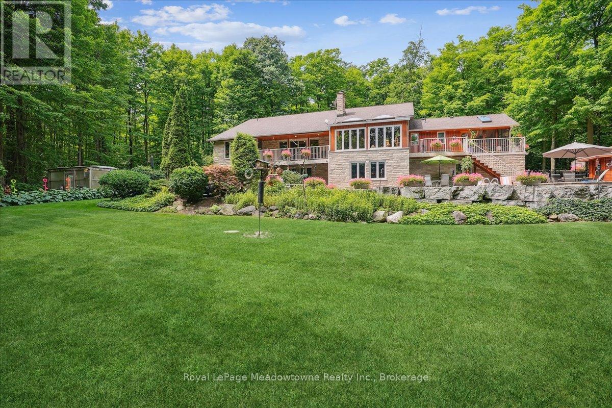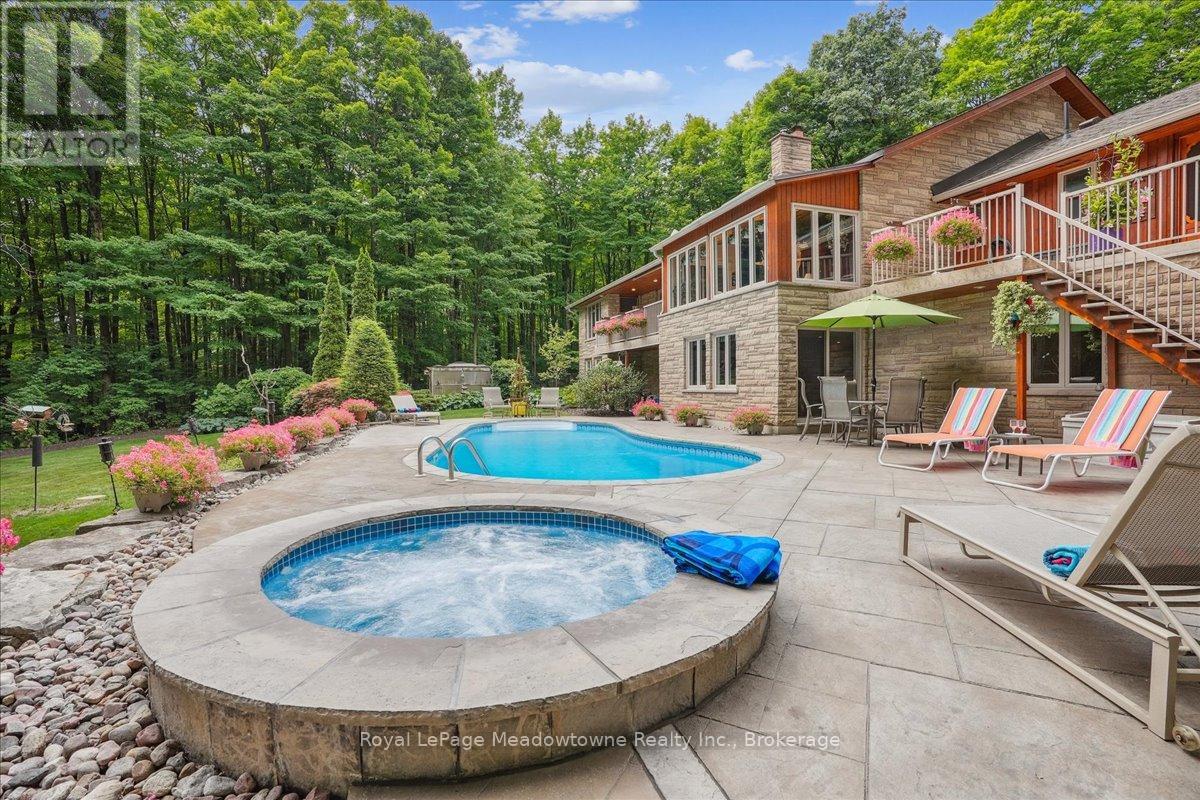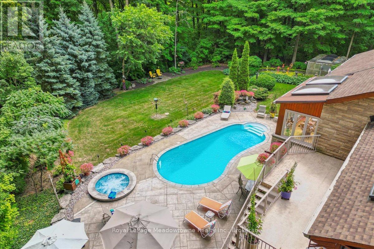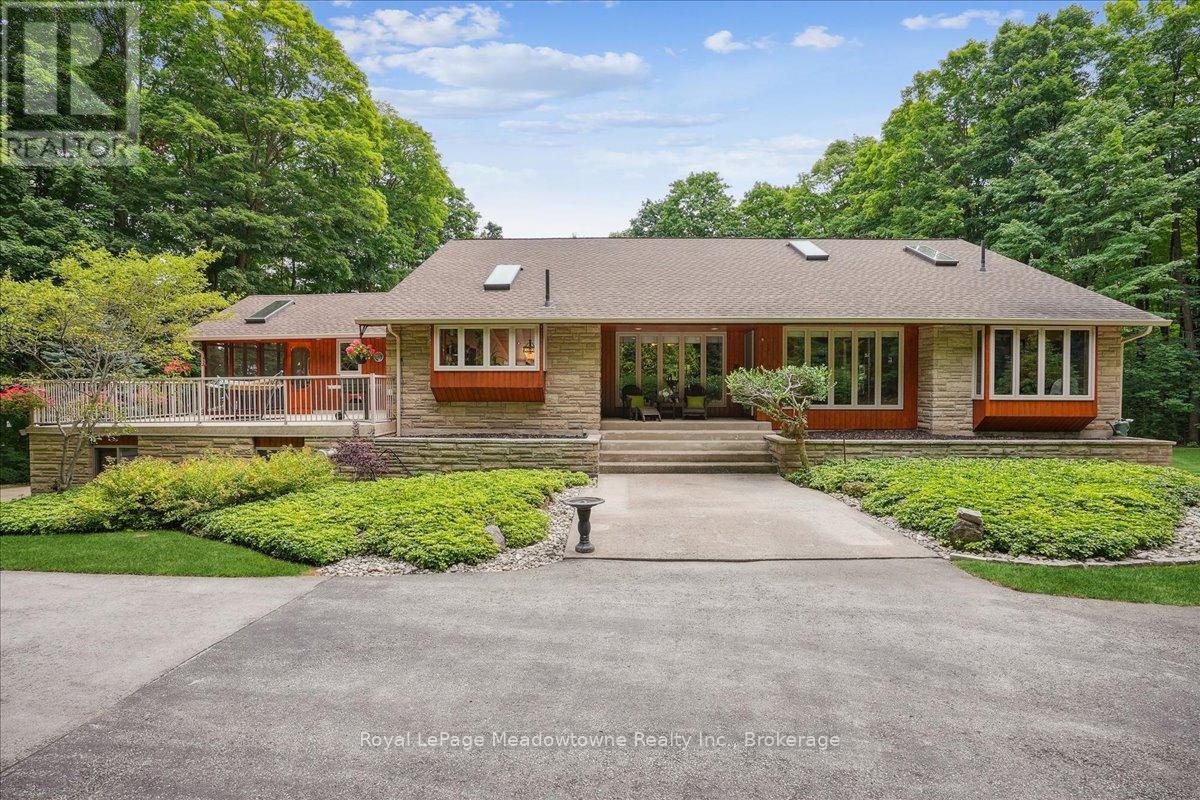Discover an unparalleled gem rarely available on the market: a private and serene estate with a custom-designed home that fulfills every dream. Set on over 10 lush acres amidst the stunning Niagara Escarpment, this meticulously cared-for property is just minutes from the 401 and downtown Milton. Surrounded by vibrant perennial gardens and towering mature trees, this home is perfectly positioned in the heart of Halton Conservation's premier parks. You'll be just moments from Kelso Conservation Area, Rattlesnake Point, Crawford Lake, Hilton Falls, and the Bruce Trail ideal for outdoor enthusiasts and nature lovers. The custom-built bungalow features over 6,000 sq. ft. of exquisite living space. Its open-concept design showcases vaulted ceilings, a double-sided stone fireplace, a spacious kitchen with pine cabinets, granite countertops, and an island. A convenient wet bar, elegant dining room, and a fantastic outdoor screen room offers the perfect space for 3-season entertaining. Enjoy stunning views from walkout decks off the kitchen, screen room, sun room, and master bedroom balcony. The lower level is a haven of relaxation and recreation. You will find a large recreation room with a cozy wood-burning stove, a games room, four additional bedrooms, and access to a three-car garage. Walk out to a luxurious inground pool with a hot tub, cabana, and a soothing water feature. The home is equipped with a 400-amp electrical service, a propane-powered generator, and a geothermal heating and cooling system. A separate two-car garage provides the ideal "Man Cave" and additional storage for garden equipment. Garden enthusiasts will love the large greenhouse/potting shed, and the property boasts a fire pit with a patio area, night landscape lighting, and over one kilometer of meticulously groomed walking trails. Why settle for a cottage when you can have this dream home without the drive? Experience the ultimate in luxury and tranquility this is truly what dreams are made of! (41462073)