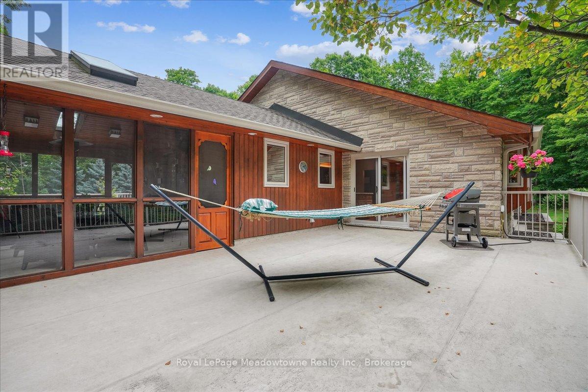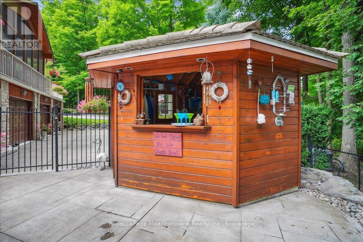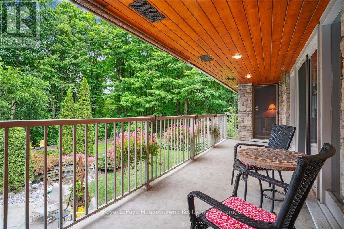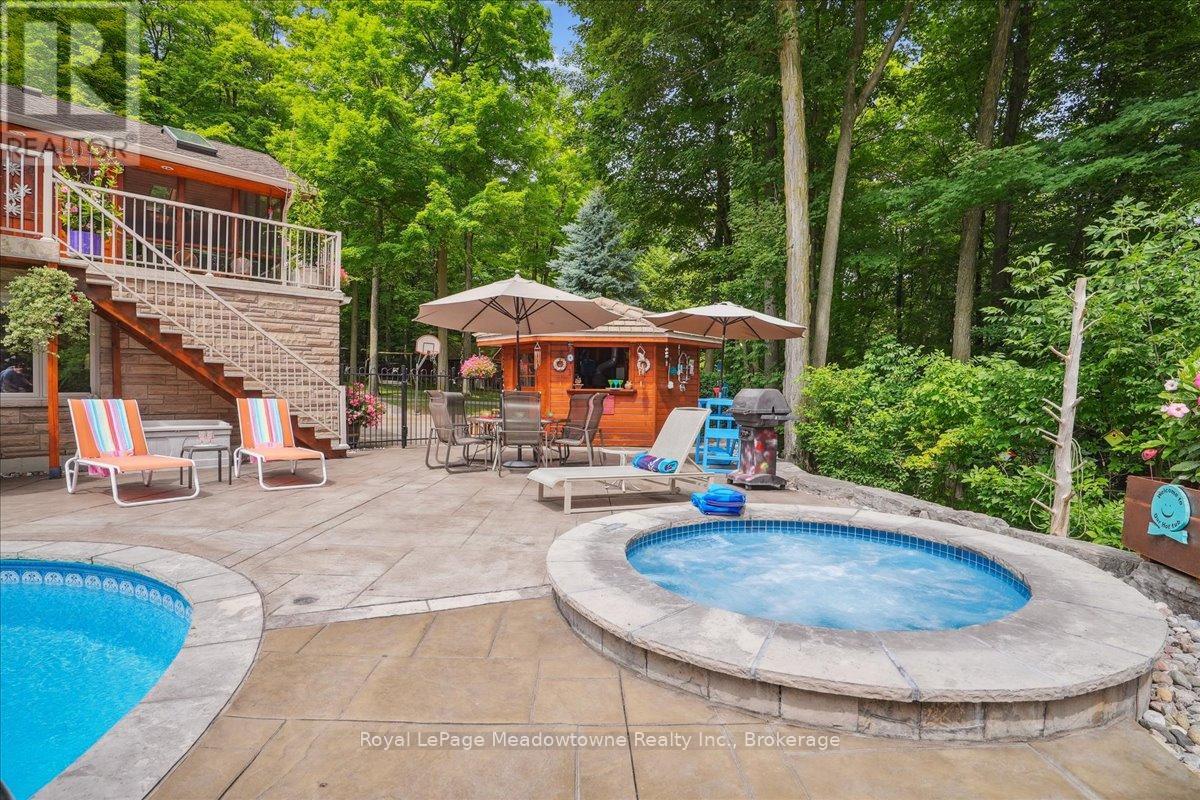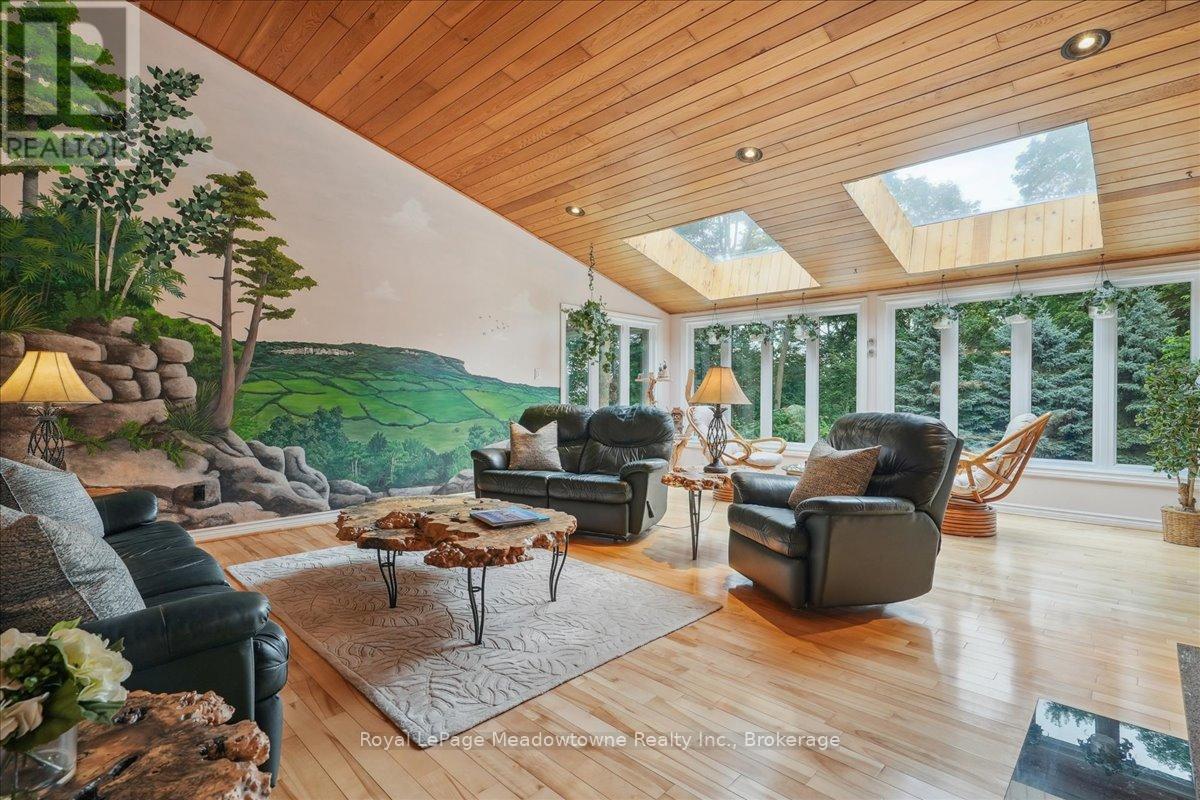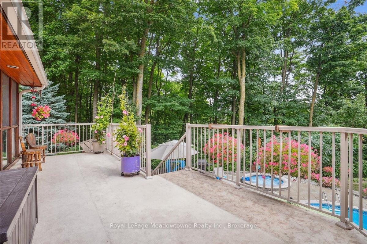 Discover an unparalleled gem rarely available on the market: a private and serene estate with a custom-designed home that fulfills every dream. Set on over 10 lush acres amidst the stunning Niagara Escarpment, this meticulously cared-for property is just minutes from the 401 and downtown Milton. Surrounded by vibrant perennial gardens and towering mature trees, this home is perfectly positioned in the heart of Halton Conservation's premier parks. You'll be just moments from Kelso Conservation Area, Rattlesnake Point, Crawford Lake, Hilton Falls, and the Bruce Trail ideal for outdoor enthusiasts and nature lovers. The custom-built bungalow features over 6,000 sq. ft. of exquisite living space. Its open-concept design showcases vaulted ceilings, a double-sided stone fireplace, a spacious kitchen with pine cabinets, granite countertops, and an island. A convenient wet bar, elegant dining room, and a fantastic outdoor screen room offers the perfect space for 3-season entertaining. Enjoy stunning views from walkout decks off the kitchen, screen room, sun room, and master bedroom balcony. The lower level is a haven of relaxation and recreation. You will find a large recreation room with a cozy wood-burning stove, a games room, four additional bedrooms, and access to a three-car garage. Walk out to a luxurious inground pool with a hot tub, cabana, and a soothing water feature. The home is equipped with a 400-amp electrical service, a propane-powered generator, and a geothermal heating and cooling system. A separate two-car garage provides the ideal "Man Cave" and additional storage for garden equipment. Garden enthusiasts will love the large greenhouse/potting shed, and the property boasts a fire pit with a patio area, night landscape lighting, and over one kilometer of meticulously groomed walking trails. Why settle for a cottage when you can have this dream home without the drive? Experience the ultimate in luxury and tranquility this is truly what dreams are made of! (41462073)