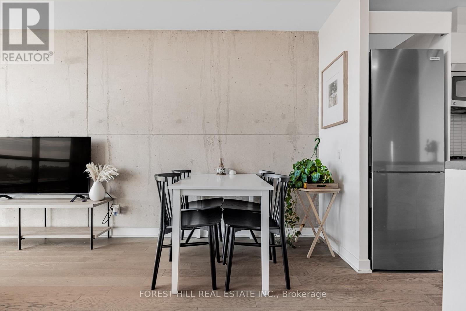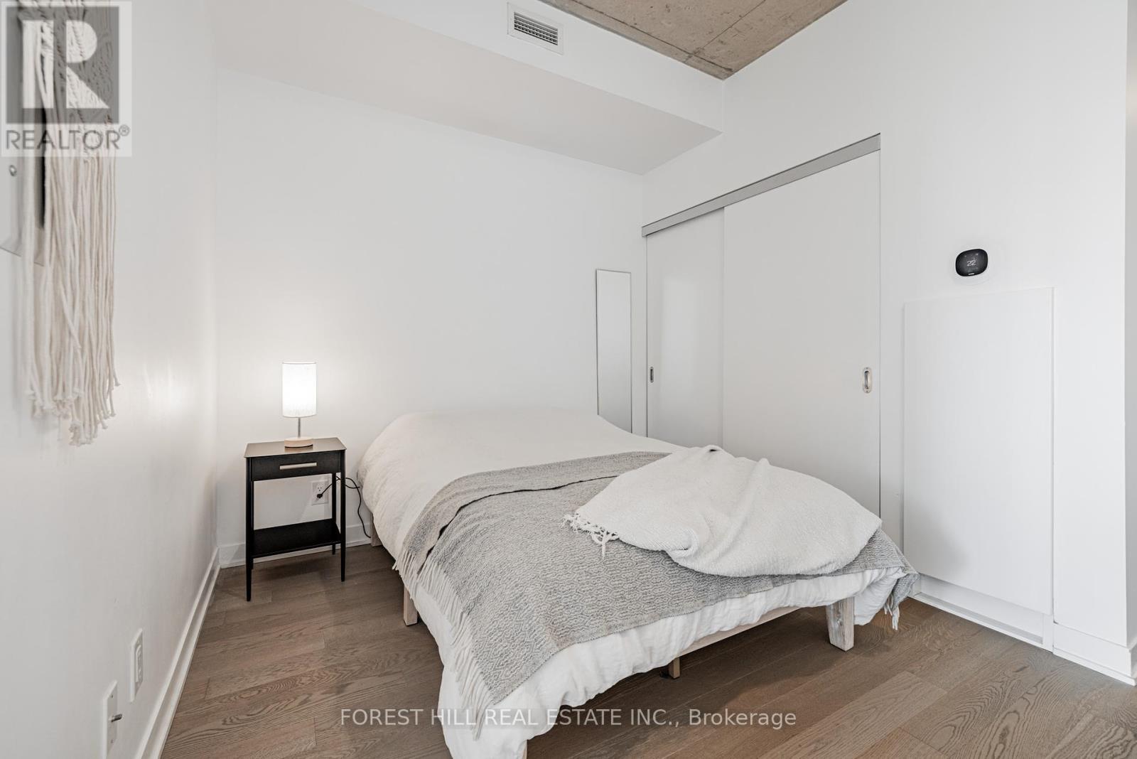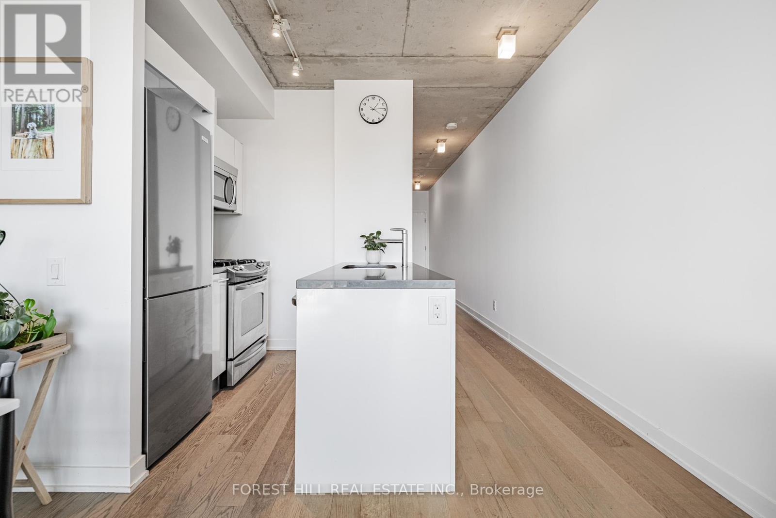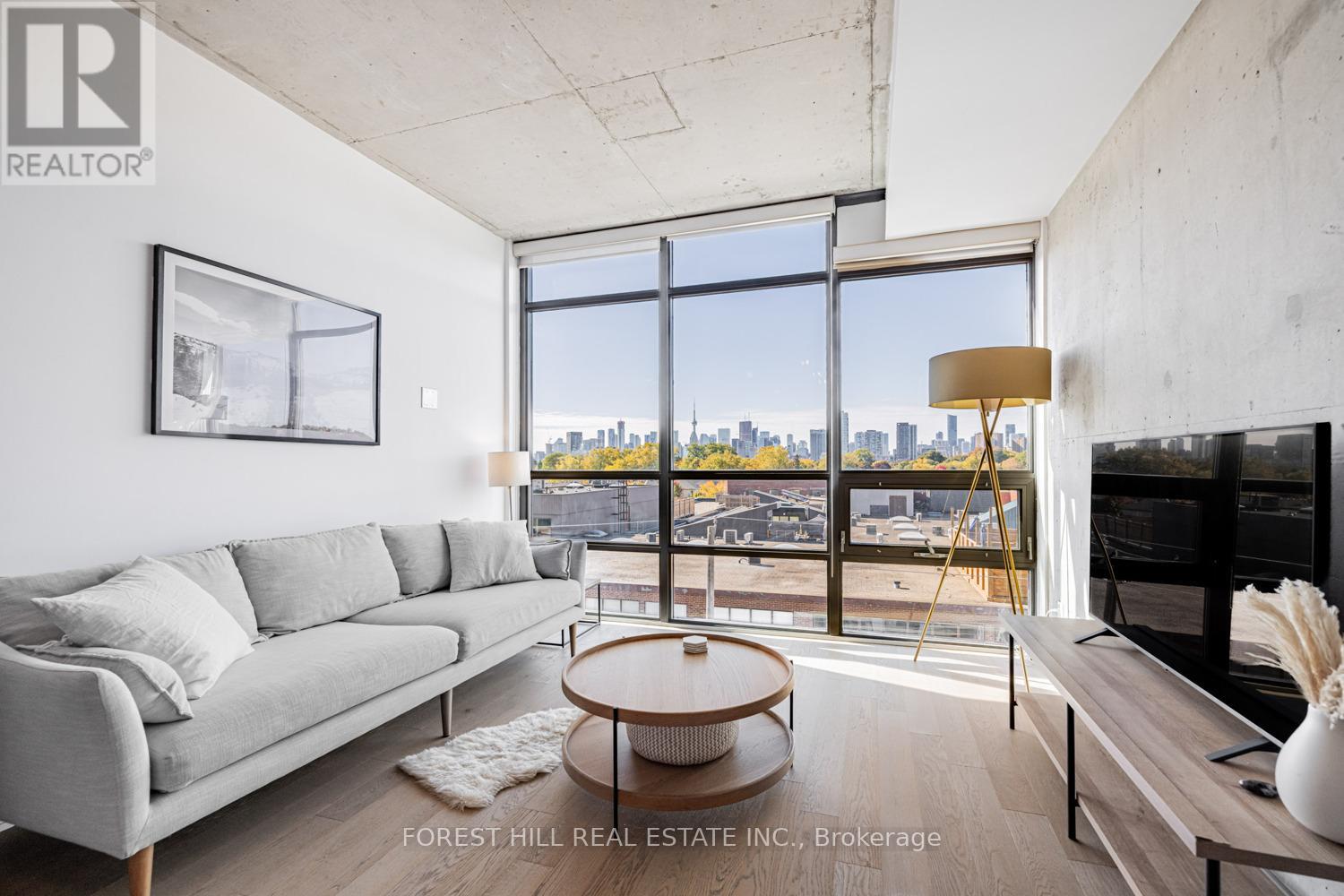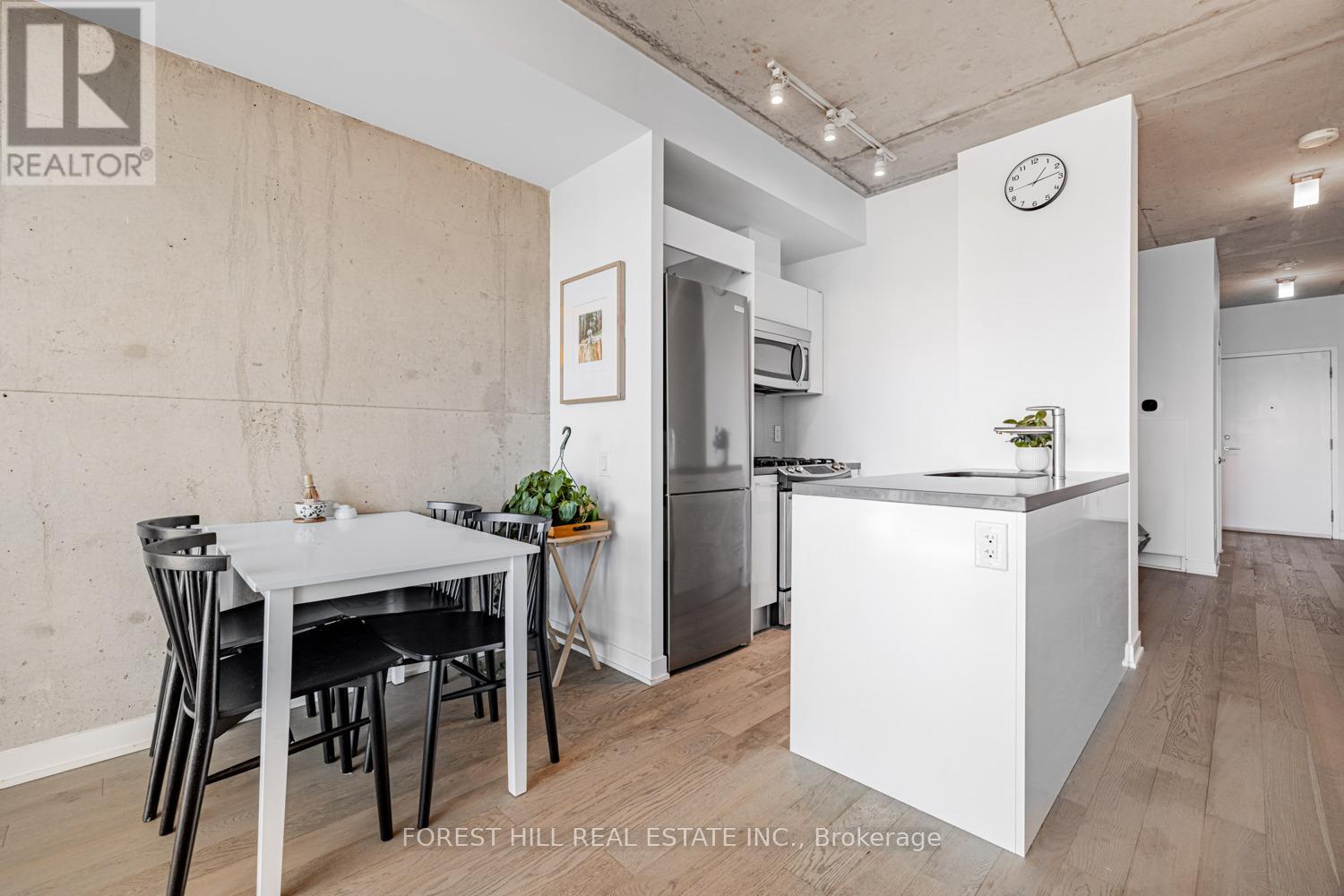 Experience incredible sunsets and UNOBSTRUCTED skyline views from this gorgeous one bedroom loft in Leslieville's sought-after WorkLofts! Freshly painted in 2025. This sun-filled suite combines industrial charm with modern comfort. Soaring 9Ft concrete ceilings, a bright open layout, and an unobstructed west facing view of the downtown skyline create a space that feels bright and inspiring. Enjoy cooking in your sleek Scavolini kitchen with quartz countertop and gas range. High end finishes with engineered hardwood flooring throughout. The building is quiet, well-maintained, and known for its LOW, stable maintenance fees over the years. Just one block from Queen Street East's best restaurants, cafés, and streetcars, and a short stroll to gyms, yoga, rock climbing, and spin studios. You'll love the easy 1-minute drive to the DVP, Lakeshore, or Gardiner Expressway, and soon the Ontario Line stop at Carlaw & Gerrard (only 4 minutes away) will make commuting even simpler. Easy access to the beach, bike lanes on Dundas Ave, three TTC lines. Residents also enjoy rooftop patio with BBQs, party room, and boardroom, onsite dry cleaning/shoe care services -- Everything you need for work, play, and relaxation in one stylish space. (41464228)