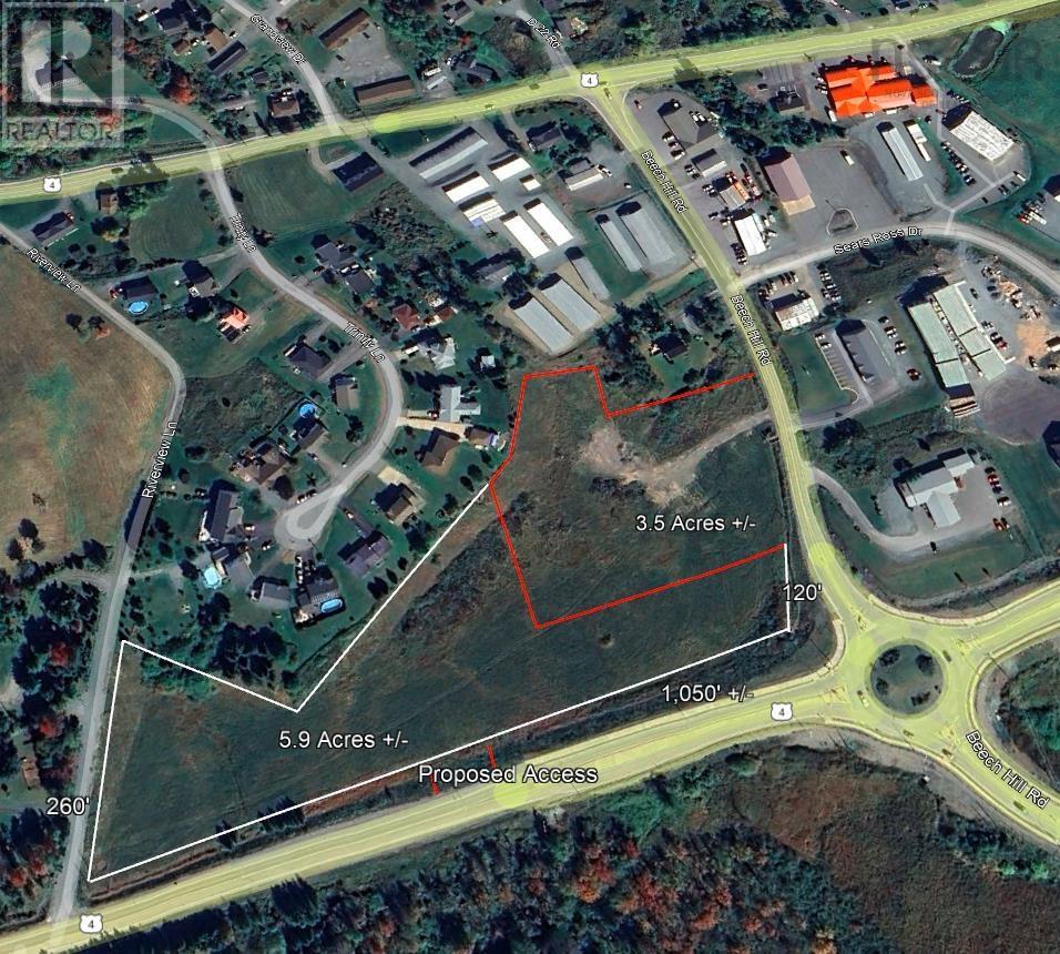 Located at the corner of Beech Hill Road and Highway # 4, the parent parcel of 9.2 acres features 1,050 +/- of frontage onto to Highway # 4 and 564 +/- onto Beech Hill Road. Access is available from Beech Hill Road and will be available from Highway 4, which is currently being reviewed by the Province. Subject to survey, the 6.6 acre parcel will offer approximately 525' of frontage onto Highway # 4 with direct access and additional access from Beech Hill Road. Highway 4 access will be shared with the adjacent parcel of 2.6 acres +/- The immediate area is one of the most active development areas in the region with several new commercial developments underway and others recently completed including; Century Nissan Auto, Access Nova Scotia, EHS Ambulance with Petro Canada about to break ground and the new Primary Care Collaborative Clinic set to open in the late fall. The property is zoned C1 Local Commercial and C2 General Commercial as per the Municipality of the County of Antigonish, West River Antigonish Harbor Planning Strategy. Municipal zoning allows for a mix of commercial and residential development and has one approved driveway onto the property from each roadway. Municipal waste water service is available. Municipal piped water service is available. The property is migrated and a survey is available. Environmental Site Assessment Phase 1 has been completed. (231525109)