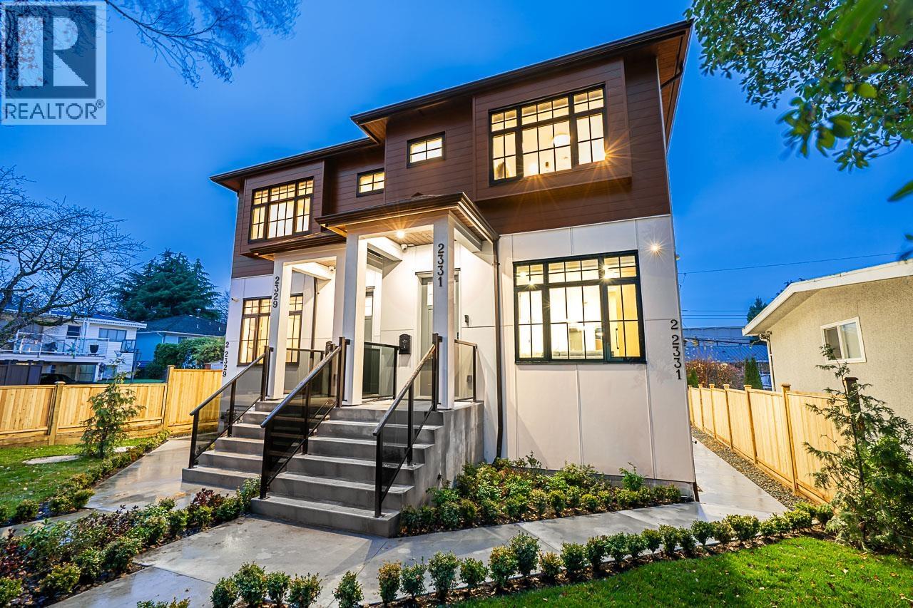 Best Value in Killarney! Discover 2331 E 49th Ave, a modern duplex crafted by Can West Development in Vancouver's Killarney neighbourhood! This luxurious 1,756 sqft home features 5 bedrooms and 4 bathrooms, including a 2-bedroom, 1-bathroom legal suite perfect for rental income or extended family. Highlights include engineered hardwood floors, white oak millwork, a chef's kitchen with a 6 burner gas range, and built-in appliances. With integrated security cameras, a roughed-in vacuum, and an EV-ready garage, this home offers unmatched convenience. Located near schools and shopping, it´s a must-see! Call now for your private tour. OPEN HOUSE SAT DEC 13 @ 2-4 PM + SUN DEC 14 @ 2-4 PM (32075869)