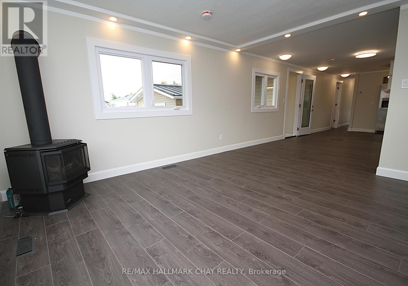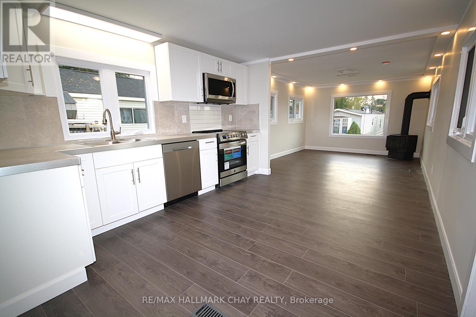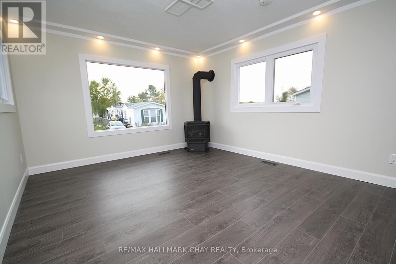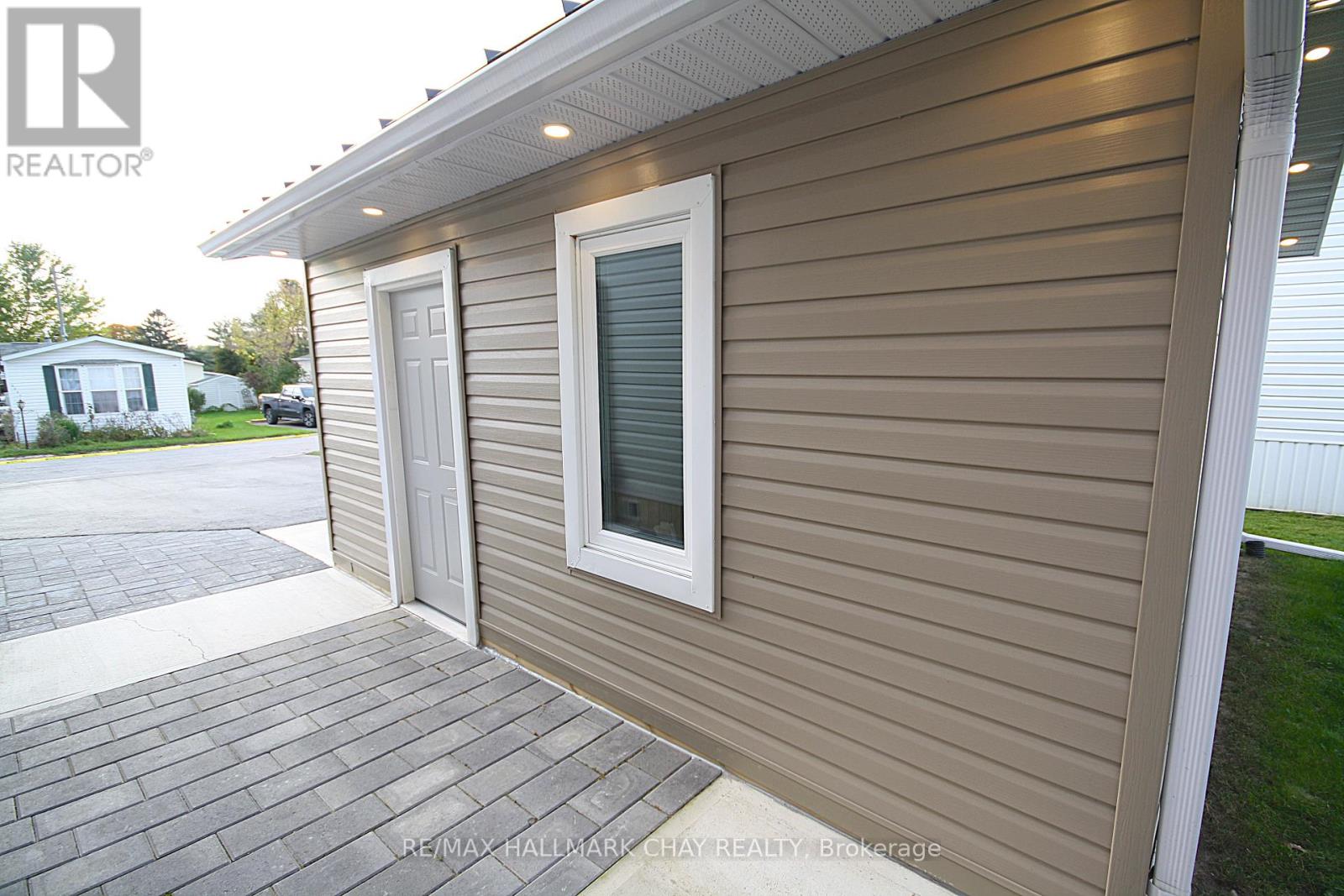 WOW! NEW, NEW, & MORE NEW! Completely renovated or rebuilt inside and out. This move in ready 2 bedroom 2 bathroom home has been recreated just for you to enjoy for many years to come. Excellent layout provides a walkout to large private deck off primary bedroom, bonus office with closet and attached 1/2 bath, large foyer with coat closet, covered porch, open concept kitchen with cozy gas fireplace. Too many upgrades to list...featuring all NEW in 2024/25; steel roofs on all 3 buildings, siding, soffit, fascia, troughs, exterior lighting, huge new asphalt driveway, paver stone, all new windows, and new exterior doors, new decks, upgraded insulation, new drywall, all new flooring, totally new bathroom, 5 brand new appliances, new kitchen, new central air unit, all interior trim & doors, and paint, new pot lighting and light fixtures, and much much more! Walk out to large private deck. Pride of ownership and attention to details abound. Garage was taken down to foundation and rebuilt with new framing, insulated walls and doors, windows, garage door opener, and hydro. Amazing opportunity. Located close to Orillia and major amenities. Land lease fee includes road maintenance, garbage removal. Monthly fee inclusive of Taxes 30.00 , Water 33.00, and lease fee = 538.00 total. (41495587)