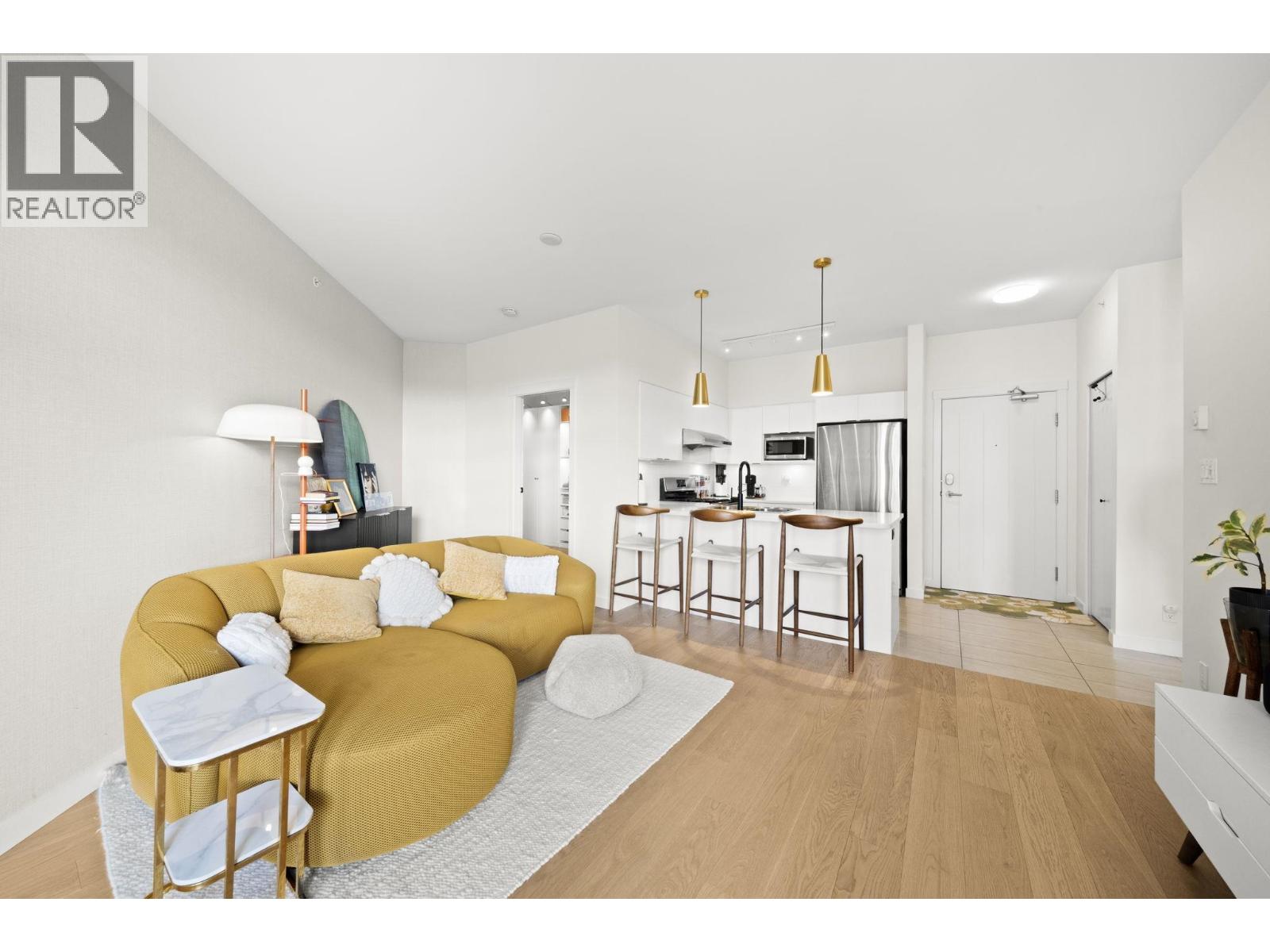 Proud to preset the BEST Jr.2 Bedroom home in Richmond UNDER $550k. Renovated in 2022 with completely new Engineer Hardwood Floor, new LG smart full-size washer and dryer, new window blinds and sheer covering, all LED lights upgrade, new faucets, designer wallpaper and fresh new paint of the entire unit including door trim and baseboard. This home is filled with love with lot of warmth, positive good vibe and home sweet home moment. This Penthouse comes with Extra High Ceiling, draws in tons of natural light, blue sky and the beautiful courtyard view from every window. Comes with TWO side-by-side parkings. (32092909)