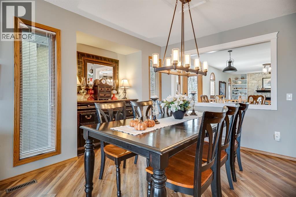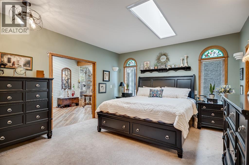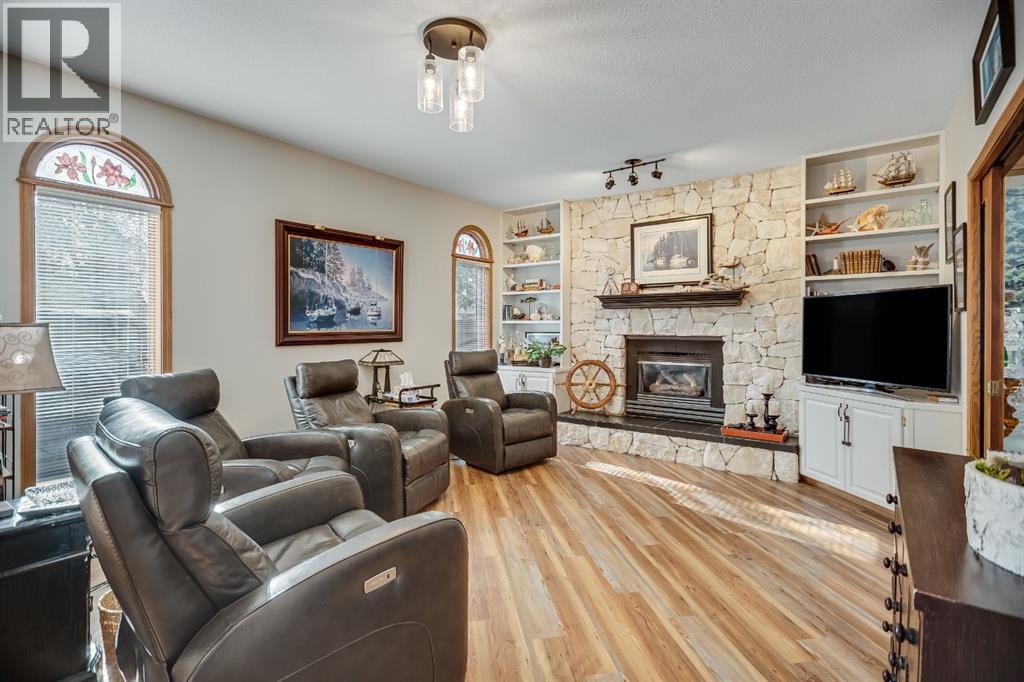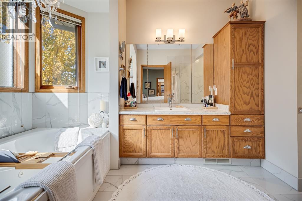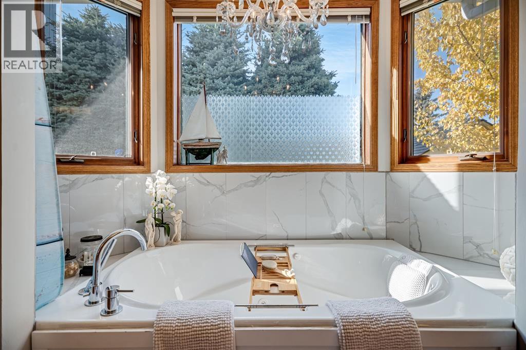 Experience the finest in living with this exceptional, fully finished 2367 sq ft bungalow across the street from Emerson Lake. Immaculately maintained and recently upgraded, this home boasts high-quality finishes, spacious, bright rooms, and a unique, welcoming layout you'll love.The main floor is an entertainer's delight, offering an open-concept living area, a formal dining room, and a cozy family room with a gas fireplace. It features a fantastic sunroom with a curved wall of windows and electric-shade-equipped skylights, plus a functional kitchen with a nook, updated appliances, and plenty of storage.The luxurious master suite is a true retreat with two exits, a walk-in closet, and a newly renovated 6-piece ensuite featuring a spacious glass shower and soaker tub. Two additional bedrooms (one an ideal office) and a dedicated laundry room complete the main level, all updated with new vinyl plank flooring, updated fixtures, and modern hardware.The fully finished basement expands your living space with a huge games room (pool table included!), a bedroom, an office, and a massive workshop/storage area with the comfort of in-floor heating.Outside, you'll find a private, west-facing backyard oasis. Surrounded by a wall of mature spruce trees, the patio offers incredible privacy. It features three water features, landscaping, fruit trees, and a timed irrigation system. Practical extras include a super-sized double attached garage, air conditioning (new furnace/AC), two new hot water tanks, and a concrete tile roof. (31299231)