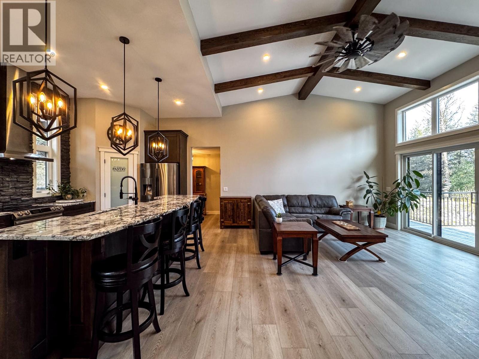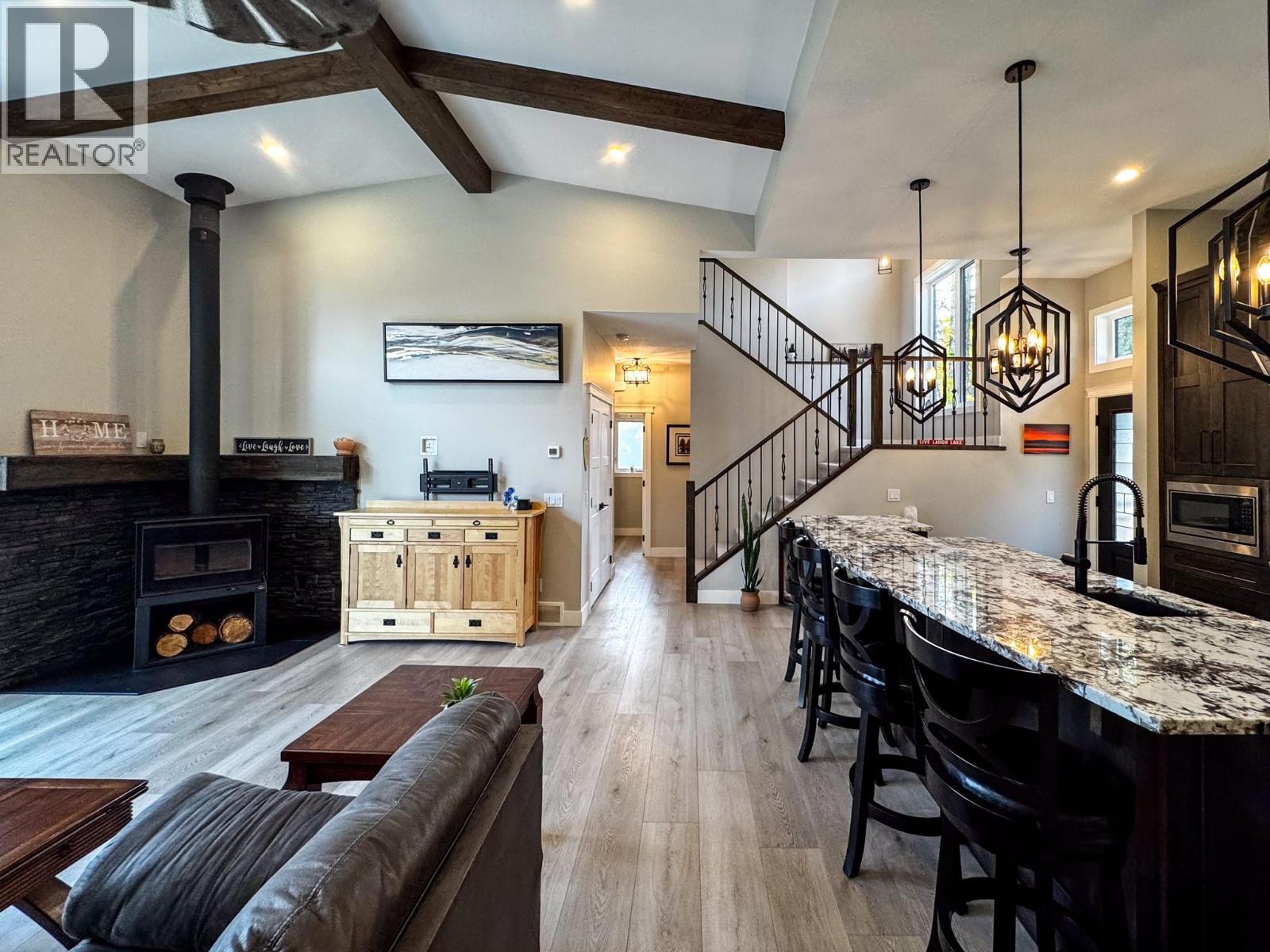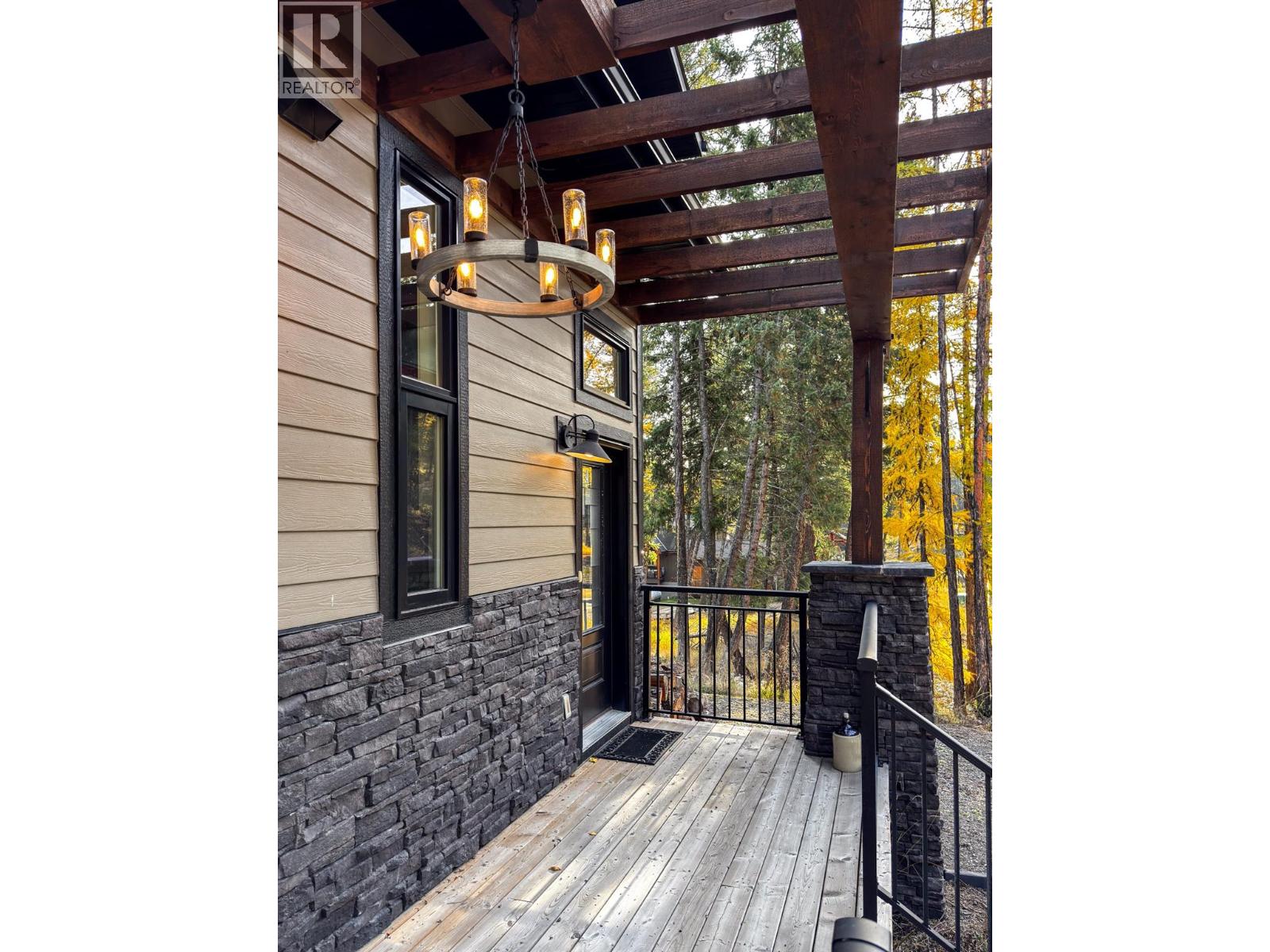 Exquisite Custom Home | Built in 2022 Come home to Lake Life in this striking modern residence in Wardner, BC blends architectural sophistication with West Coast warmth. The exterior showcases composite siding, natural stone, cedar shakes, and a timber pergola accenting the grand front entrance. Inside, an open-concept main floor impresses with luxury vinyl plank flooring and a great room featuring soaring vaulted ceilings, exposed wood beams, and a high efficient wood-burning fireplace framed by floor-to-ceiling windows that open to a spacious view deck with amazing views only this beautiful community could provide. The gourmet kitchen boasts granite countertops throughout, custom cabinetry, a corner pantry, built-in microwave, gas range, a stone backsplash, wine fridge and seating for 6 around the island. A bright guest bed, elegant 4pcs bath, and garage entry with extra storage complete the main level. The primary suite commands its own private floor, offering breathtaking mountain and lake views, a spa-inspired en-suite with dual vanities, LED anti-fog mirrors, and a tiled walk-in shower with glass enclosure and waterfall dual shower head, plus a custom walk-in closet. The lower level awaits your finishing vision—fully framed, wired, HVAC installed, with plans for a 3rd bed, 3rd bath, laundry, and wine cellar in the rec room. Set on a .496-acre lot with RV parking, a double attached garage (26x22), and a second-story hot tub, this home captures panoramic vistas of mountains, forest, and the north end of Koocanusa Lake—a rare blend of luxury, design, and natural beauty. (39406560)