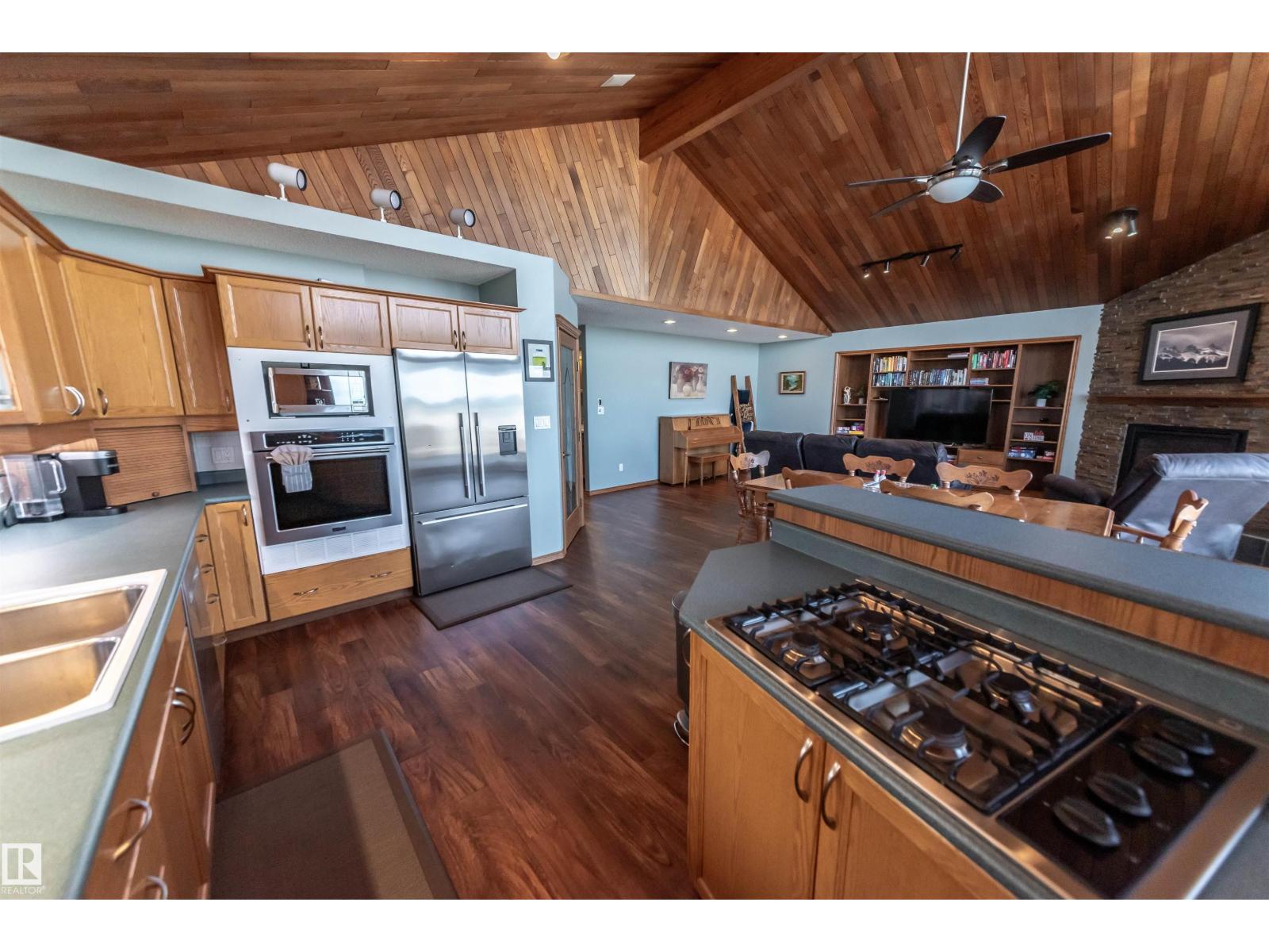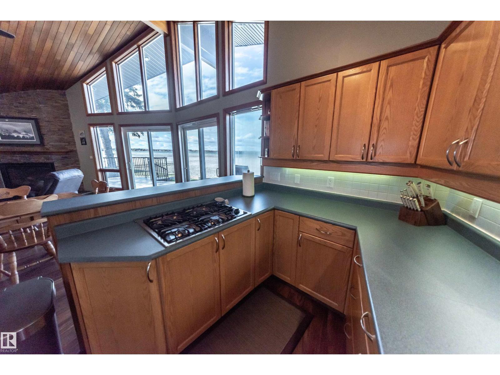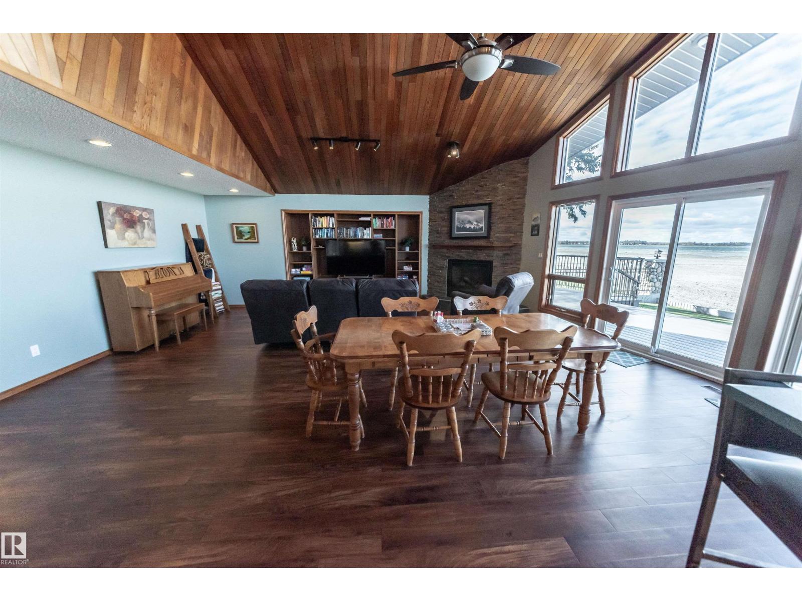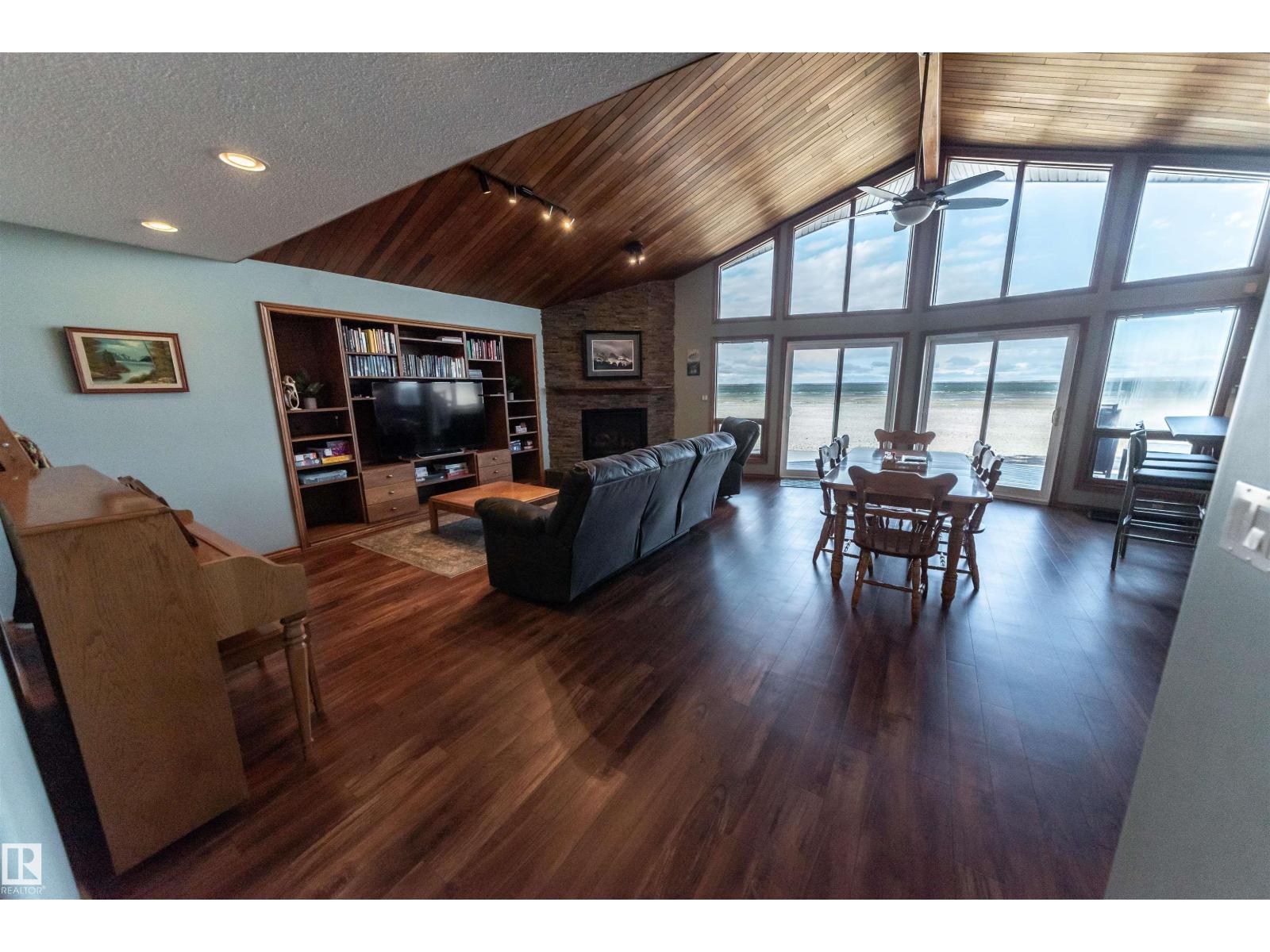 Over 2100 sq ft WATERFRONT home perfectly situated on the shores of Lac Ste. Anne, just a short walk to the main beach, restaurants, seniors centre, museum, library, and local grocery stores. Enjoy unbelievable sunset views from the expansive front deck overlooking the sandy beach frontage. The triple attached heated garage has been recently finished and painted. Inside, the spacious open-concept main floor features a large living room, dining area, and kitchen with cathedral ceilings, a striking shale rock feature wall fireplace, and a custom built-in entertainment cabinet. The primary bedroom includes a walk-in closet and a full ensuite with a jacuzzi tub. Completing the main level are the laundry area, a den with built-in Murphy bed, and a 2-piece bath. Upstairs offers a bonus room, two generous bedrooms, a full bath, and access to a private upper deck. Many upgrades over the years. This beautiful lakeside property is move-in ready and offers perfect comfort, style and lakefront living. (33505042)