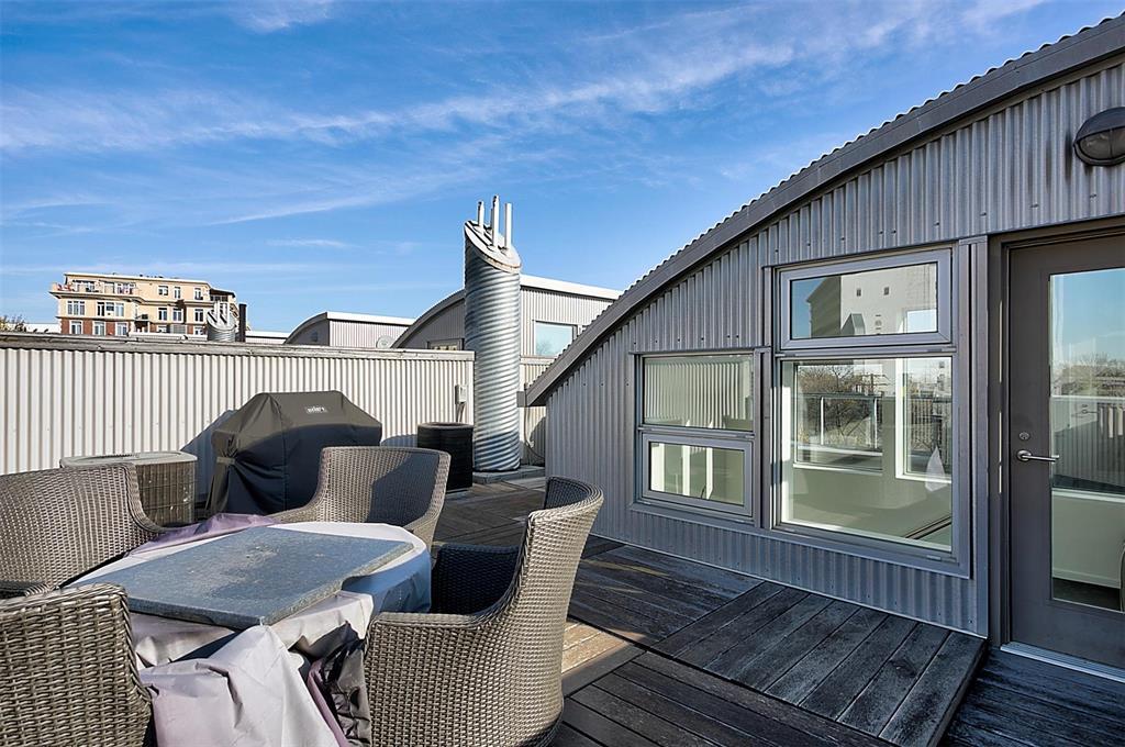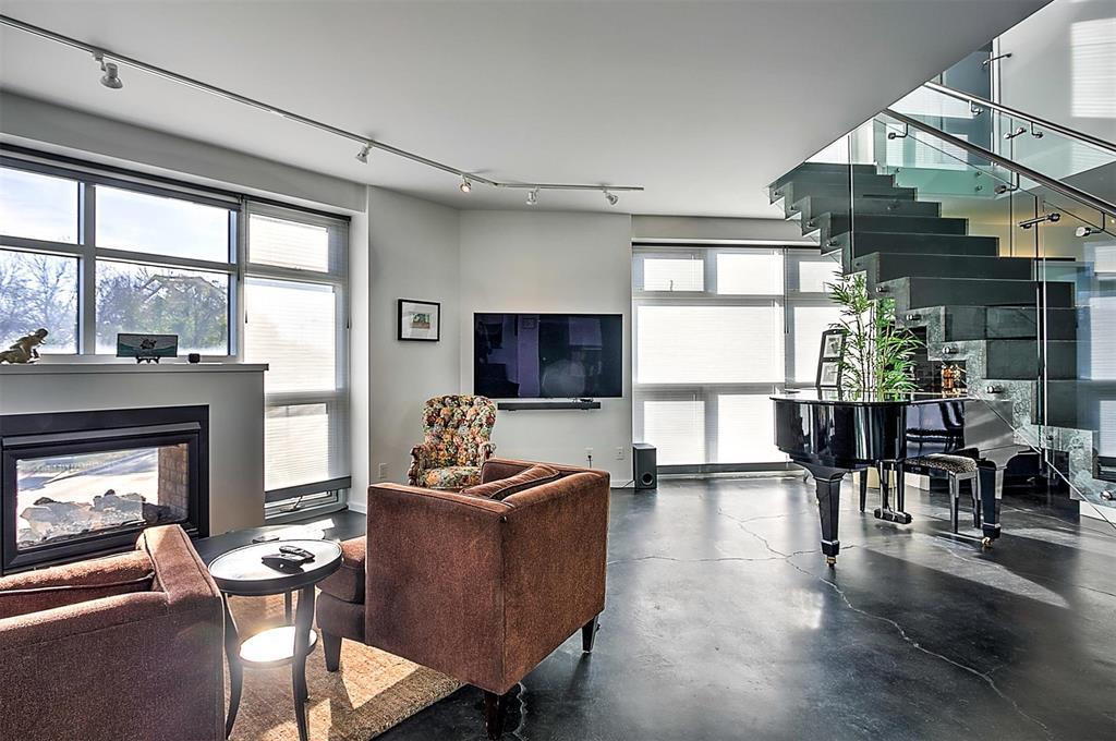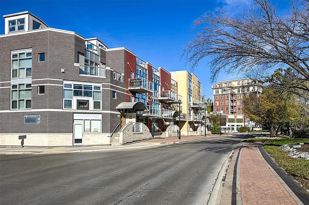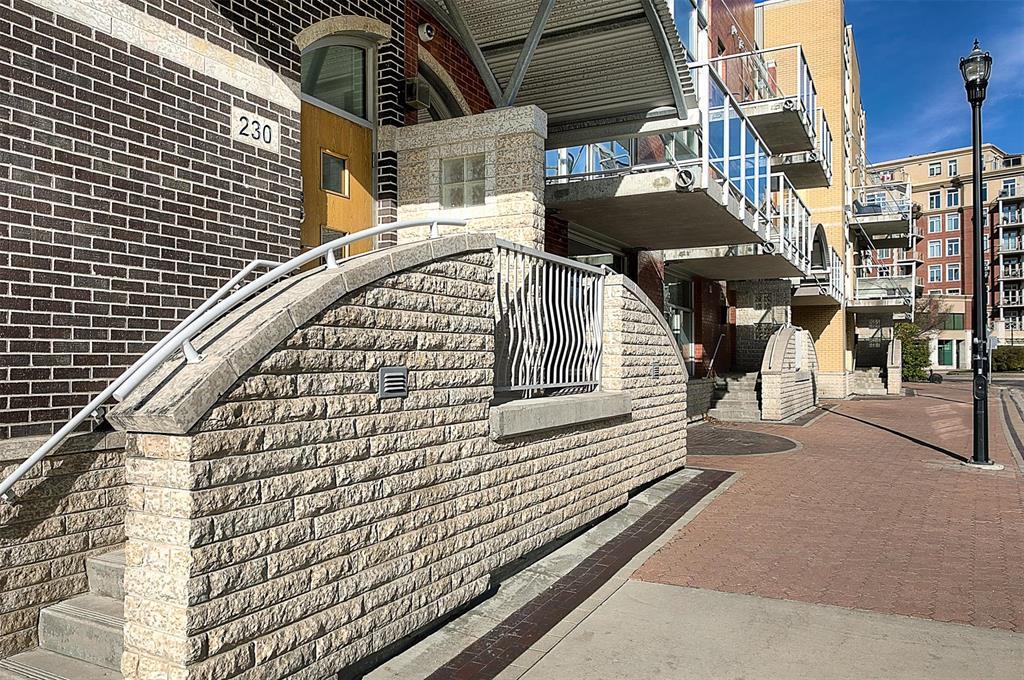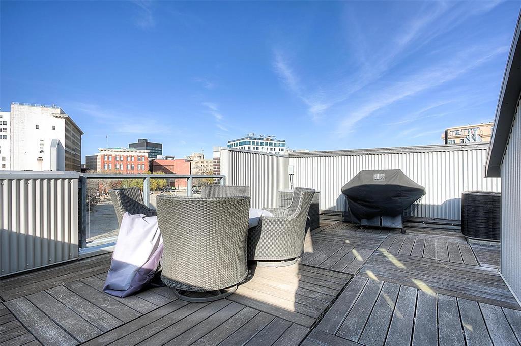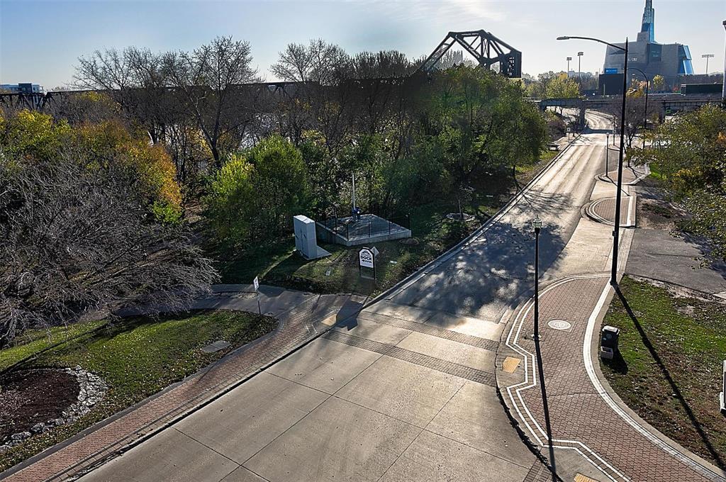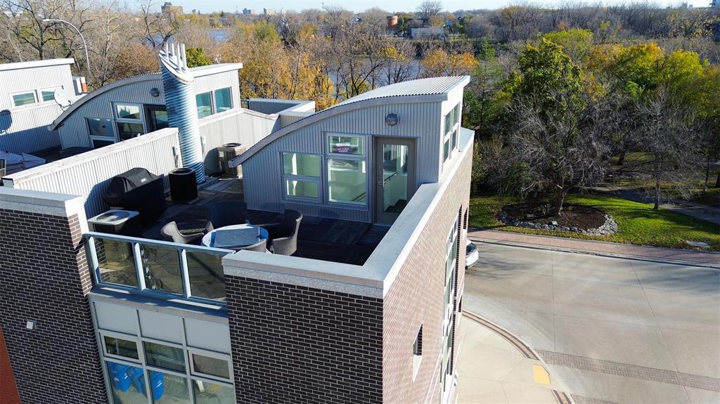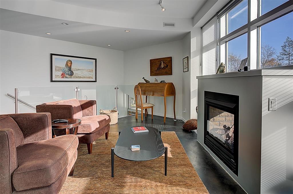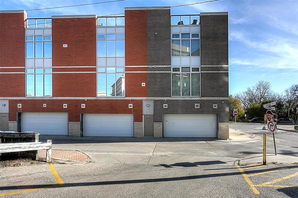 9A//Winnipeg/Welcome to Ship Street Condos! This spacious townhouse condo offers stunning modern finishes and incredible natural light throughout. The main floor features a bright open concept with custom floating concrete staircase. Living Room with floor-to-ceiling windows two-sided gas fireplace overlooking Waterfront Dr. Open concept Kitchen/Dining Room with ample cupboard and counter space, and high-end appliances including a Wolf dual fuel range and GE Cafe 4-door fridge. Main floor laundry and powder room. Two Bedrooms and 2 washrooms on the second level. The Primary Bedroom boasts a curved feature wall and 4-piece en-suite with standalone shower and tub. Second Bedroom with gas fireplace, 3-piece en-suite, and private balcony overlooking Stephen Juba park. The third floor provides access to the panoramic rooftop deck with over 600 square feet of outdoor space overlooking the Red River and downtown Winnipeg. Secure parking in the oversized, heated double garage on the main level with access to the private elevator (shared with next-door neighbour). Heated throughout with hydronic in-floor heat, with supplemental forced air heating and A/C. Located on the South corner with East, South, and West exposure. (231571230)