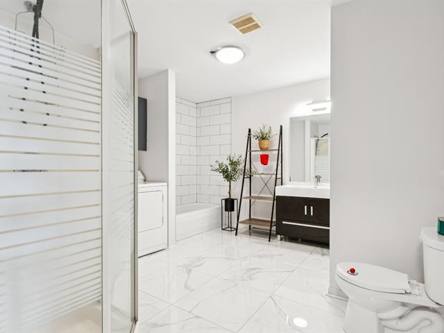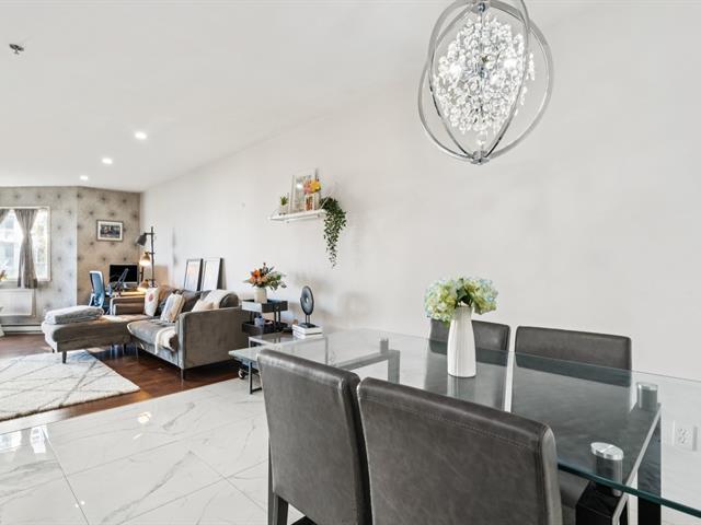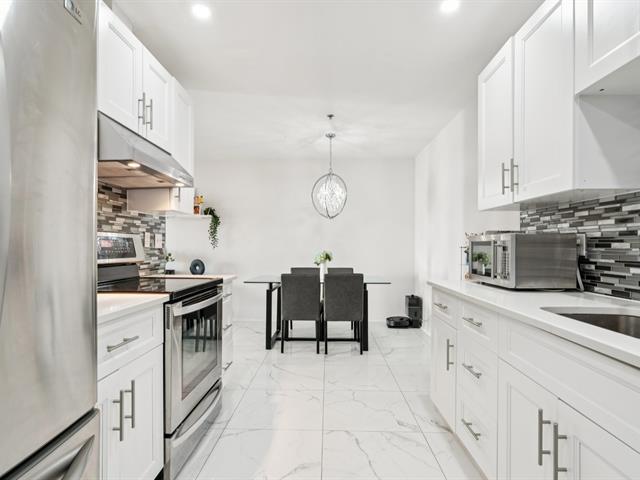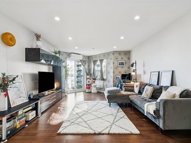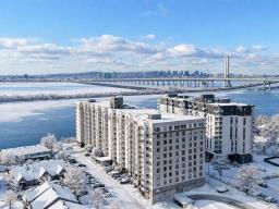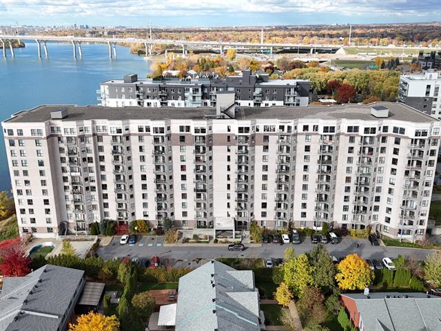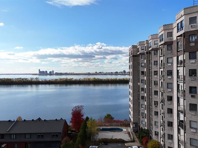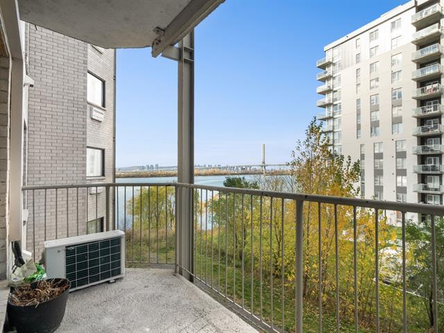 ** 4 1/2 CONDO WITH GARAGE - RIVER VIEW ** Quickly available! Les Rives du St-Laurent, building with elevators offering gym, community room, and outdoor pool. Unit located on the 6th floor, large living room, balcony with view on the river, Champlain Bridge, and Montreal. Dining room conveniently located between the living room and kitchen with stone countertops and double sink. Two good-sized bedrooms also enjoy the superb view. The master bedroom has a walk-in closet leading to the adjoining bathroom with separate shower, bathtub, and washer/dryer. Wall-mounted heat pump. Tandem garage for two parking spaces. See addendum for details. (46666379)