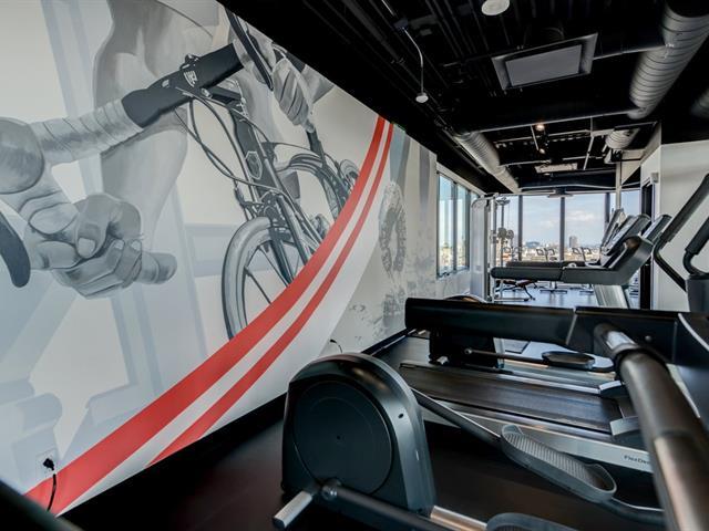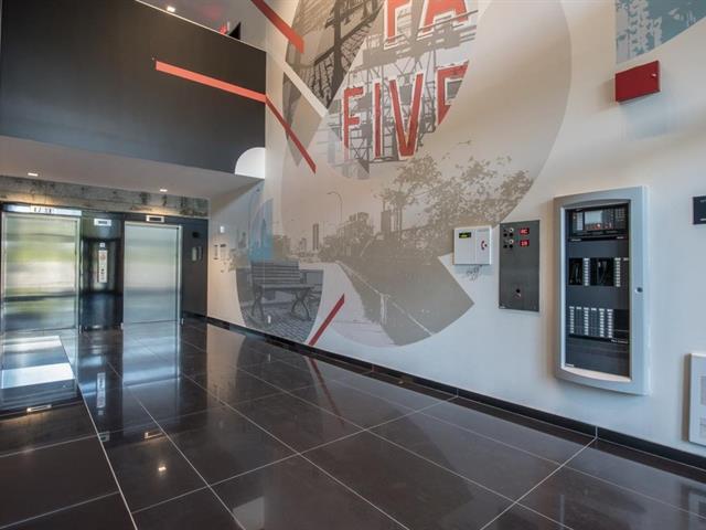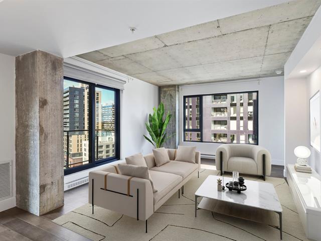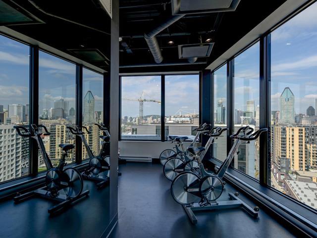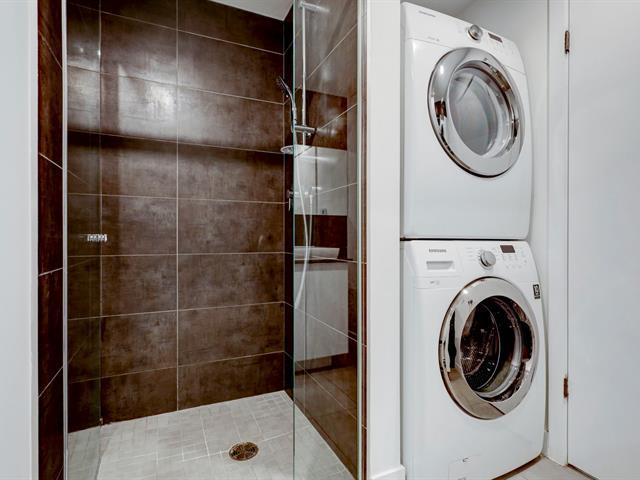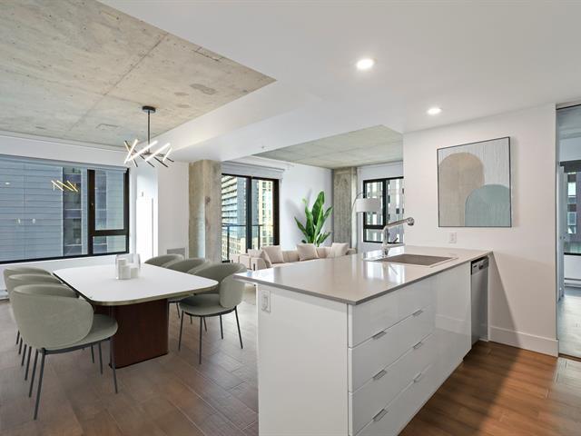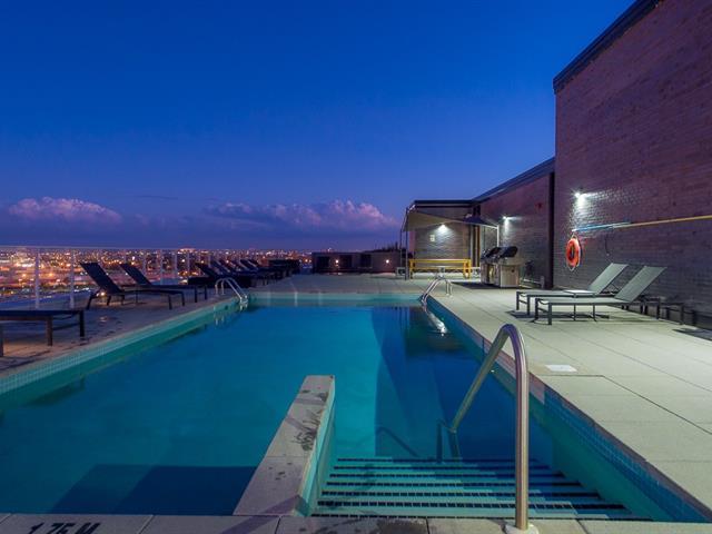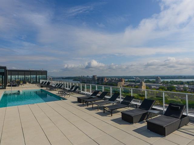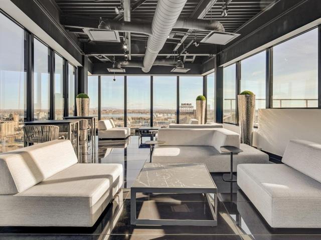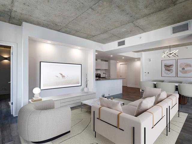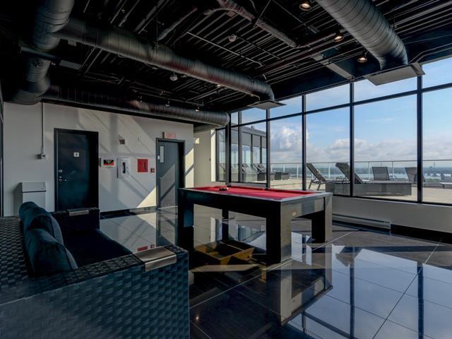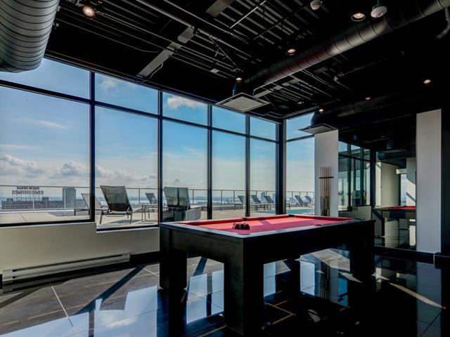 Griffintown -- Stunning corner unit located on the 11th floor, offering breathtaking views of downtown. This bright condo features 2 bedrooms, 2 full bathrooms, an open-concept living and dining area, and 2 private balconies. You'll also enjoy an indoor parking space with a private electric charging station. The building offers premium amenities, including a heated pool, spa, fully equipped gym, and an urban lounge ideal for remote work or relaxation, complete with a billiards area and shared living space. (45153993)