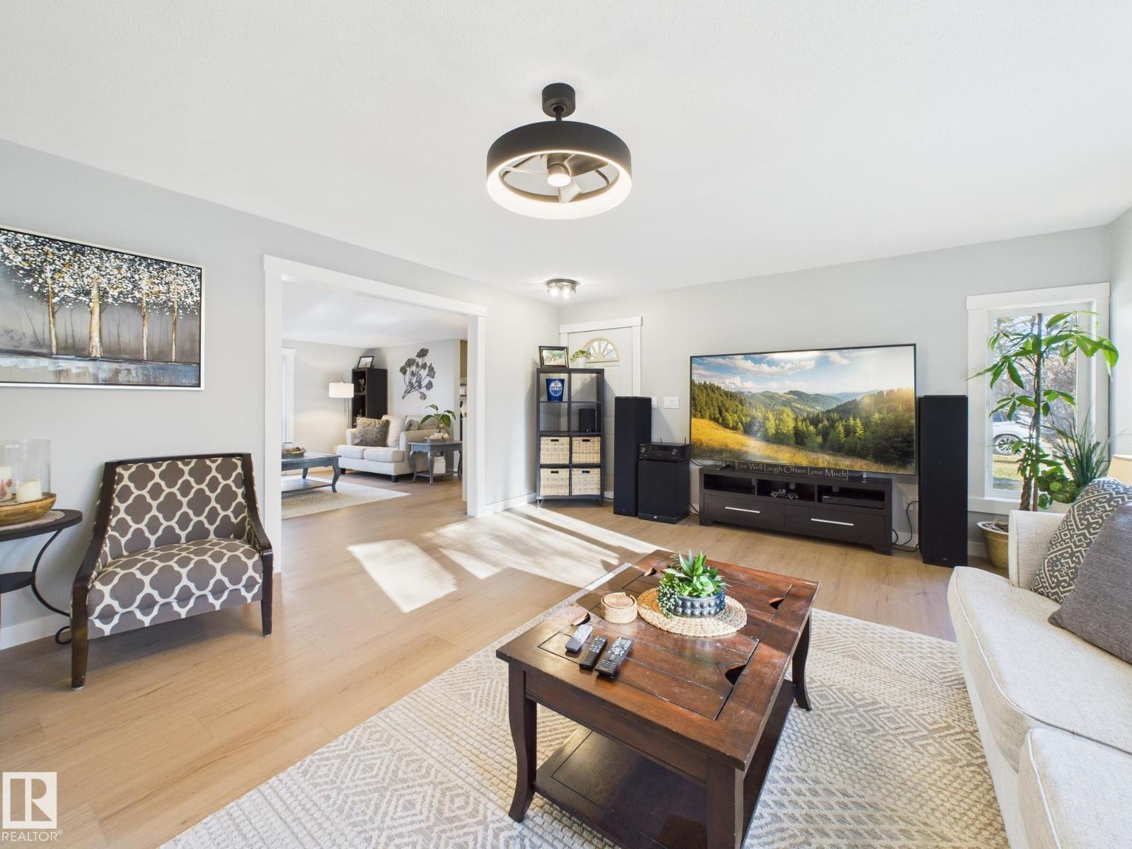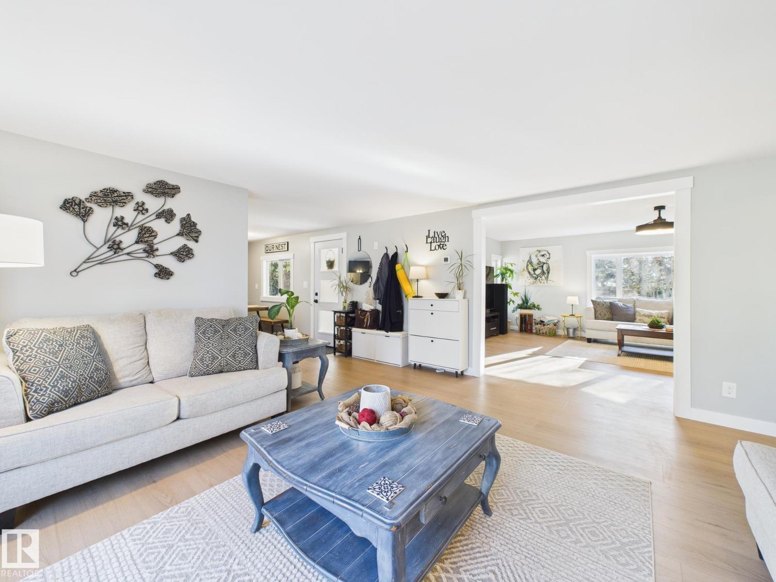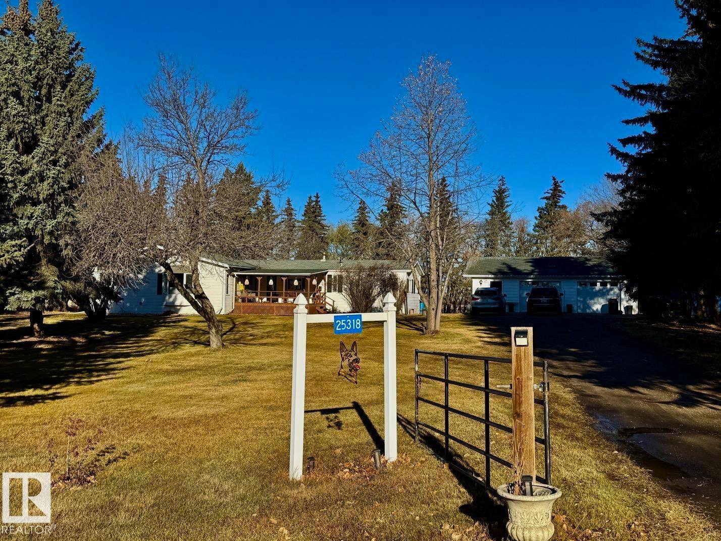 LOCATION LOCATION LOCATION! This beautifully renovated home sits on a stunning 1.5 acre property less than a kilometer from Hwy 2 between Morinville and St. Albert. Surrounded by mature trees, it offers peace, privacy, and space to enjoy the outdoors with family and friends. Imagine relaxing on the large south-facing covered front deck or hosting gatherings on the huge back deck overlooking this serene setting. Inside, the home is bright and inviting with big windows, vinyl plank flooring, and a flowing layout. You’ll love the three spacious bedrooms with generous closets and two gorgeous new bathrooms. Updates completed in 2025 include fresh paint, baseboards, both bathrooms, new light fixtures throughout, new front and back doors, a new kitchen entry door, and new balcony window. The oversized heated double garage is perfect for hobbies, storage, or parking. This property is the perfect blend of country charm and modern living just minutes from city conveniences. (33528328)