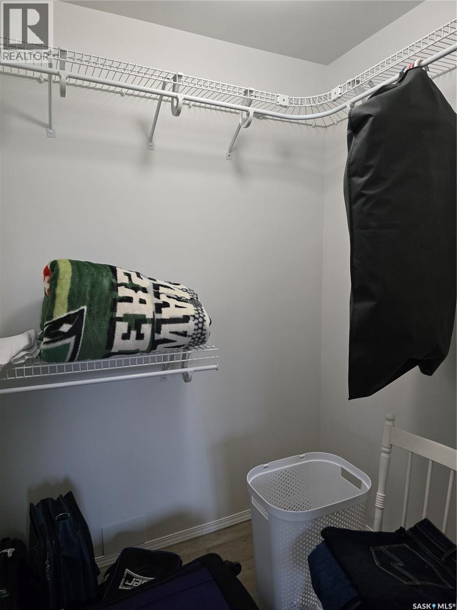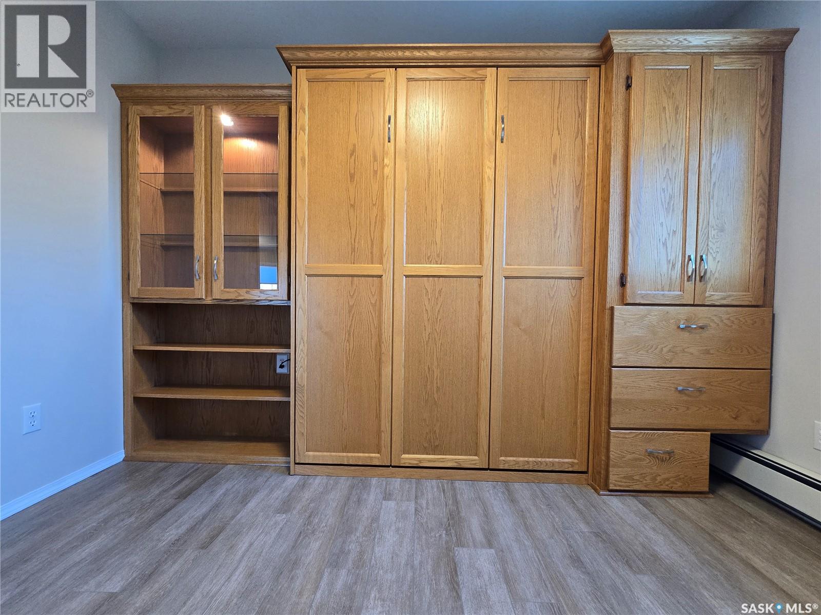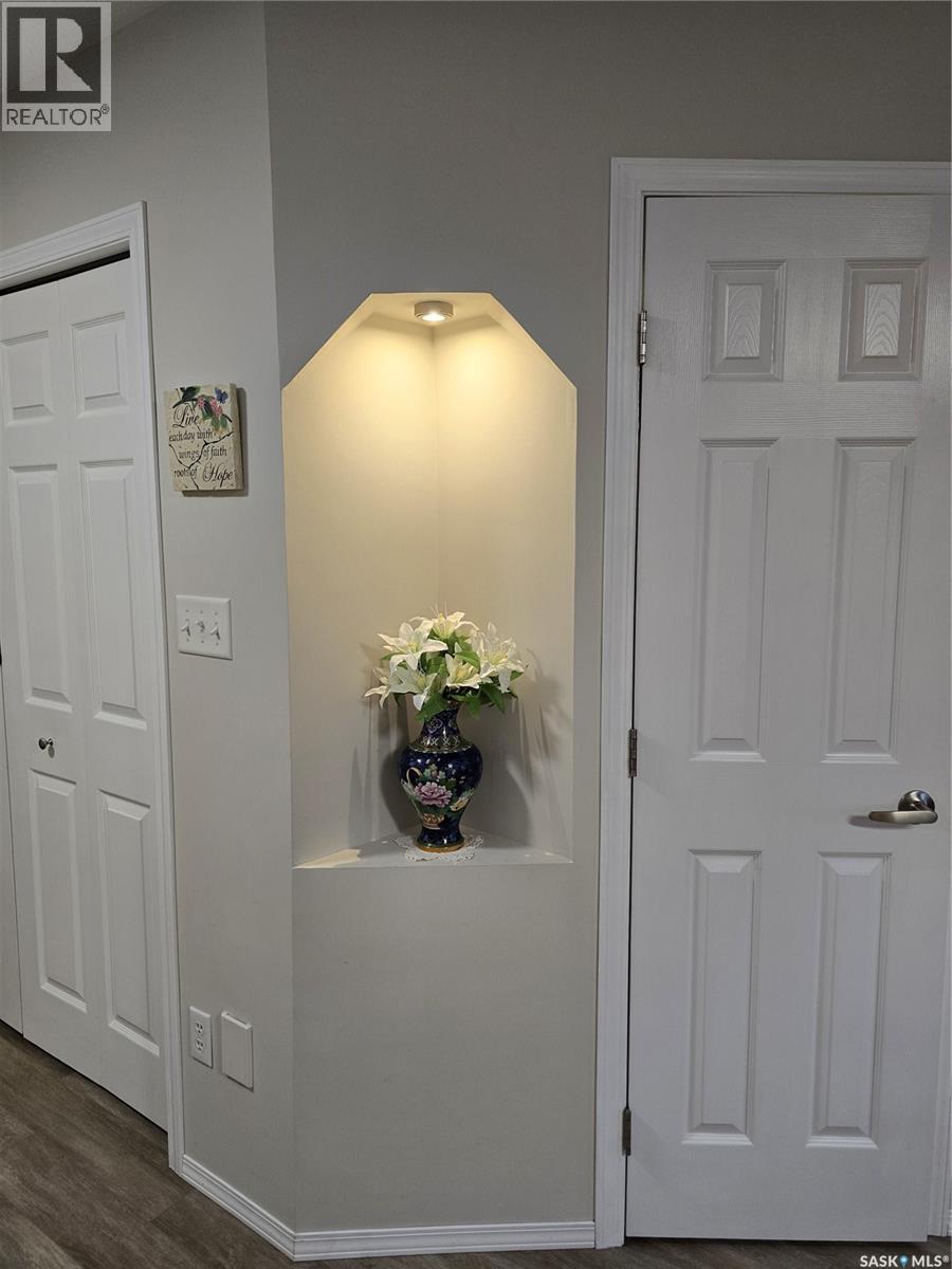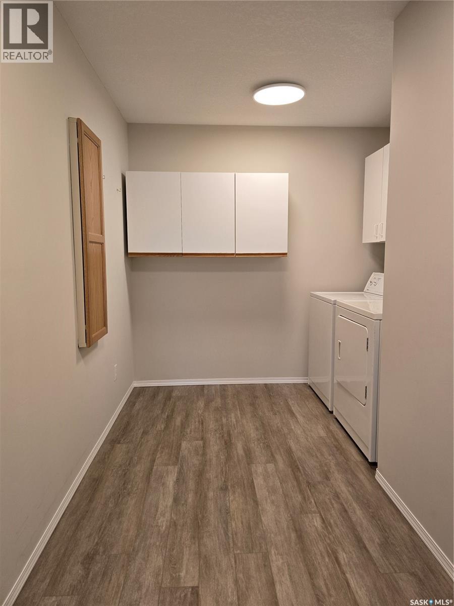 Move in before winter sets in! Quick possession is possible! Welcome to this sunny, south facing, second floor corner unit in Birch Place Condos in Watrous. This updated 1,108 sq. ft. unit was built in 2001. The open kitchen, dining, and living room area makes this condo feel spacious. Vinyl plank flooring is laid throughout the unit. The master bedroom features a large closet and 3-piece ensuite. The main bathroom has a tub/shower with grab bars. The second bedroom contains an oak wall unit with fold down murphy bed making it roomy and versatile. Off the living room is a door leading to a sunny, south facing balcony. The large laundry room has a built-in fold down ironing board. Other unique features are a lighted wall niche and a sun tunnel in the foyer that provides natural light to the entrance. A pantry off the kitchen allows for extra storage. A large 10'8" x 26'6" garage stall with 7' (h) x 9' (w) door is included in the ground level heated parking garage off the back alley. A storage unit is also located in the garage area. This building is wheelchair accessible and contains an elevator. Call your agent for a viewing! Please Note: Seller is NOT interested in renting until condo sells. (29087336)