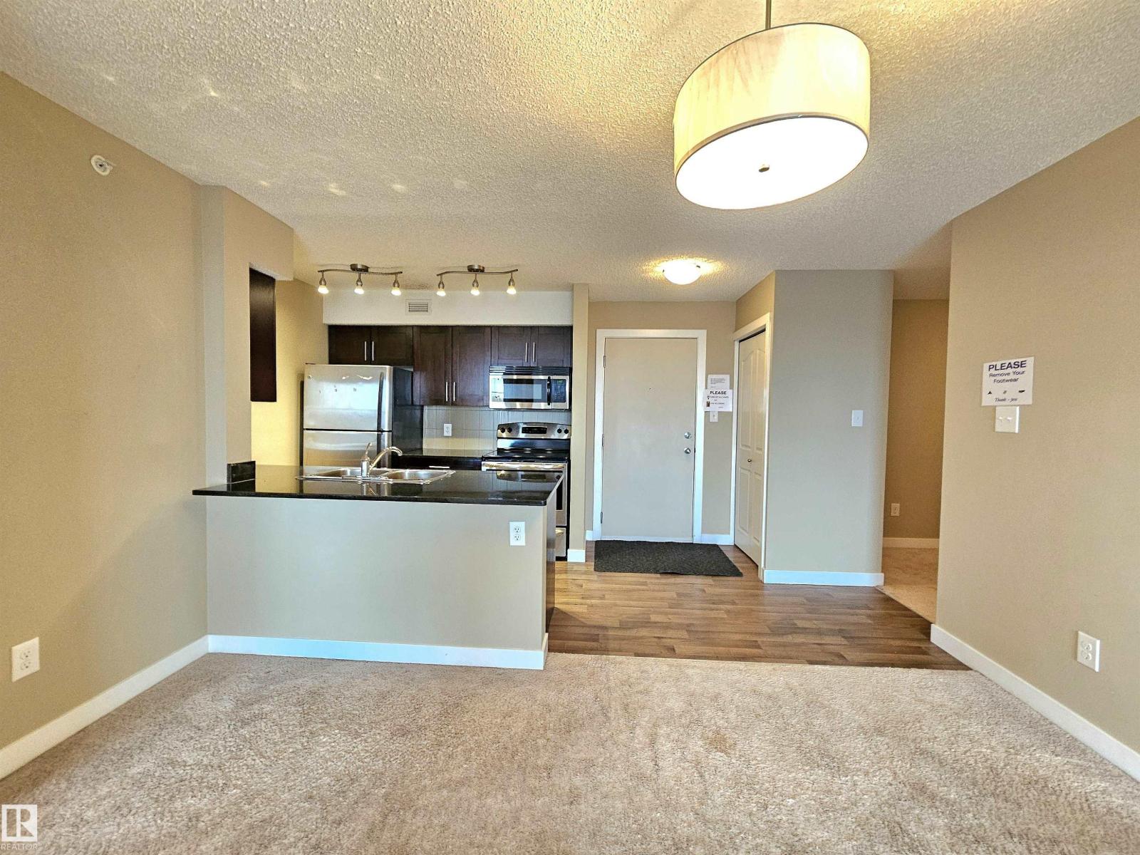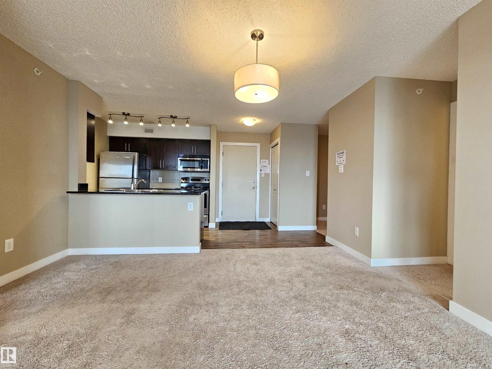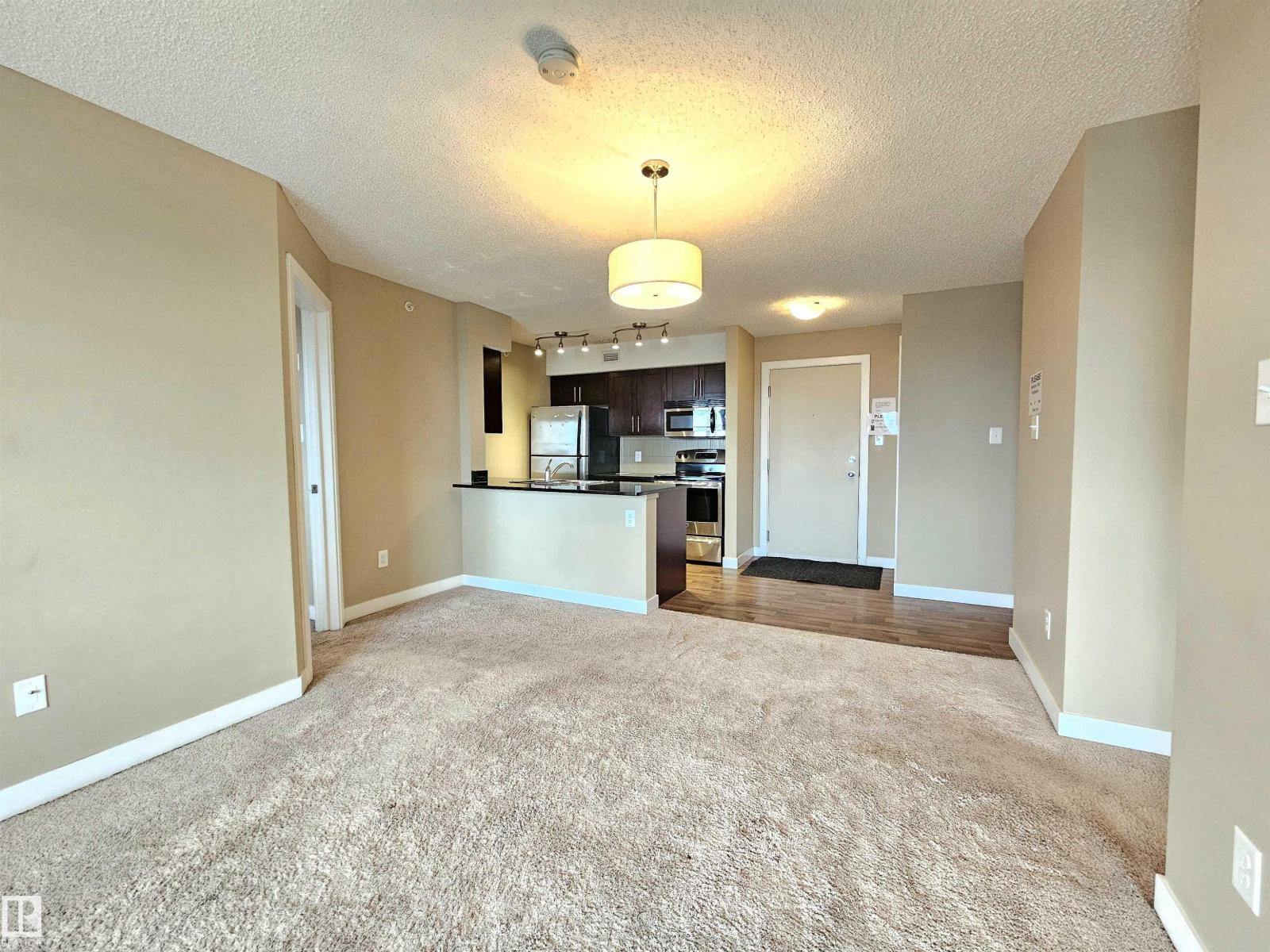 Beautiful and spacious move-in ready with IMMEDIATE POSSESSION 847 sq. ft. 2 bedrooms plus DEN, 2 baths, and 2 titled parking stalls (one underground and one surface parking) top floor condo unit in Elements At McConachie. This lovely unit has contemporary color tones newly painted 5 years ago. Large and bright living room has big window and access to the Southeast facing balcony. Beautiful kitchen has granite countertops, extended breakfast bar, tiled backsplash, stainless steel appliances, and laminate flooring. Spacious dining area. Good size bedrooms. Primary bedroom has walk-through closet and 3 pcs. ensuite. The second bedroom has adjacent 4 pcs. main bath. A good size den offers much versatility. Convenient insuite laundry with newer washer. Two titled parking stalls. The underground parking stall is conveniently located just steps to the elevator. Close to all amenities and quick access to Anthony Henday. (33531897)