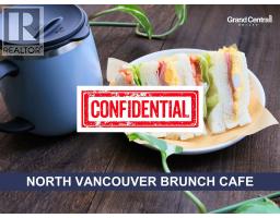 *Showing by appointment only, do not disturb staff. * Turn-key and profitable cafe for sale in a prime North Vancouver location, just minutes' walk from the beach and marina. This 1,234 sqft cafe offers stunning ocean views and steady traffic from both locals and tourists. Surrounded by new high-rise residential developments, the area continues to grow rapidly, boosting customer flow year round. The cafe is well maintained with new equipment and commercial ventilation, allowing flexibility to expand the menu or add hot food options. Strong sales, an established customer base, and consistent profitability make this a great opportunity for owner-operators or investors. Retirement sale ' a rare chance to take over a thriving business in a sought after seaside community. Please contact the listing agent for more information today! (37174865)