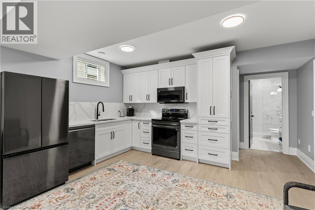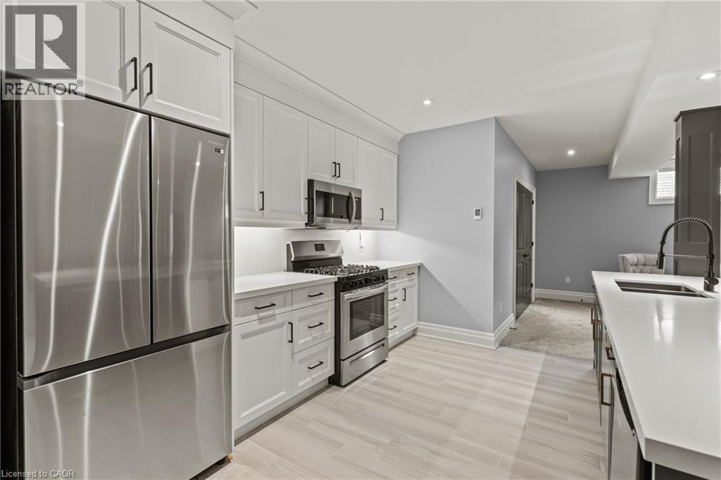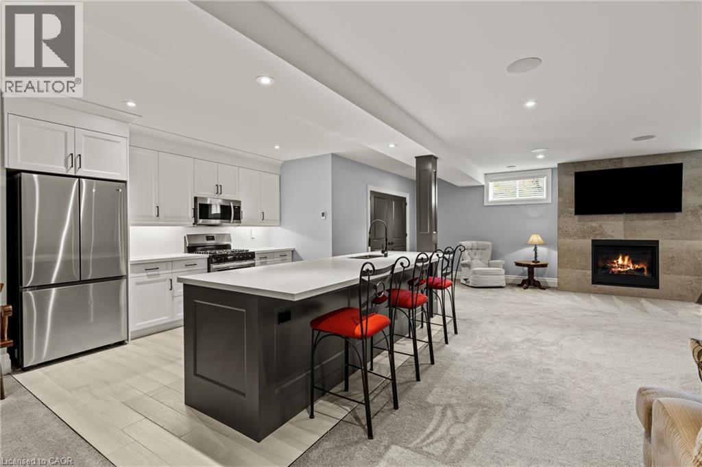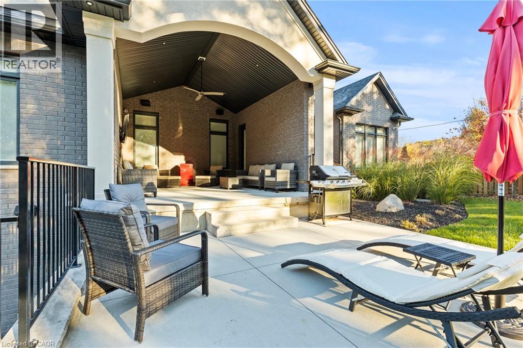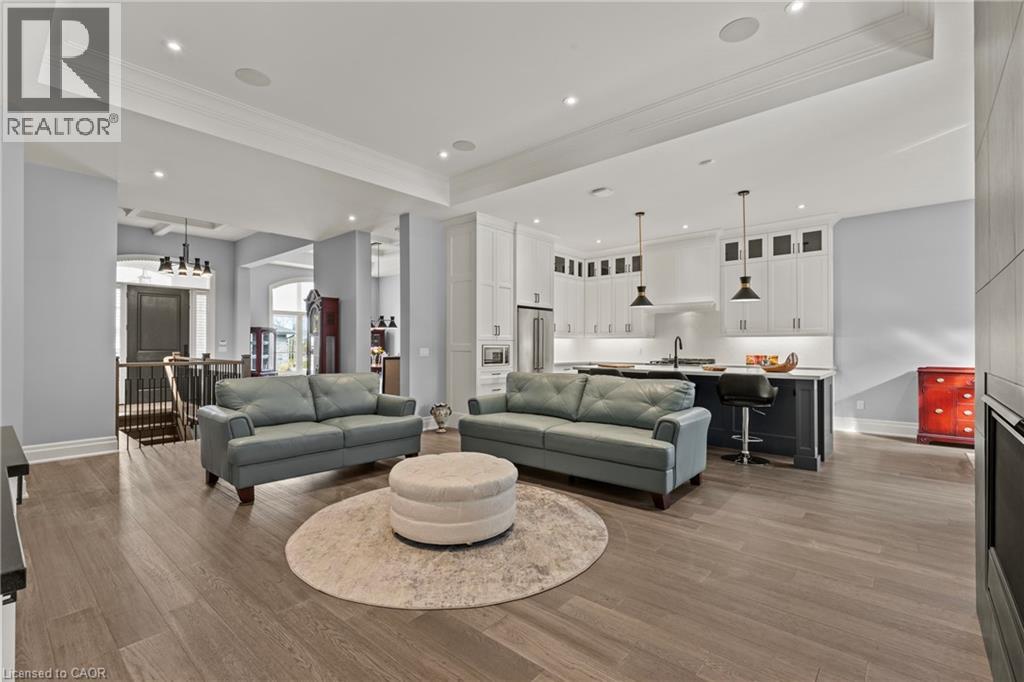This luxury custom-built 2580 sqft bungalow offers exceptional craftsmanship, elegant design, and highly functional multi-generational living spaces throughout. Fully finished basement makes it nearly 5000 sqft finished! Designed with versatility and comfort in mind, the home features three complete kitchens each finished with custom cabinetry, quartz countertops, premium appliances (two gas ranges and one electric), three refrigerators, three dishwashers, and built-in microwaves-perfect for hosting large gatherings or offering private, independent living for extended family members. The main level showcases 12-foot coffered ceilings, engineered hardwood flooring, custom roller blinds, and beautifully appointed living areas highlighted by two gas fireplaces. For added everyday comfort, the home includes heated tile floors in three bathrooms and the lower-level kitchen. A self-contained 1-bedroom granny suite with its own entrance and dedicated parking provides privacy and flexibility, while the fully finished lower level includes two additional bedrooms, a full bathroom, a walk-out, and a spacious walk-in fruit cellar. The property features two full laundry rooms, each equipped with washer, dryer, laundry tub, and storage. Additional upgrades include Russound integrated sound and satellite wiring, a full security camera and alarm system with monitoring option, and an in-ground sprinkler system for effortless exterior upkeep. The home is fully fenced, professionally landscaped with thoughtful rock and garden design, and includes a covered outdoor porch to enjoy peaceful surroundings in every season. Every detail - from cabinetry to ceiling design to layout functionality - reflects the care put into creating a home that is both luxurious and deeply livable. This is a rare offering that combines elevated finishes, spacious design, and true multi-use living under one roof, providing comfort, privacy, and long-term value for its next owner. (69885920)