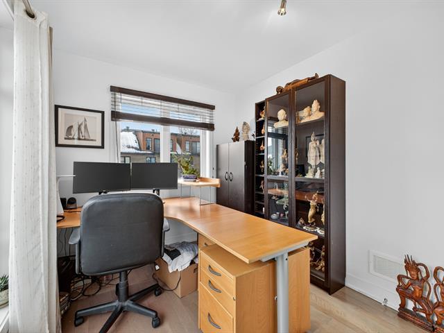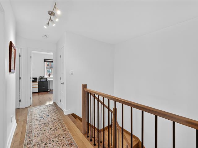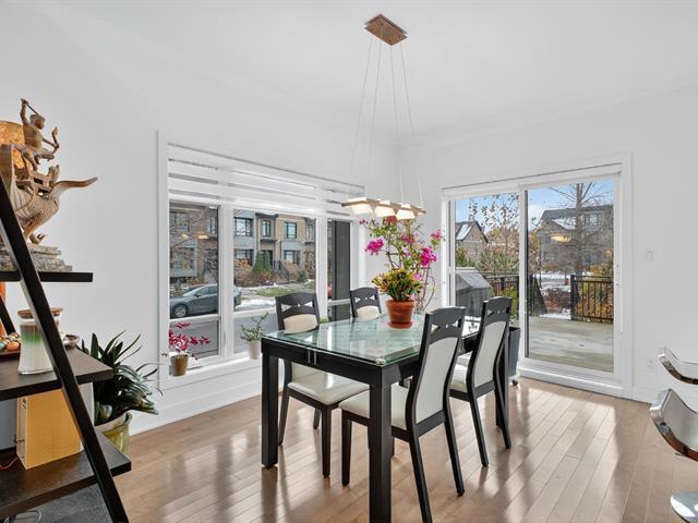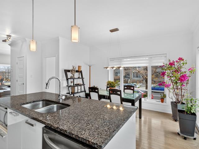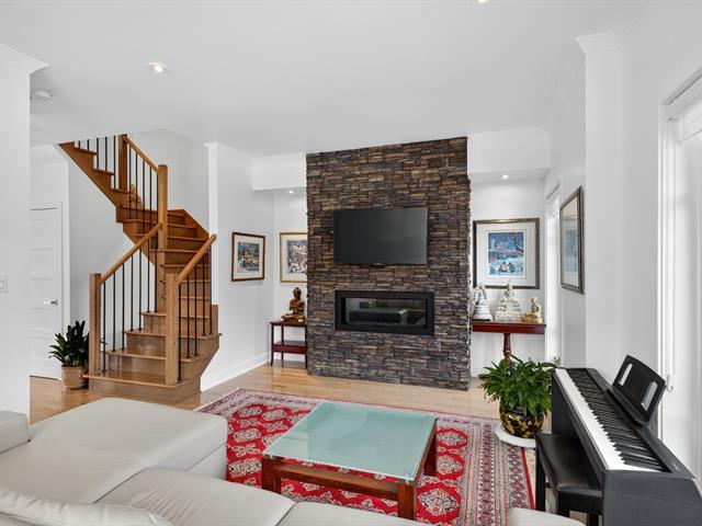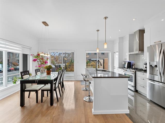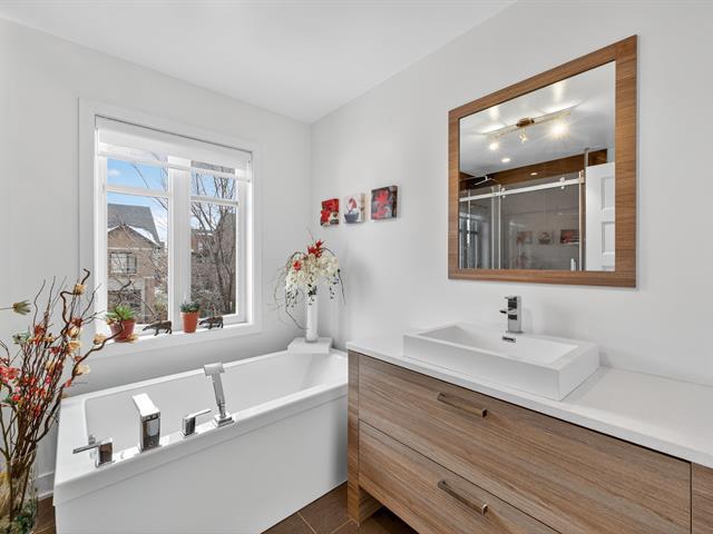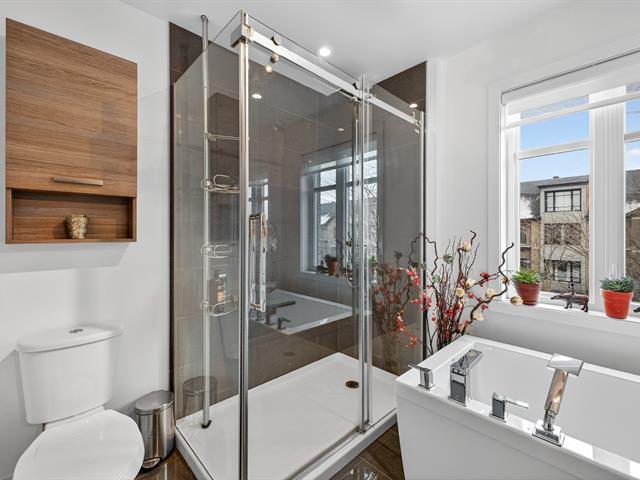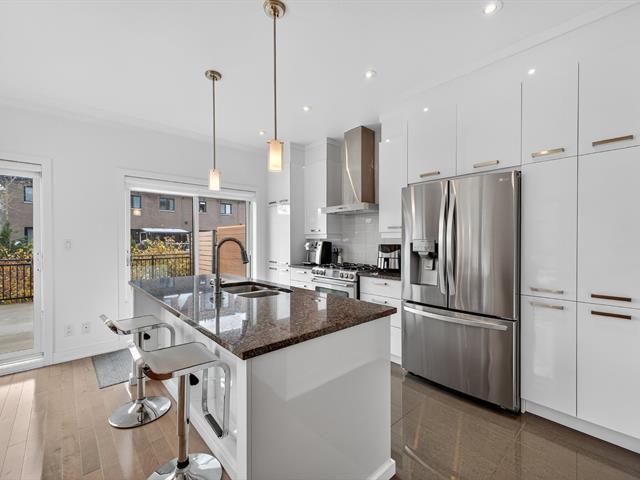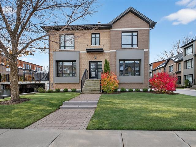Magnificent contemporary townhouse located in the Quorum Highland development. This corner unit offers exceptional natural light thanks to its large windows and 9-foot ceilings on the ground floor. It includes 3 bedrooms, including a master suite with a huge walk-in closet, 2 full bathrooms, and a powder room. The modern kitchen with quartz island offers abundant storage and a convivial space opening onto the huge outdoor terrace. The finished basement offers a family room and direct access to the double garage. Located in a peaceful area, near the Lachine Canal and 10 minutes from downtown. A must-see! (44886268)