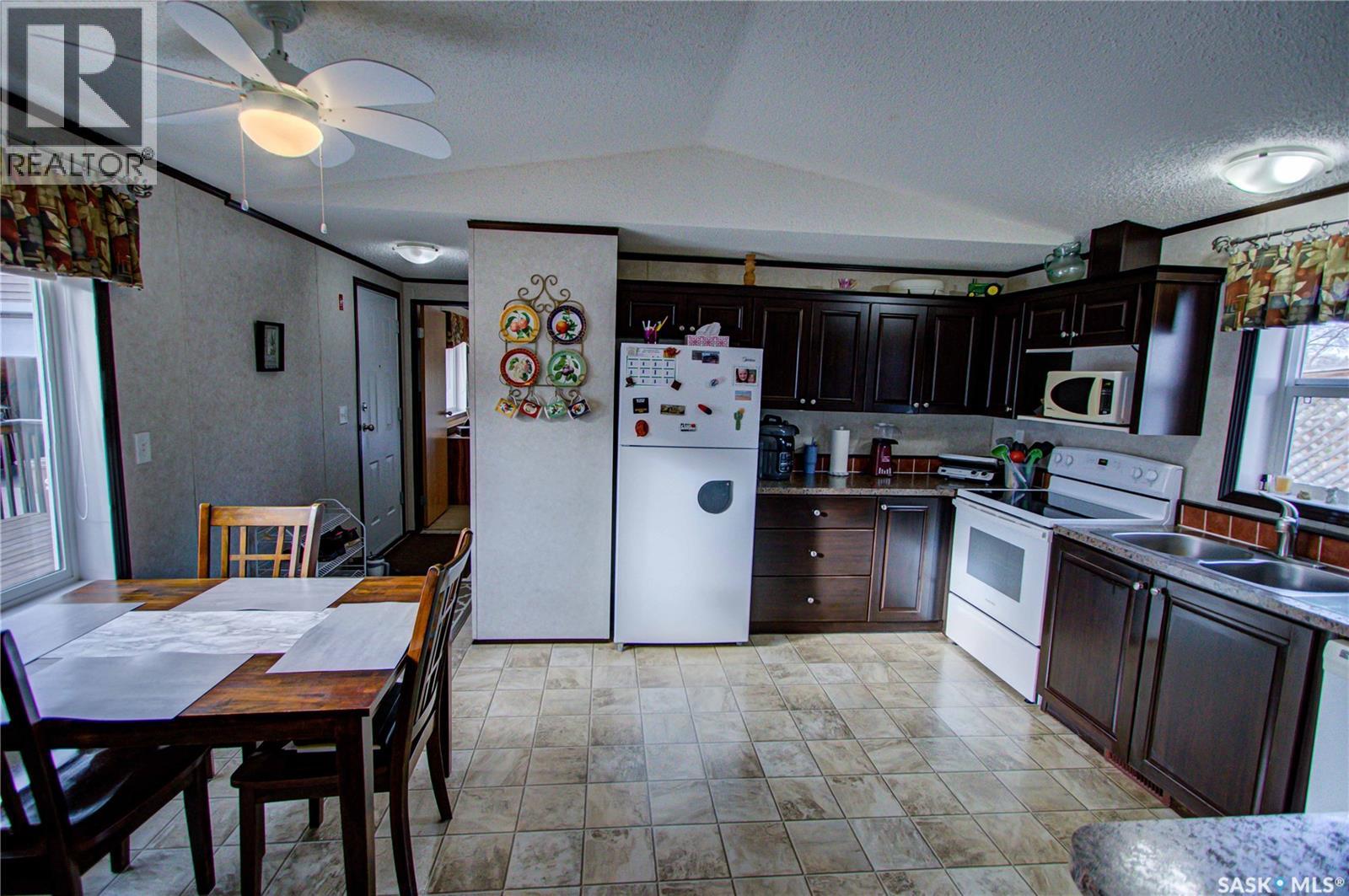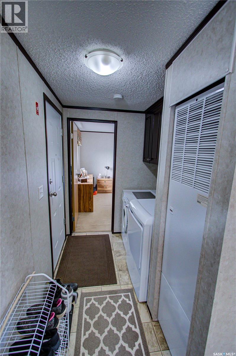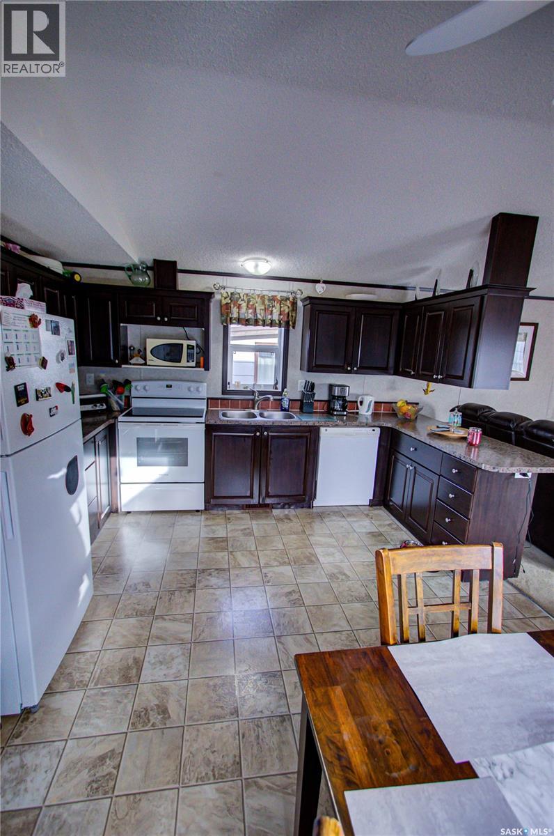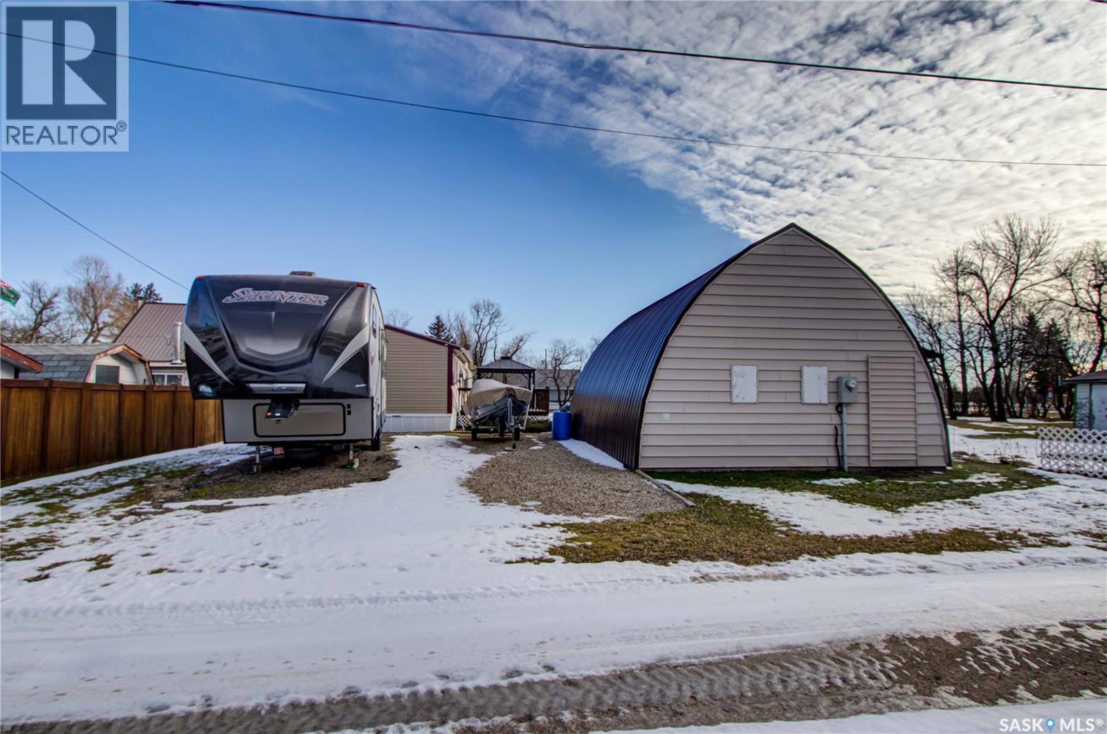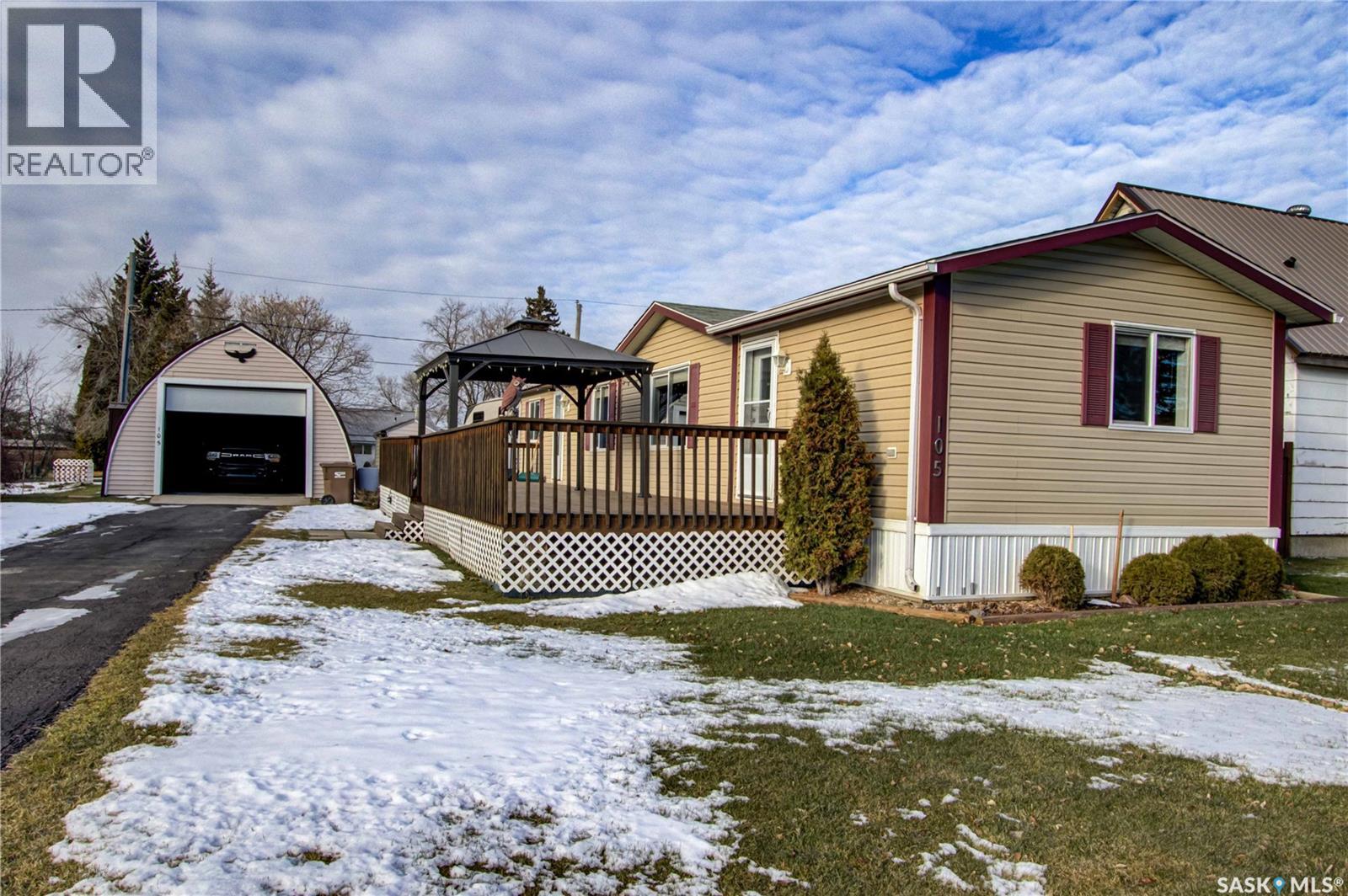 Welcome to Kinistino! This well-kept 970 sq ft modular home (built in 2010) offers affordable, comfortable living in a quiet and friendly community. With 2 bedrooms and 2 bathrooms, this home is an ideal fit for first-time buyers, retirees, or anyone seeking low-maintenance living on a peaceful dead-end street. Step inside to find a bright, clean, and meticulously maintained interior. Fridge and stove new in 2024, dishwasher and dryer in 2020. The functional layout provides great flow, ample natural light, and comfortable living spaces. Outside, enjoy summer evenings on the large west-facing 500 sq ft deck, complete with a gazebo—perfect for relaxing and entertaining. A 588 sq ft Quonset-style detached garage provides sheltered parking or a spacious workshop area. The paved driveway offers plenty of additional parking, while back alley access allows room to park an RV, boat, or other toys with ease. Located in the quiet community of Kinistino, known for its agricultural roots and home to several farm equipment dealerships, this town offers excellent local amenities including a K–12 school, gas station, grocery store, nursing home, health clinic, hockey rink, and more. Conveniently situated on Highway 3 between Melfort and Prince Albert, commuting is simple. If you're looking for comfort, convenience, and small-town charm, this property is ready to welcome you home. (29137047)