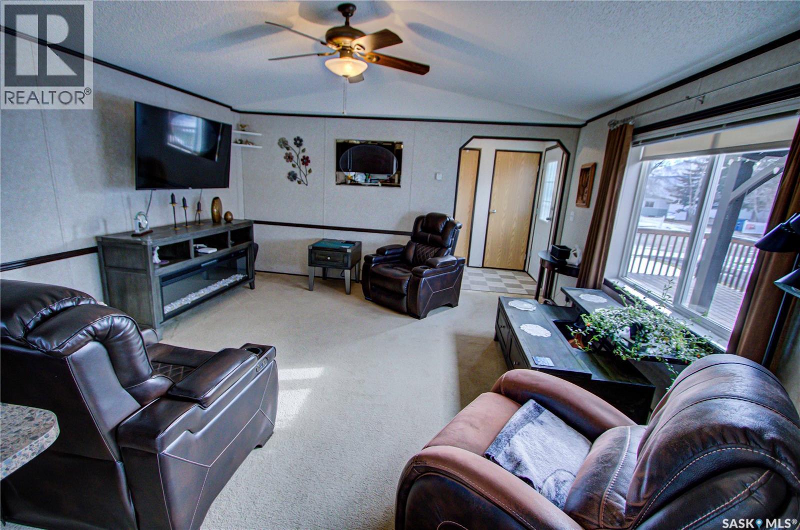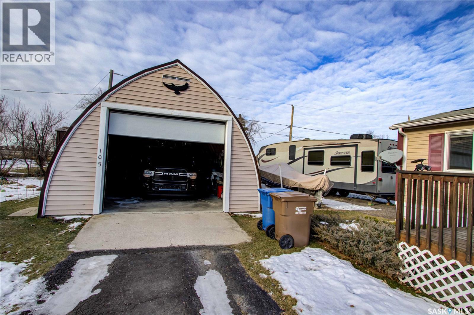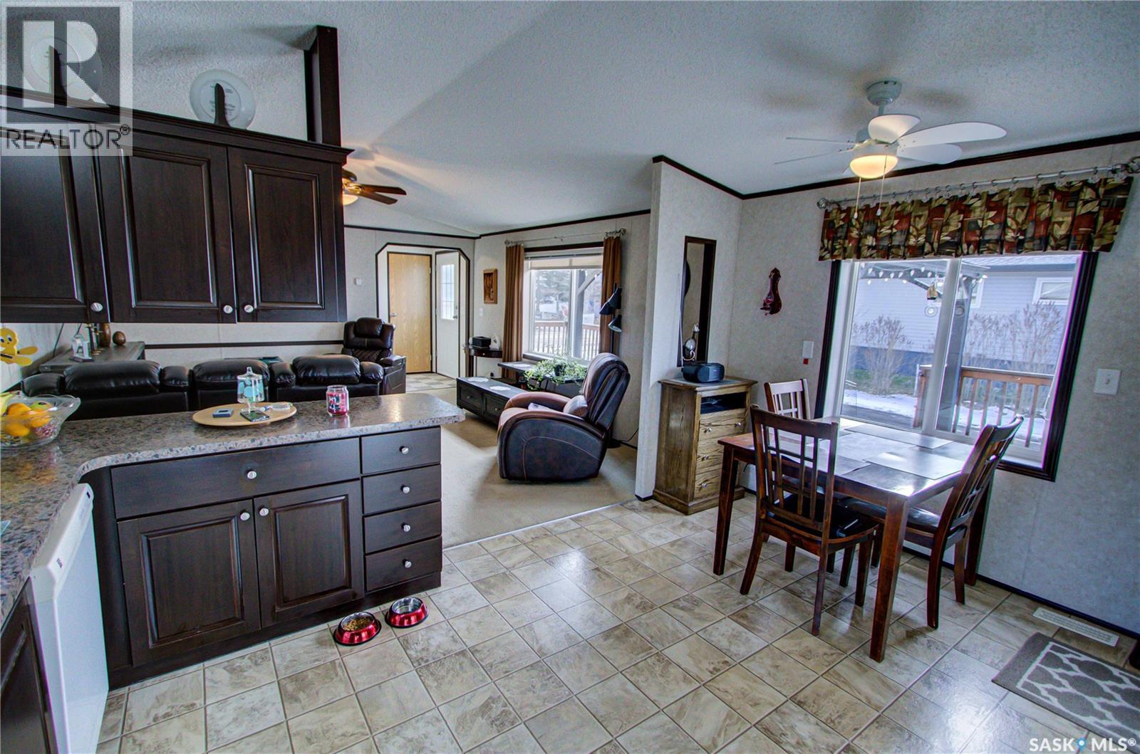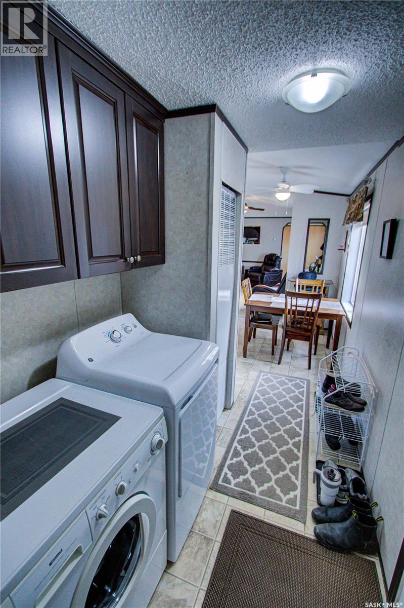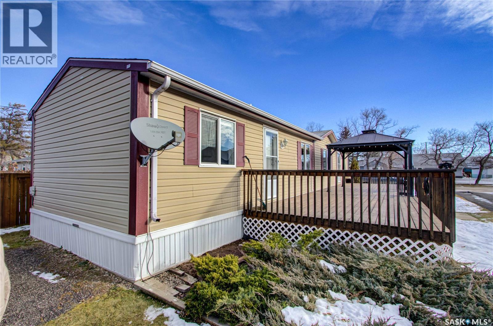 Welcome to Kinistino! This well-kept 970 sq ft modular home (built in 2010) offers affordable, comfortable living in a quiet and friendly community. With 2 bedrooms and 2 bathrooms, this home is an ideal fit for first-time buyers, retirees, or anyone seeking low-maintenance living on a peaceful dead-end street. Step inside to find a bright, clean, and meticulously maintained interior. Fridge and stove new in 2024, dishwasher and dryer in 2020. The functional layout provides great flow, ample natural light, and comfortable living spaces. Outside, enjoy summer evenings on the large west-facing 500 sq ft deck, complete with a gazebo—perfect for relaxing and entertaining. A 588 sq ft Quonset-style detached garage provides sheltered parking or a spacious workshop area. The paved driveway offers plenty of additional parking, while back alley access allows room to park an RV, boat, or other toys with ease. Located in the quiet community of Kinistino, known for its agricultural roots and home to several farm equipment dealerships, this town offers excellent local amenities including a K–12 school, gas station, grocery store, nursing home, health clinic, hockey rink, and more. Conveniently situated on Highway 3 between Melfort and Prince Albert, commuting is simple. If you're looking for comfort, convenience, and small-town charm, this property is ready to welcome you home. (29137047)
