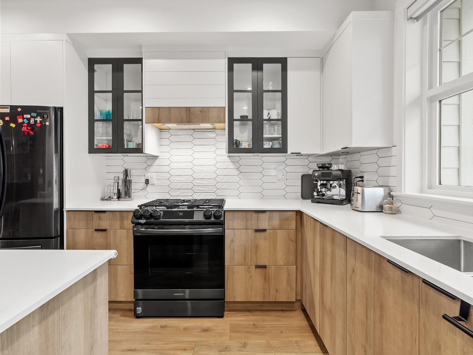 DON'T MISS THIS ONE! This upgraded 3-bedroom + flex (optional 4th bedroom), 3-bath townhome delivers exceptional comfort and convenience throughout. Enjoy full smart-home integration, centralized A/C, a smart thermostat, motorized blinds, and a chef-style kitchen equipped with premium smart appliances. Two outdoor spaces-including one with a BBQ hookup-plus a double side-by-side garage with epoxy flooring and an EV charger truly elevate the home. Oversized king-capacity laundry machines, custom feature walls, and a top-tier location steps from Semiahmoo Trail Elementary, École Elgin Park Secondary, parks, trails, and major routes make this the perfect family retreat. Discover contemporary living at its finest in the heart of South Surrey. (32182607)