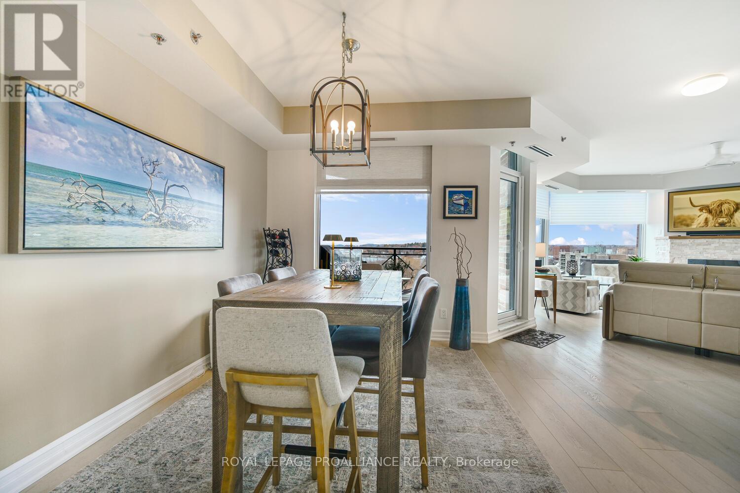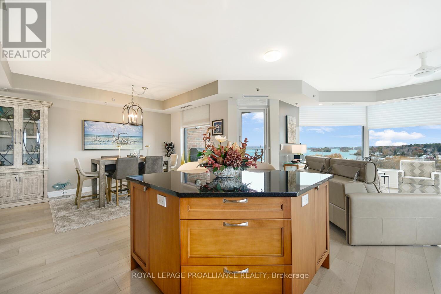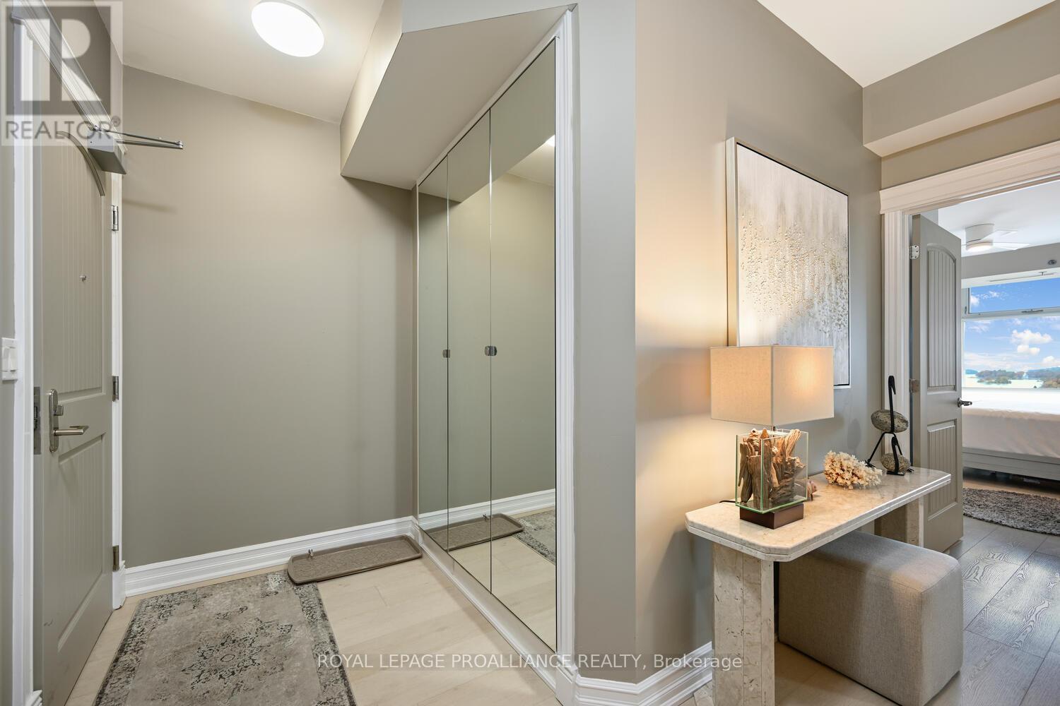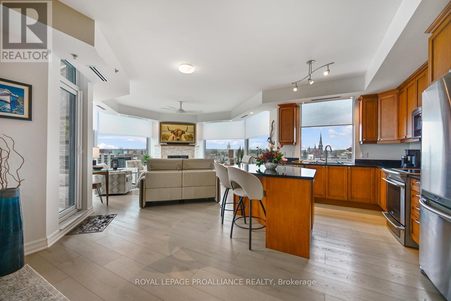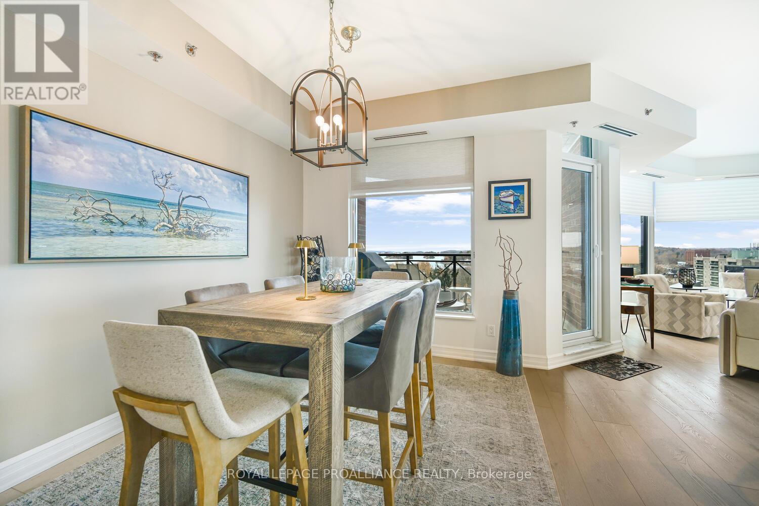 The stunning panoramic views from all windows in this tastefully appointed condo allow a pleasing outlook of the 1000 Islands and parkland to the west and cityscapes and the many church spires to the north. The current owner replaced all flooring and redecorated throughout when purchased from the original owner. Enjoy tasteful luxury vinyl plank throughout and cushion tile flooring in the baths. This "designer look" condo is freshly painted throughout in neutral colours. You will never tire of summer days and evenings on your private 105 sq ft balcony watching ocean going ships, lakers, private yachts and endless riverfront activity. Meet fellow residents or friends at the in building restaurant or cafe. Enjoy a game of pool in the party room, keep fit exercising in the work out room or swimming in the heated indoor pool. An extensive waterfront deck expands across the perimeter of the building providing multiple sitting areas, outdoor shuffle board, wonderful for socializing. When you live at the "Tall Ships" you are not just buying a beautiful, contemporary home but also a great, carefree lifestyle. Book your showing soon. Seller can accommodate a quick closing. (41680280)