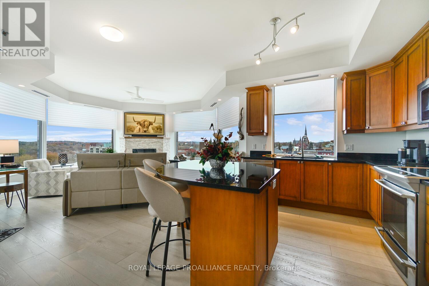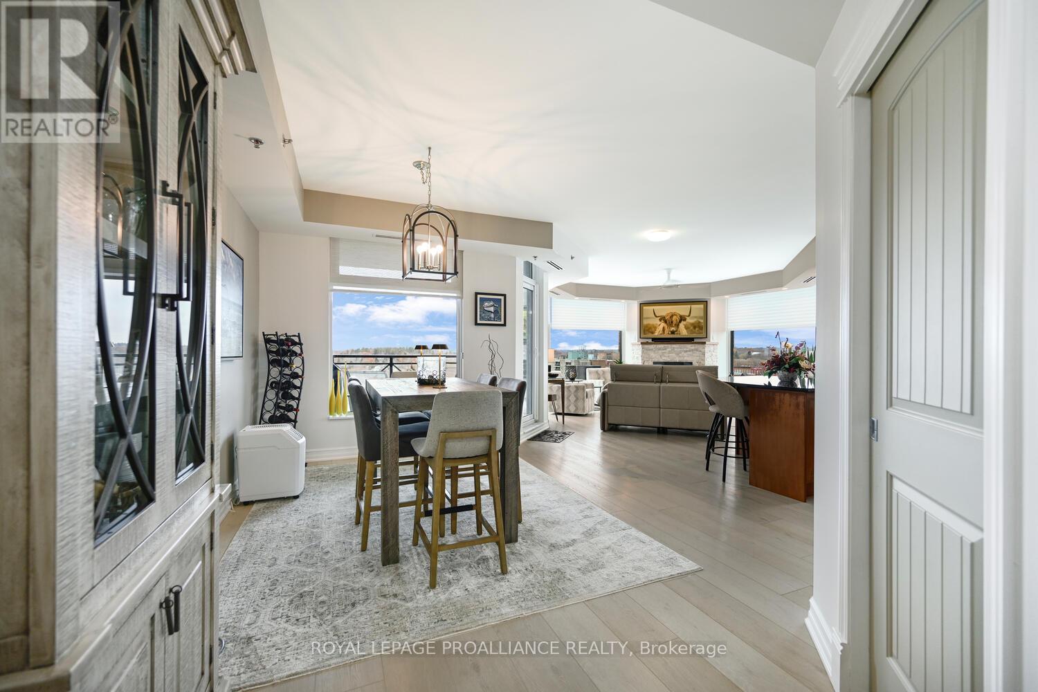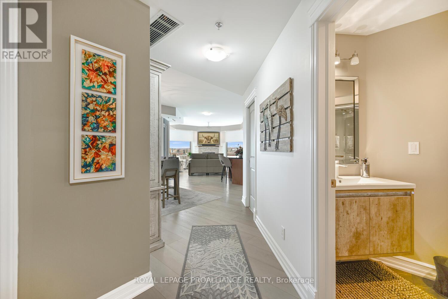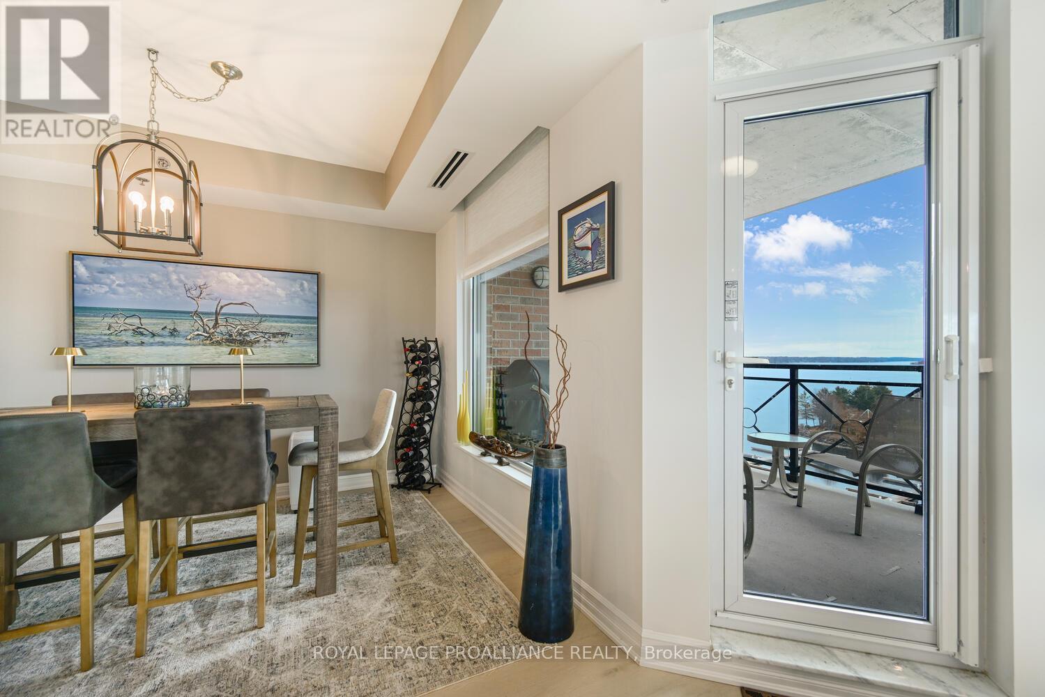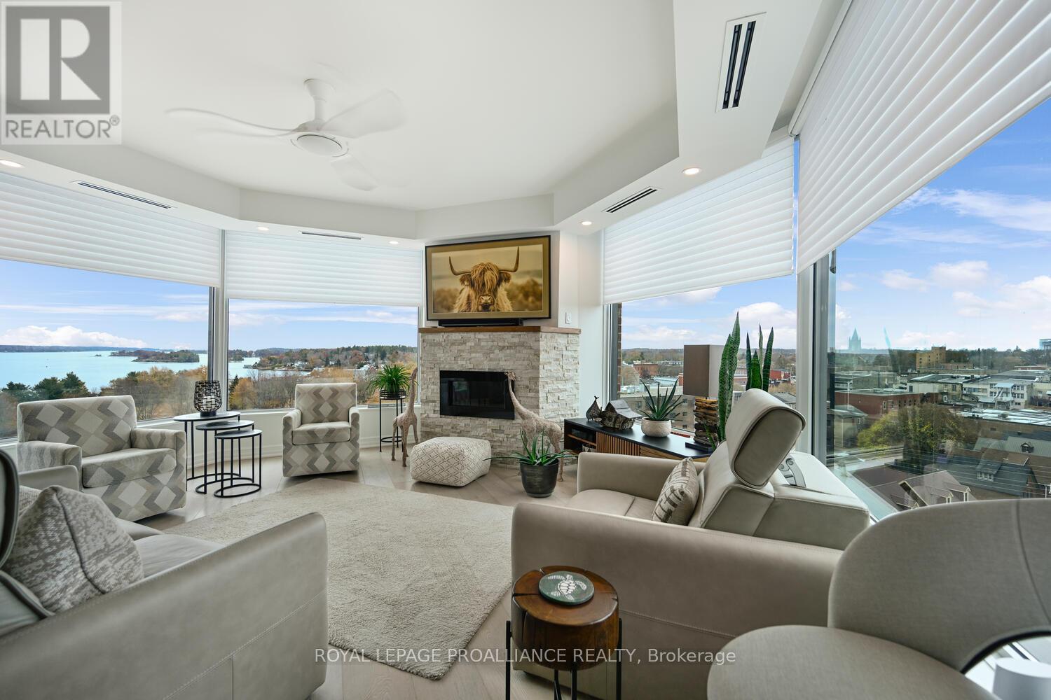 The stunning panoramic views from all windows in this tastefully appointed condo allow a pleasing outlook of the 1000 Islands and parkland to the west and cityscapes and the many church spires to the north. The current owner replaced all flooring and redecorated throughout when purchased from the original owner. Enjoy tasteful luxury vinyl plank throughout and cushion tile flooring in the baths. This "designer look" condo is freshly painted throughout in neutral colours. You will never tire of summer days and evenings on your private 105 sq ft balcony watching ocean going ships, lakers, private yachts and endless riverfront activity. Meet fellow residents or friends at the in building restaurant or cafe. Enjoy a game of pool in the party room, keep fit exercising in the work out room or swimming in the heated indoor pool. An extensive waterfront deck expands across the perimeter of the building providing multiple sitting areas, outdoor shuffle board, wonderful for socializing. When you live at the "Tall Ships" you are not just buying a beautiful, contemporary home but also a great, carefree lifestyle. Book your showing soon. Seller can accommodate a quick closing. (41680280)