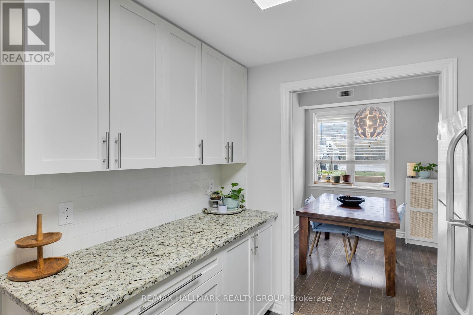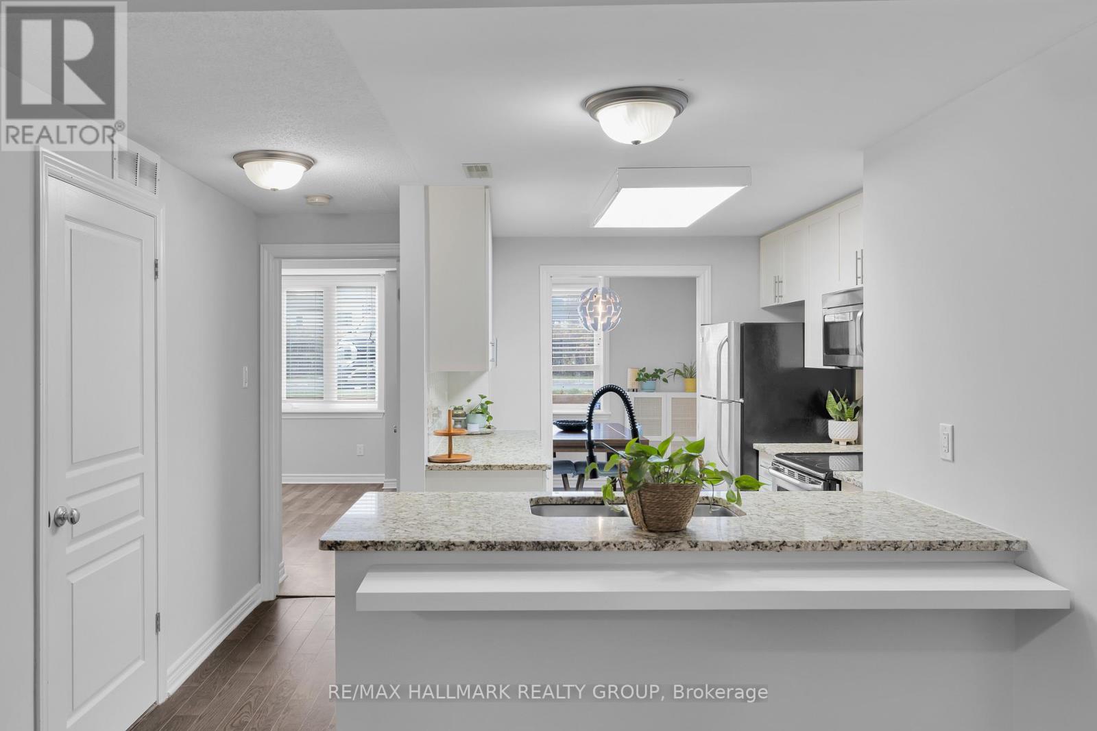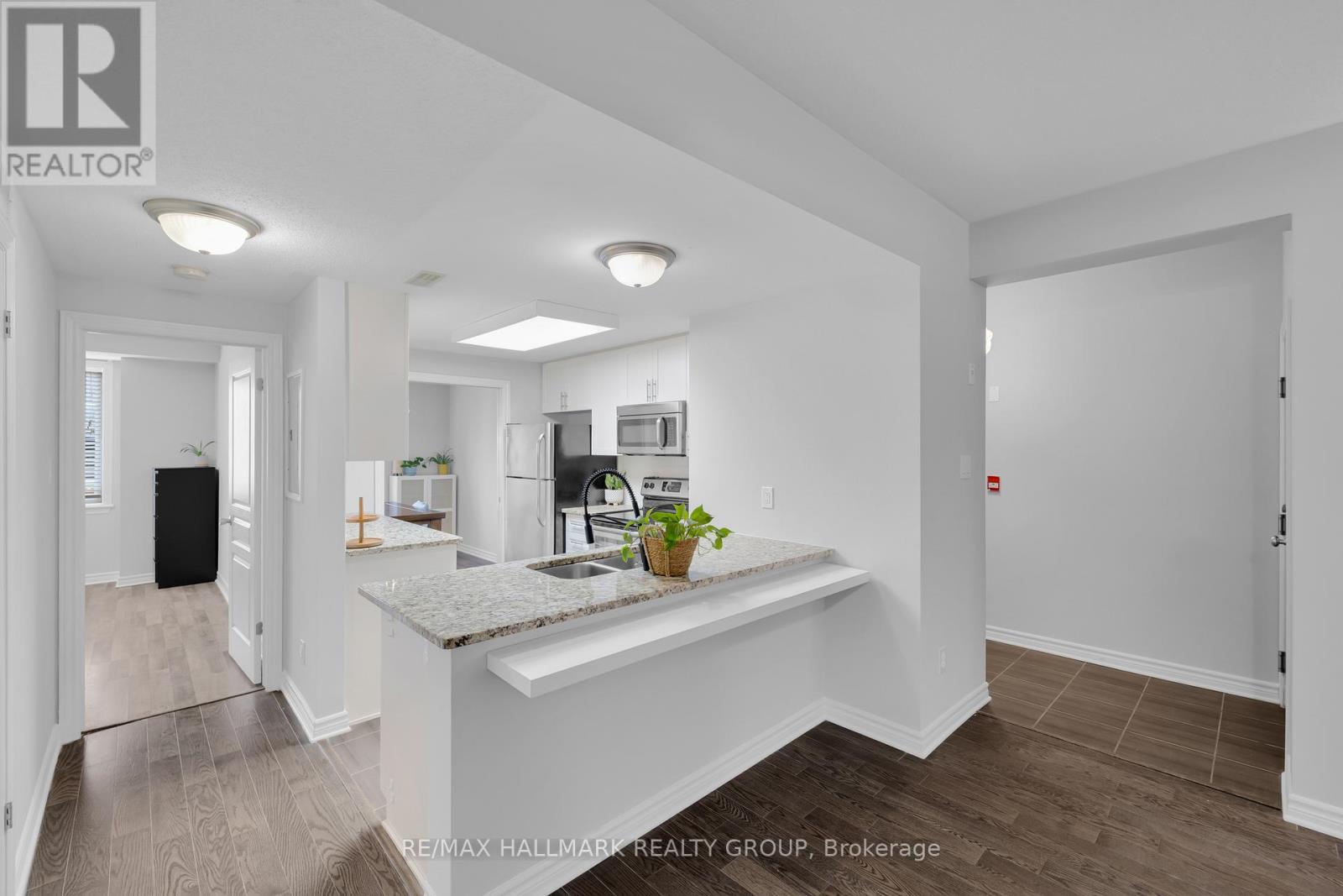 Bright and spacious, this 2-bedroom, 2-bath walk-out condo with 9' ceilings is located in the popular Riverside South community. Offering roughly 1,200 sq. ft. of living space by Richcraft, it features hardwood in the living and dining rooms and ceramic tile in the kitchen, entry, and bathrooms. The living room opens onto a private terrace-providing a second entrance to the unit - while the kitchen includes a breakfast bar and floor-to-ceiling cabinets for plenty of storage. The two bedrooms are located on opposite sides of the condo, giving each added privacy. The primary bedroom is generously sized and includes a walk-in closet and its own ensuite. The second bedroom sits next to a full main bath, making it ideal for guests, family, or a home office. As a ground-floor unit, you also get the convenience of a separate private entrance through the terrace. Close to walking trails, public transit, schools, shops, parks, and the future LRT, this home is a great option for first-time buyers and investors alike. One parking space is included (Spot #14A). (41683943)