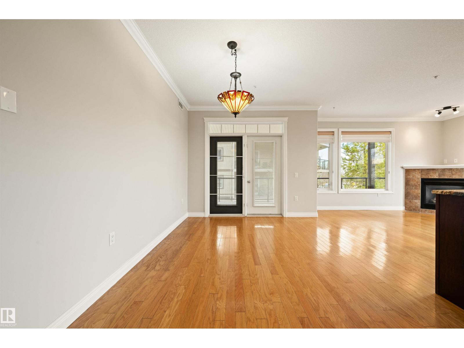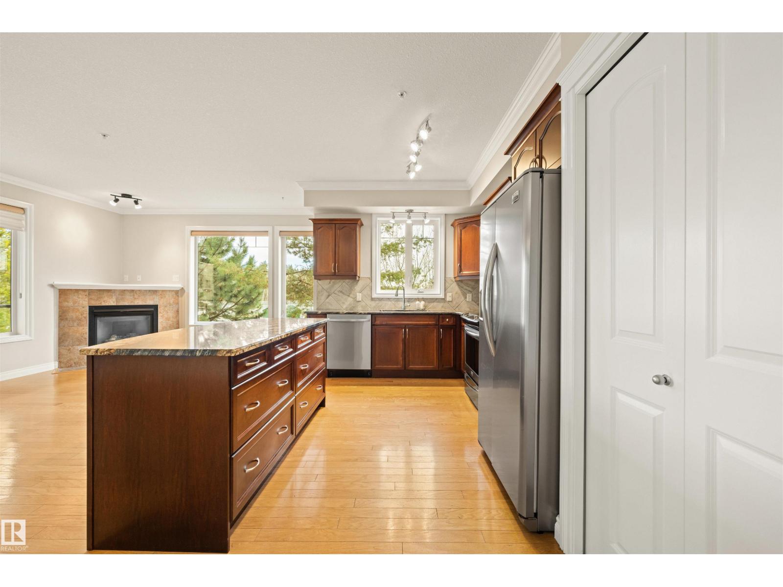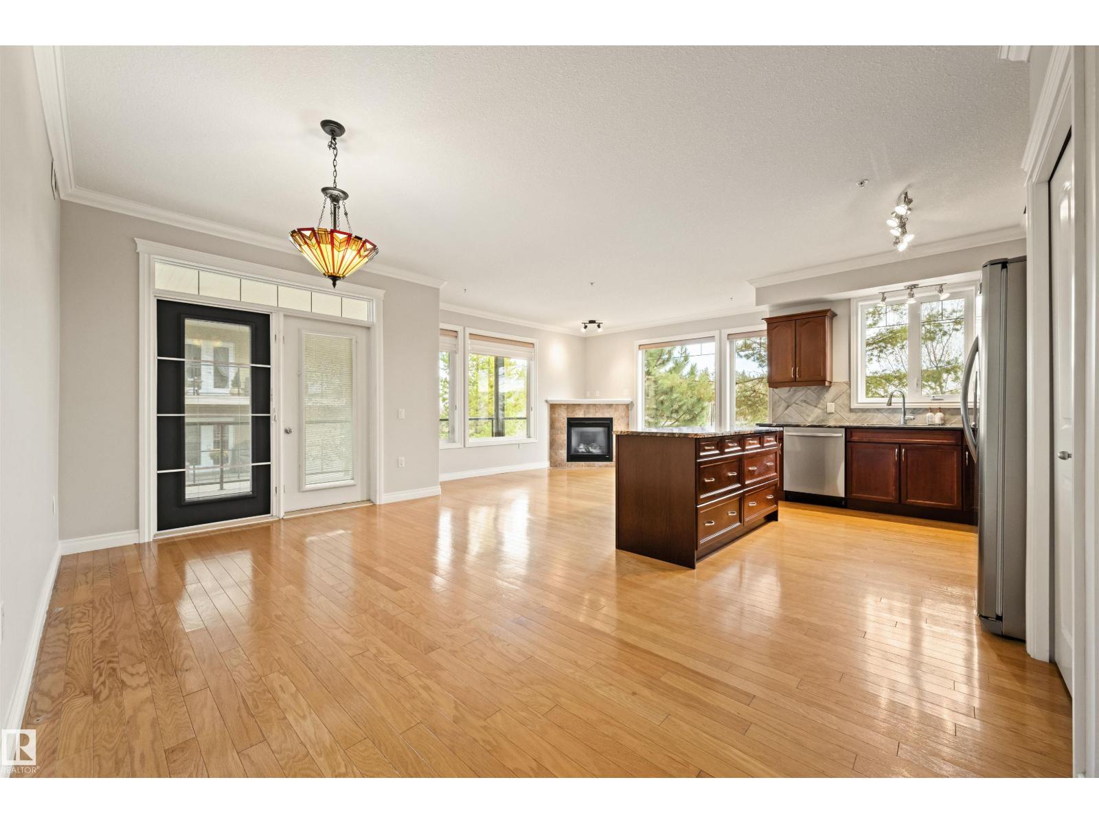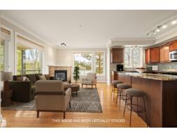 Welcome to this sophisticated and highly coveted corner unit with central A/C in this adult (18+) condo building. A stylish, private foyer welcomes you into the elegant dining area and open-concept layout. New luxury hardwood flooring flows throughout the space. The bright kitchen features stainless steel appliances, a pantry, and an island, while 9' ceiling and large windows flood the living room with natural light and frame the cozy natural gas fireplace. The spacious primary bedroom includes a walk-in closet and full ensuite. A second bedroom sits conveniently beside the main 4 piece bath. You’ll also love the generous laundry room, dedicated office space/flex room, and the huge balcony—perfect for hosting guests. Comes with a titled underground parking stall and underground storage locker. Enjoy exceptional amenities: gym, sauna, steam room, social/games room, guest suite, bike room, and car wash. This building is also pet-friendly! (33596105)
