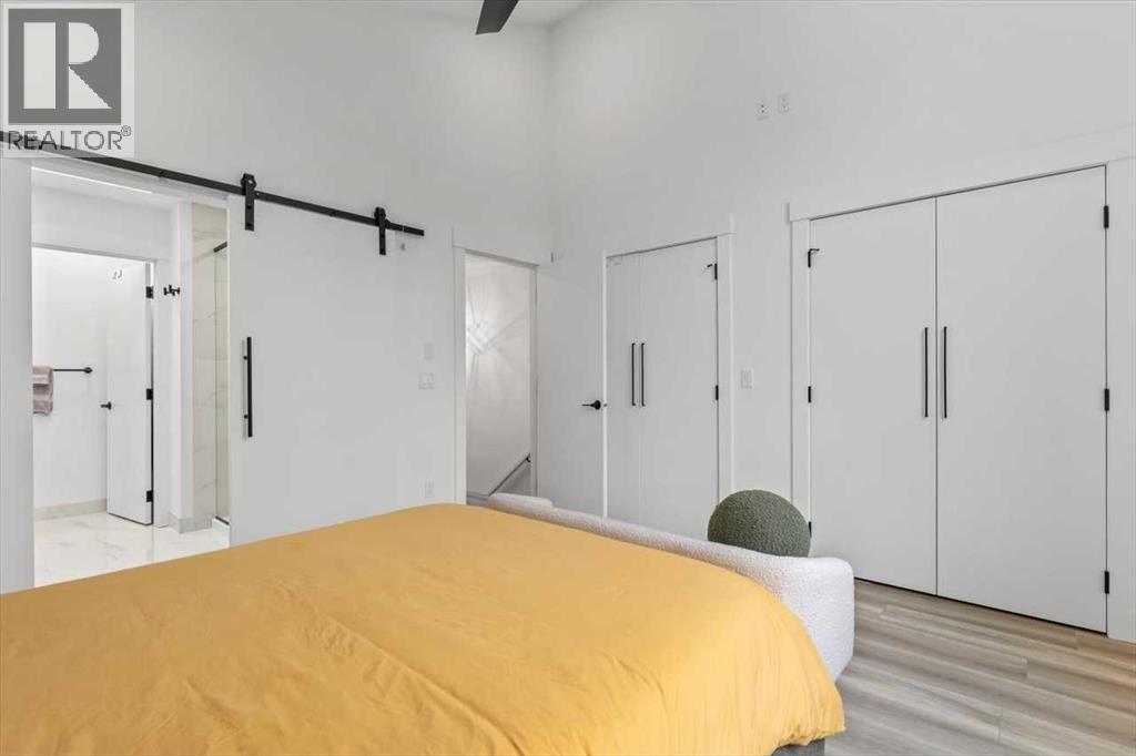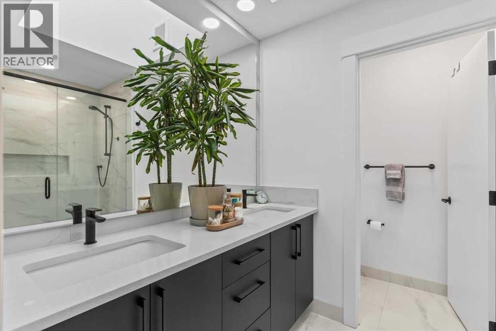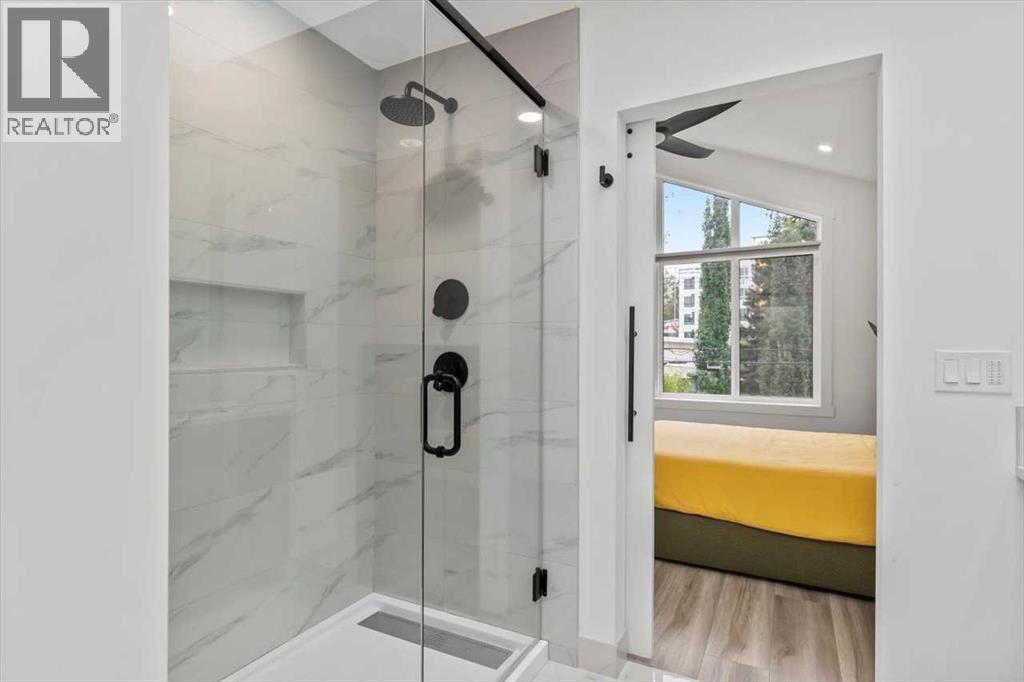 Welcome to this Immaculate and thoughtfully designed town home in the heart of Marda Loop, over 1,700 sq ft of living space, just minutes away from downtown. Features superior party wall system between units. Main floor showcases 11 ft ceiling, open concept layout, vinyl plank flooring, designer built entry unit. The living room is spacious featuring a wall unit, sleek tile, and a Bluetooth enabled electric fireplace. The kitchen is equally impressive, boasting a large island with quartz counter top, ideal for entertaining, ample soft- close cabinetry, stainless steel appliances. The large south facing sliding door brings in rays of sunshine and light through out the day, tastefully covered with Hunter Douglas honeycomb shades and floor to ceiling blackout drapes for privacy professionally installed by Normandeau, overlookimg a fenced, cozy yard leading to a single detached garage.This floor is completed by a spacious guest half bath. Upstairs, the primary bedroom is a true retreat, with vaulted ceilings, double door his and hers closets, large windows with professionally installed electric blackout honeycomb shades. The barn door leads into a spa-like en-suite with heated flooring, double sink vanity, quartz counters, skylight, oversized tiled shower and dual shower heads. The second large bedroom also has it's own en-suite and skylight, plus manual honeycomb shades. The fully finished basement boasts a bright family/ flex room. A third spacious bedroom with a walk-in closet and a full bath. THIS HOME COMES WITH COUNTLESS UPGRADES- A/C, high efficiency furnace, humidifier, thankless hot water on demand, radon extraction sump pump, built-in speaker system, light dimmers in master bedroom, smart thermostat (ecobee), bathroom fan timers, kitchen and master bedroom lights can be manged through smartphone. This exceptional home offers the best of urban living in an ideal location. This is the one you have been waiting for. Book a showing today. (31403781)