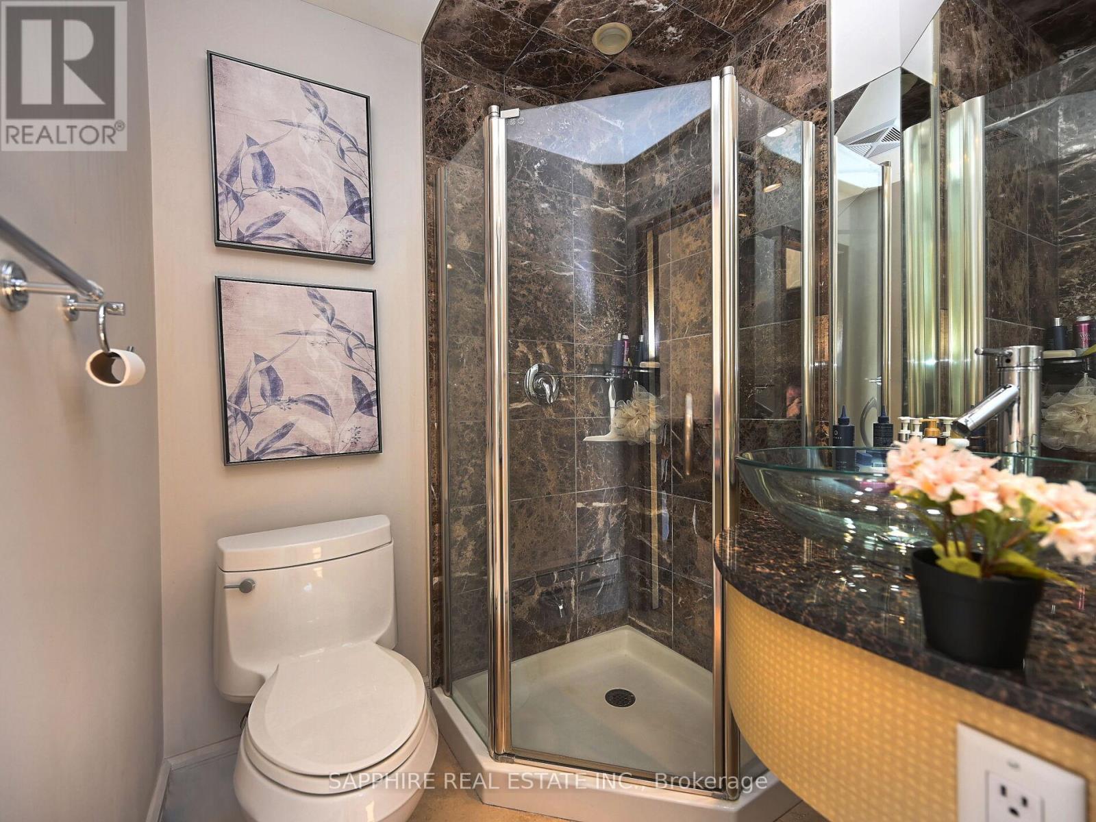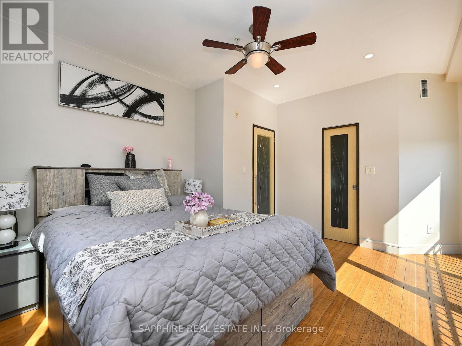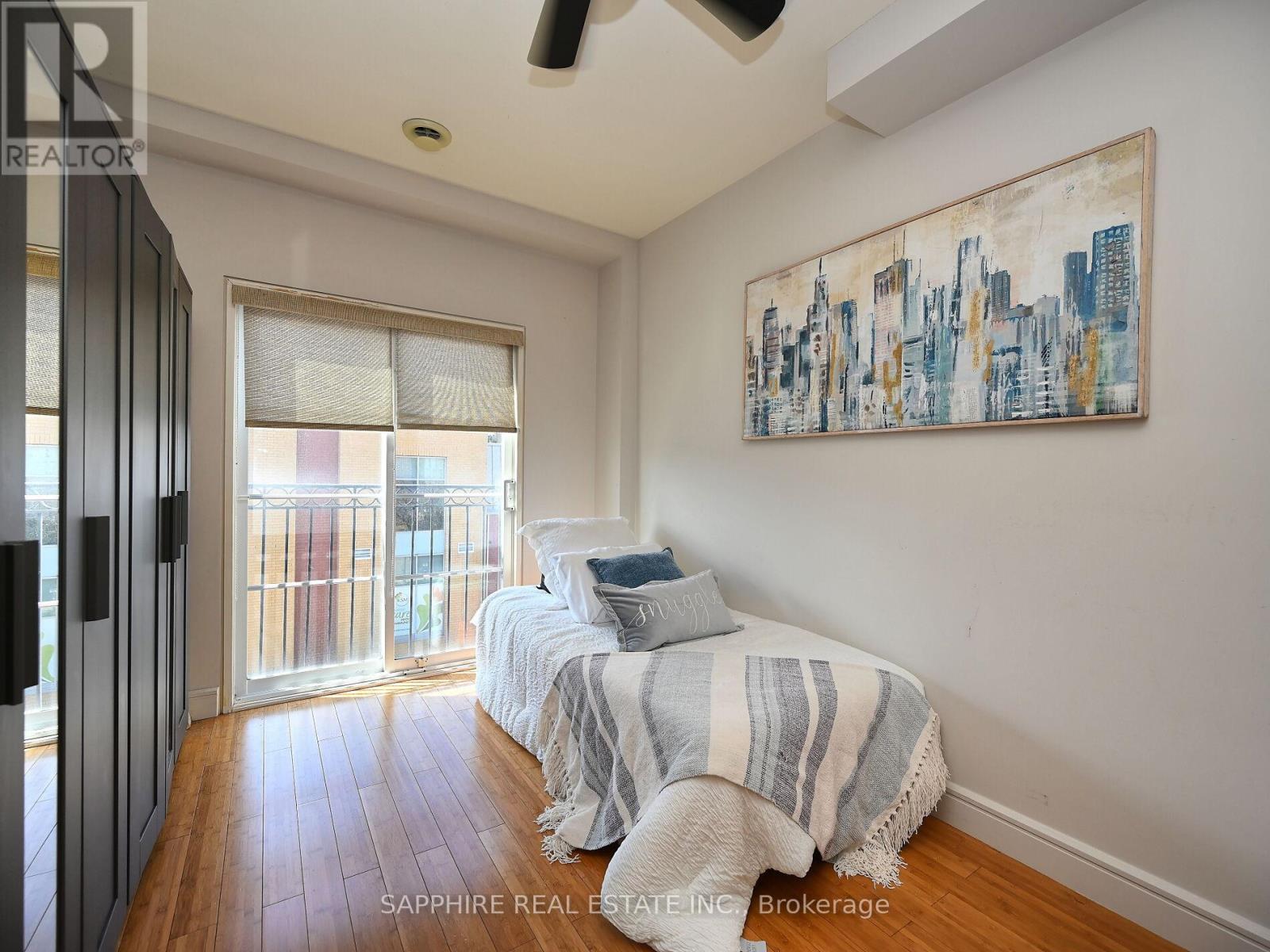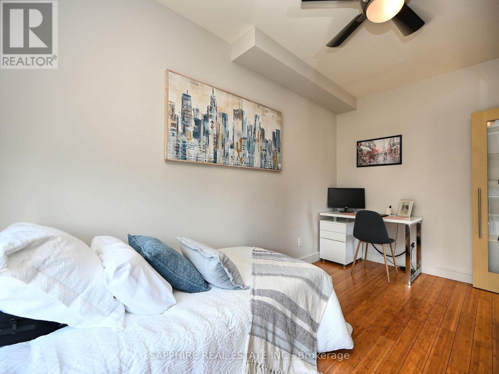 Welcome to Kerr Studios, a boutique-style condo community nestled in the heart of vibrant Kerr Village. This meticulously maintained 2-bedroom, 2-bathroom suite offers 900 sq.ft. of bright, open-concept living with ideal bedroom separation each with its own full bathroom perfect for shared living or guests. Overlooking the tranquil, east-facing rear of the building, the unit features high-end bamboo hardwood floors with cork underpadding, granite counters, and a thoughtfully upgraded kitchen boasting 23 drawers, glass cabinetry, a centre island, a European-style brushed steel fridge, built-in cooktop and oven, and a drawer-style dishwasher. The spacious primary bedroom includes an ensuite bath and Juliette balcony. Enjoy smart pot lights, travertine flooring, modern bathrooms with granite walls and glass sinks, custom roller blinds, and large windows throughout. Includes S/S appliances, washer/dryer, window coverings, and one parking spot. Walk to cafes, shops, Oakwood Public School, Tannery Park, Trafalgar Park Community Centre, and the lake. Oakville GO and QEW are minutes away making this a commuters dream. Move-in ready, unpack and enjoy the best of Kerr Village living. (41704819)