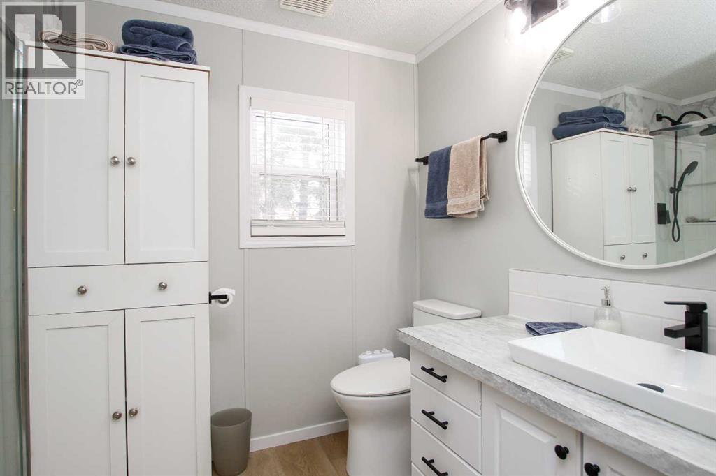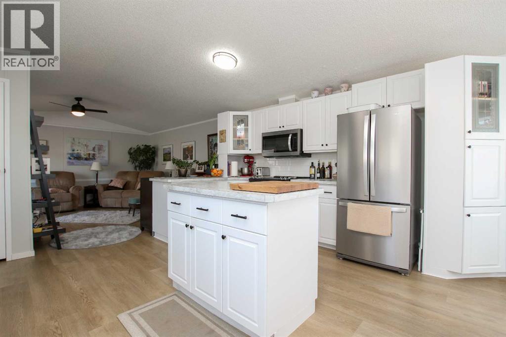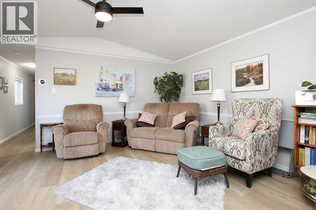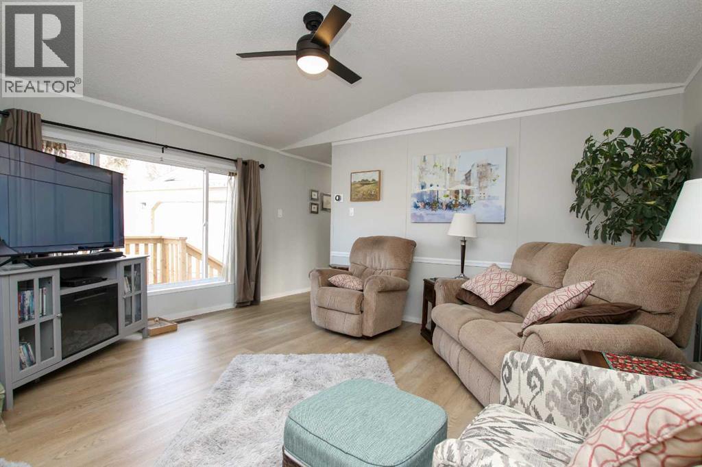 BEAUTIFULLY RENOVATED THROUGHOUT ~ 3 BEDROOMS, 2 BATHROOMS & A BONUS ROOM ~ HEATED DOUBLE ATTACHED GARAGE ~ Pride of ownership shines in this like-new home loaded with renovations including; new furnace, PEX plumbing, central air conditioning, vinyl plank flooring throughout, paint throughout, baseboards, bathrooms (toilets, sinks, faucets, tile, counter tops, shower & tub), kitchen (appliances, backsplash, faucet, sink, painted cabinets, countertops), LED lighting, ceiling fans, insulated overhead garage door, garage heater, bonus room heater, storm door, insulated skirting, heat tape and gutter (completed in 2025), shingles, 50 gallon hot water tank (2020) ~ Open concept main floor layout complemented by vaulted ceilings, vinyl plank flooring and tons of natural light creating a feeling of spaciousness ~ The living room features large windows offering natural light and overlooking the deck ~ The updated kitchen offers tons of cabinet and counter space including a large island, full tile backsplash, window above the sink, brand new stainless steel appliances, wall pantry, and a separate entry with access to the large newly built deck ~ Easily host large gatherings in the dining room with a wall of floor to ceiling windows that fill the space with natural light ~ The primary bedroom can easily accommodate a king size bed plus furniture, has a spacious walk in closet, and a spa like ensuite featuring a walk in shower with a glass door ~ 2 additional bedrooms are separated by the 4 piece main bathroom ~ Conveniently located laundry is just off the bedrooms and has built in cabinets for storage ~ The large bonus room has vinyl plank flooring, high ceilings and offers tons of space and flexibility to suit your needs (home gym, office, media room, craft/hobby room) ~ Separate entry from the bonus room (w/new storm door) leads to the fully fenced backyard with a storage shed, raised garden beds, fruit trees, and a 16' x 12' patio with a gazebo, all backing onto mature tr ees ~ Heated double attached garage has built in shelving, and an extra large driveway offering tons of parking space (snow blower included with the sale) ~ Located in the 40+ section, with awesome neighbours, and easy access to the Clubhouse with regularly scheduled activities and events ~ Secure gated RV storage available ~ Monthly lot fees are $505.00 ~ Situated minutes south of Red Deer, this home offers unbeatable convenience with a walking trail to Gasoline Alley, where you'll find a wide range of amenities, including the popular Gasoline Alley Farmers' Market, Costco, Cineplex and transit to Red Deer, with easy access to highway 2, making it an ideal location for families and commuters alike ~ Move in Ready! (31406568)
