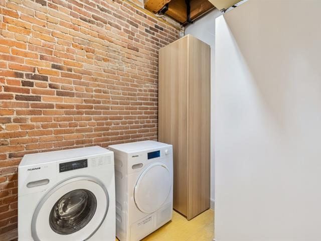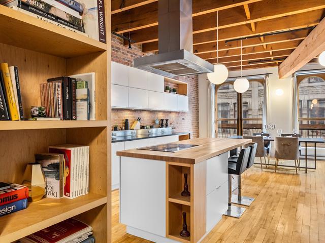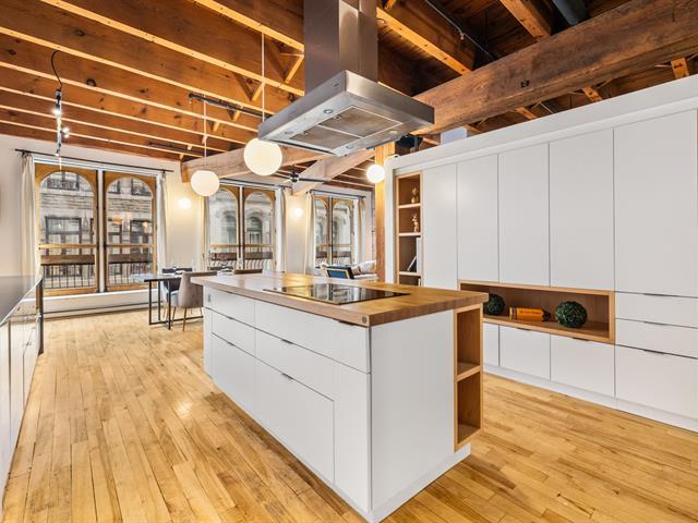 Discover this stunning modern condo featuring an industrial-chic design, located in one of Old Montreal's most sought-after historic buildings. With two bedrooms,and beautiful wooden beam ceilings, this unit blends the area's heritage charm with contemporary comfort. The main living area offers a spacious open-concept layout combining the living room, dining room, and kitchen -- perfect for everyday living or entertaining guests. The sleek, modern kitchen is bathed in natural light and features high-end finishes, ample built-in storage, and a large central island ideal for cooking or hosting. (47974103)