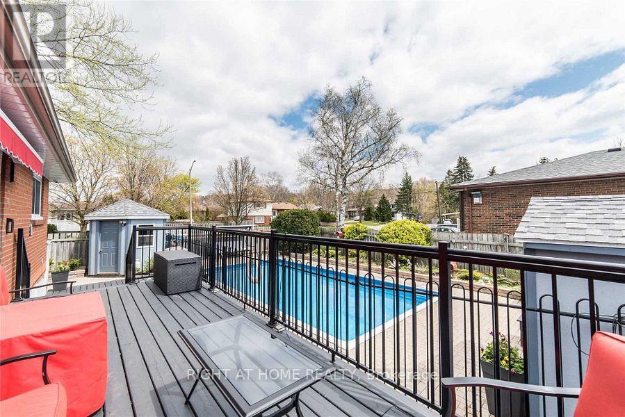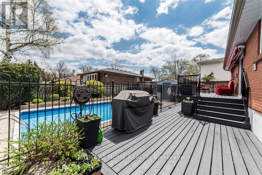 Pride of ownership on a quiet, tree-lined street in highly sought-after Donevan. This bright raised bungalow offers 3+2 bedrooms, 2 baths and a functional layout with hardwood floors on the main level. Updated eat-in kitchen with upgraded counters and stainless steel appliances opens to a warm living room with large picture window. Finished lower level with above-grade windows, 2 additional bedrooms, spacious rec room with fireplace and workshop - ideal for extended family, home office or hobby space. Step outside to your entertainer's backyard with inground pool, 2-tier deck and covered awning - perfect for summer BBQs and gatherings. Private driveway fits 4 cars. Close to schools, parks, transit, 401 and all amenities. A move-in ready home with a fantastic family lifestyle. (41728436)