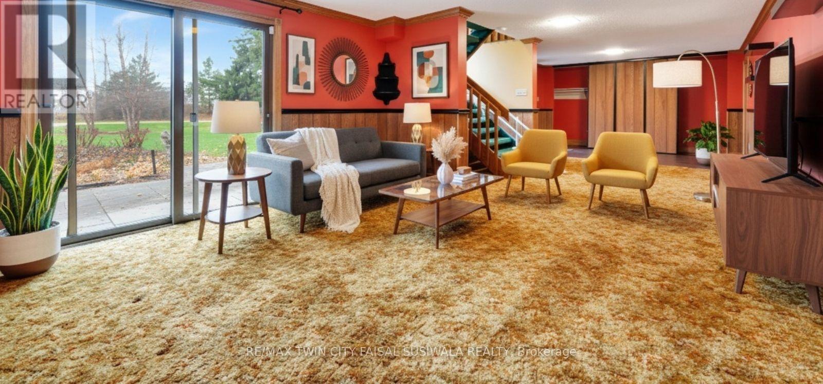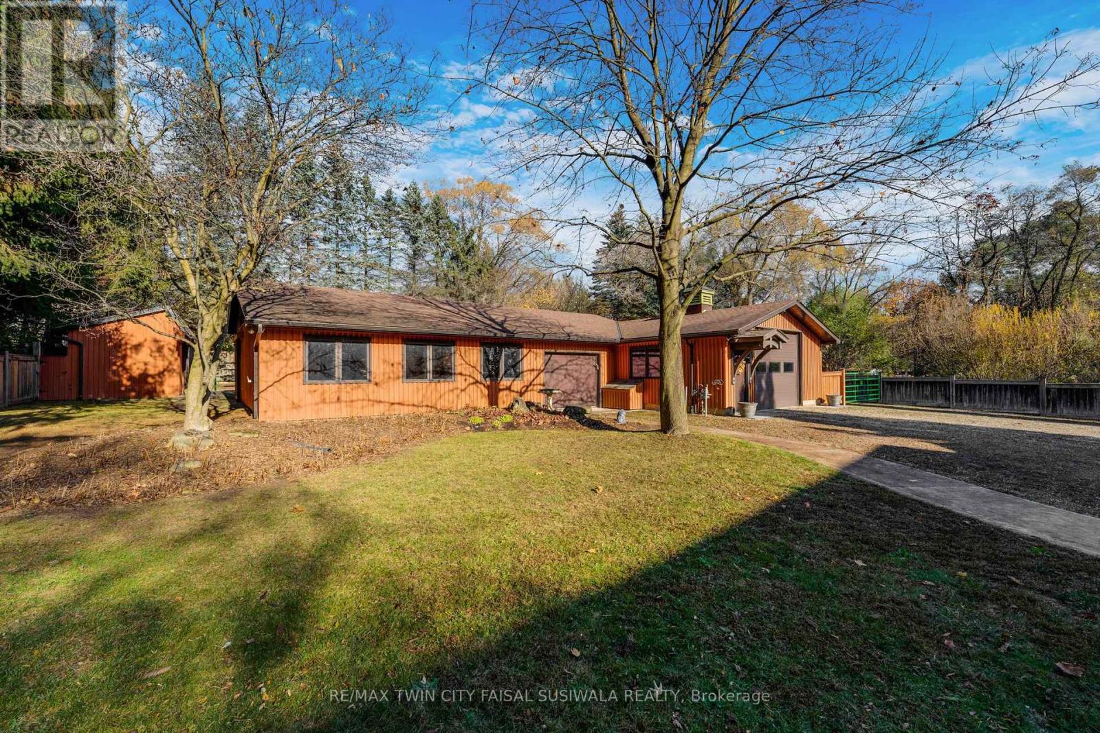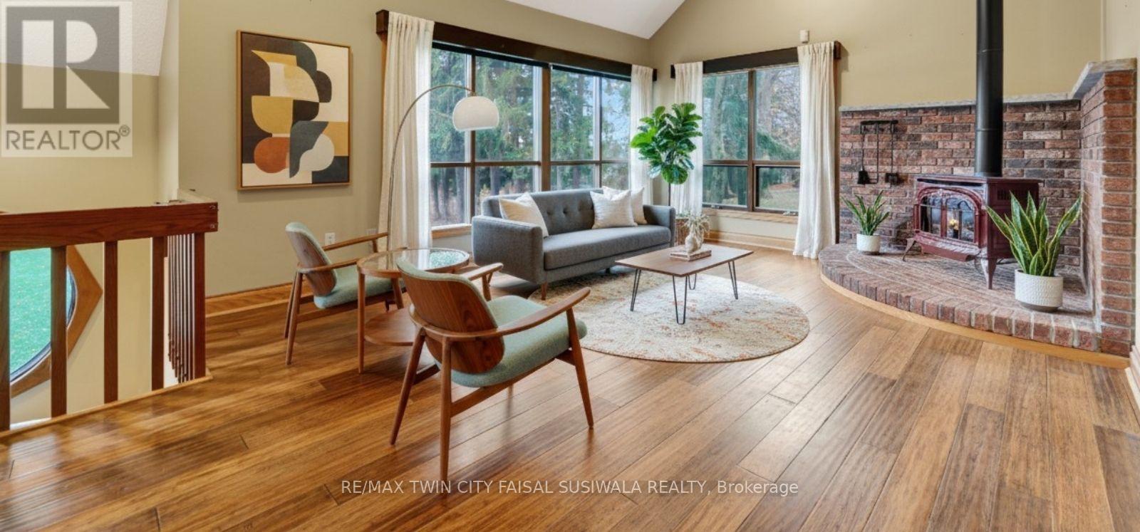 A PRIVATE ARCHITECTURAL RETREAT ON .75 ACRES - 106 ROYAL OAK ROAD, CAMBRIDGE, Tucked quietly among towering evergreens and glowing autumn maples, this architecturally distinct home feels like its own world-warm, welcoming, and wonderfully unexpected. Set on three-quarters of an acre, this 3-bedroom, 2-bath property blends mid-century lines with cottage-country serenity, offering over 2,600 sq. ft. of finished living space across all levels, plus a dream detached workshop approx 2200sqft for hobbyists, collectors, or creatives. Step inside the unique lower-level entry, where large windows and a walkout flood the family room with light and views of the surrounding landscape. Upstairs, the main living area feels like a treehouse-wrapped in windows, warmed by natural wood, and anchored by a beautiful brick hearth. A cozy gas fireplace, bold retro palette, and open flow create an inviting space for gatherings, movie nights, or quiet mornings with coffee and the sound of the trees. The elevated dining and kitchen space overlooks the yard and opens to a covered back porch, the perfect spot for long summer dinners, rainy-day reading, or evening chats under the string lights. The expansive primary bedroom offers a peaceful escape with skylights, surrounding windows, a built-in bookcase and natural views in every direction. Two additional bedrooms and two full bathrooms-including an accessible bath with a roll-in shower. Outside, the property stretches wide with stone walkways, mature trees, and endless room to breathe. At the end of the long private driveway sits a detached heated triple garage/workshop with a wood stove and furnace, ideal for parking, projects, storage, or the ultimate hobby sanctuary. There is a bonus 10x24 storage garage with 2 large roller doors. A property like this is hard to categorize-it's part retreat, part architectural gem, part everyday family home. And that's exactly what makes it so special. Virtually Staged. (41736002)