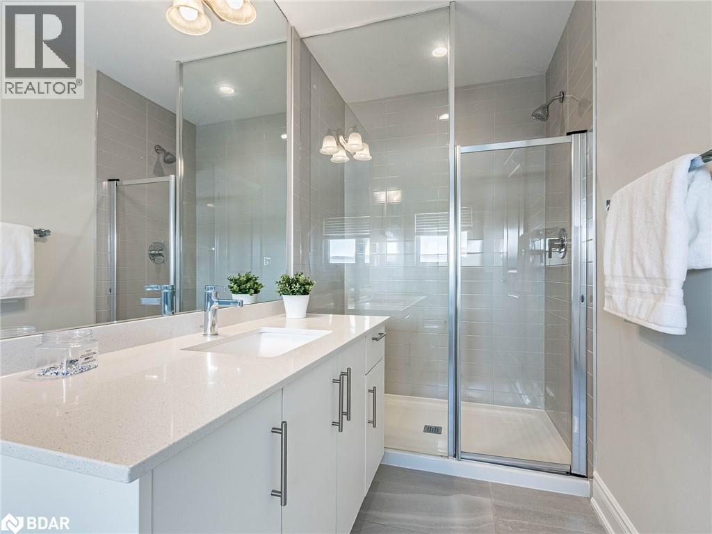 Full bath featuring a stall shower, vanity, and a chandelier